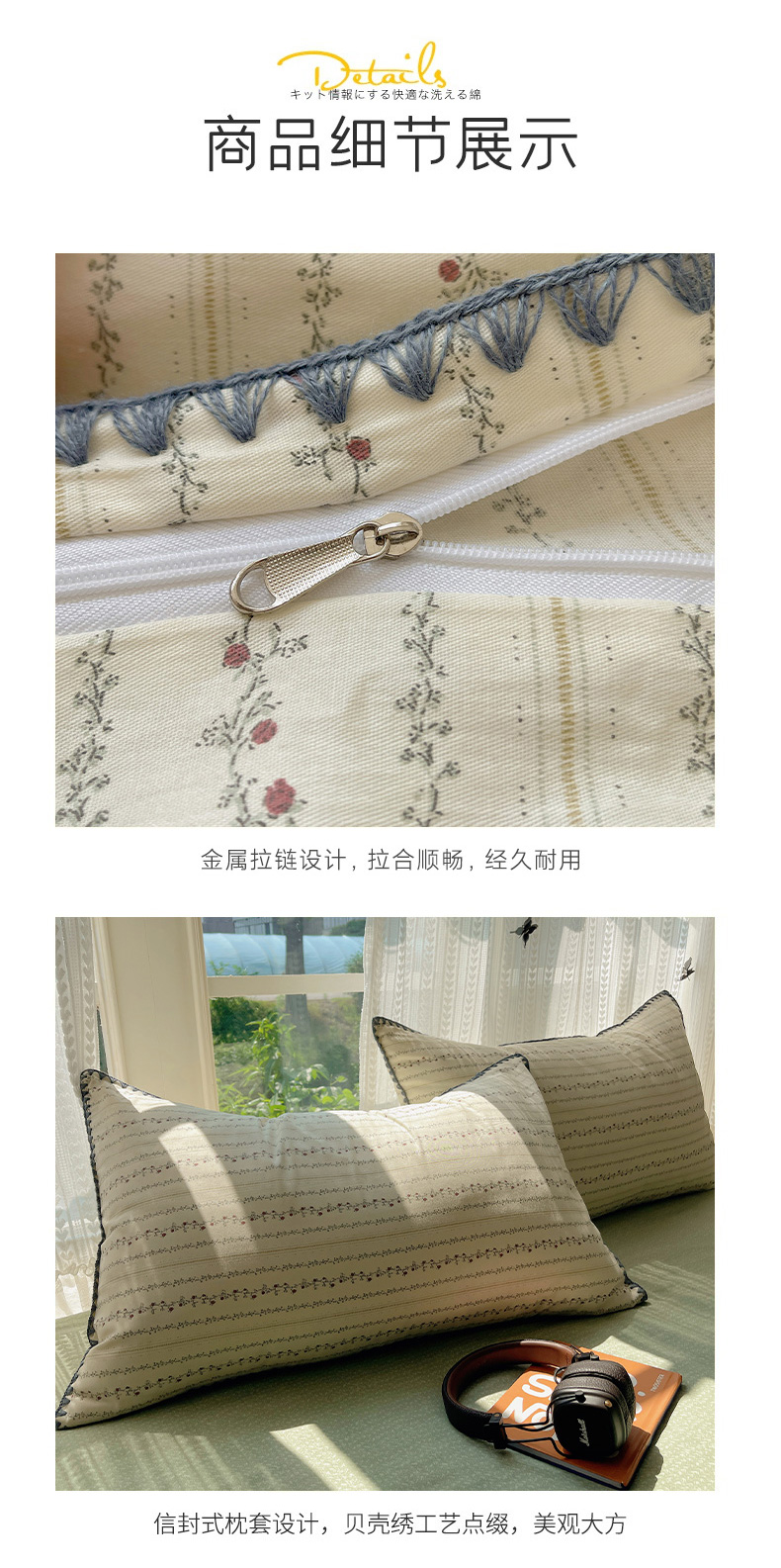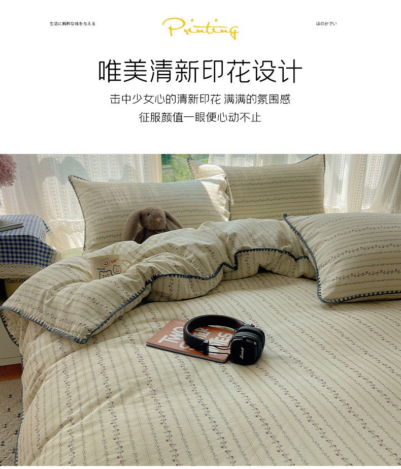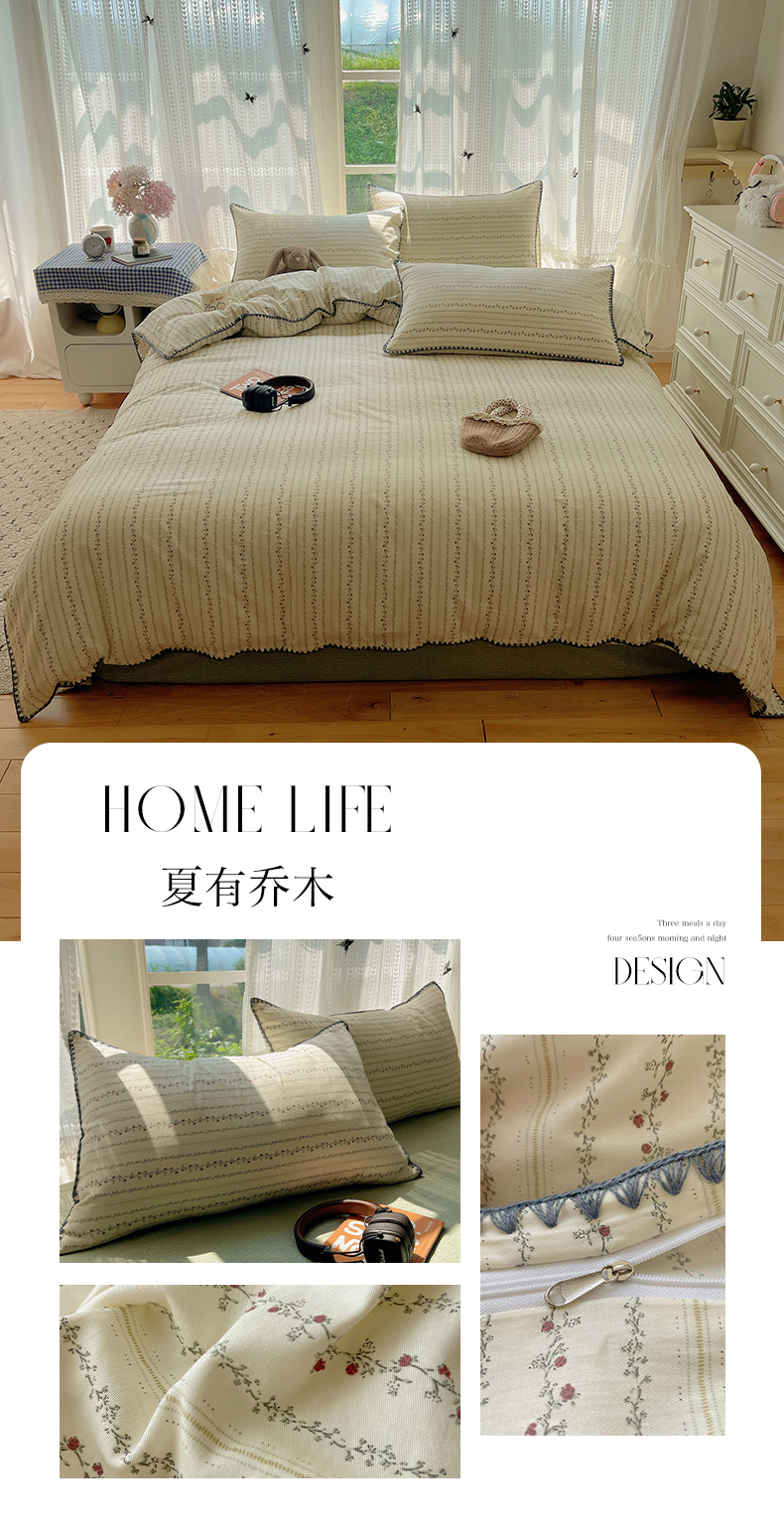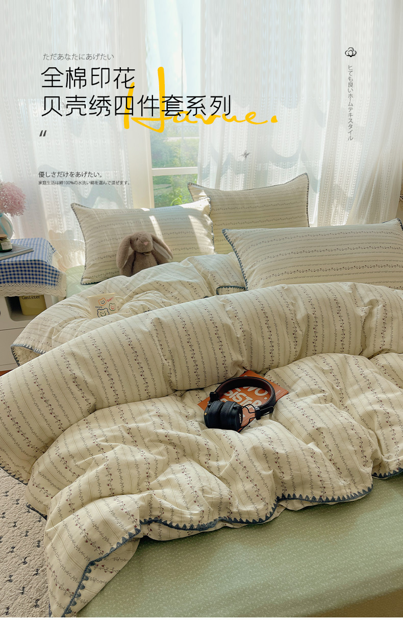 商品名称:瑞莱 2025开学季全棉印花贝壳边四件套 夏有乔木