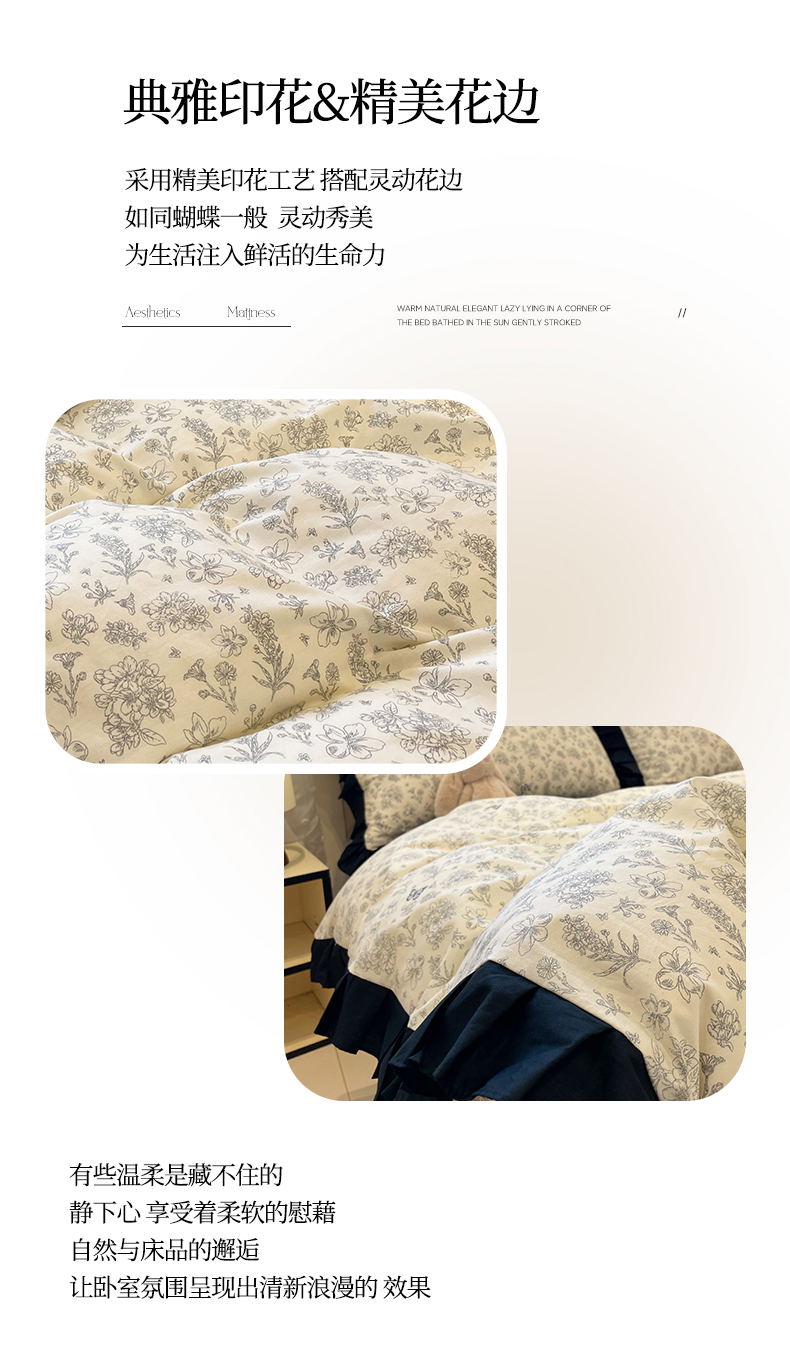 当前位置: 91家纺网 > 商品网购 > 床品套件 > 四件套 > 全棉普通四件套 > 羚羊语家纺 2025秋冬新款复古小清新花边款40支全棉纯棉轻法式13372小清新喷气印花 椿庭序