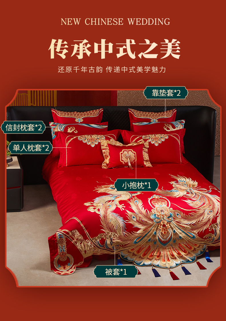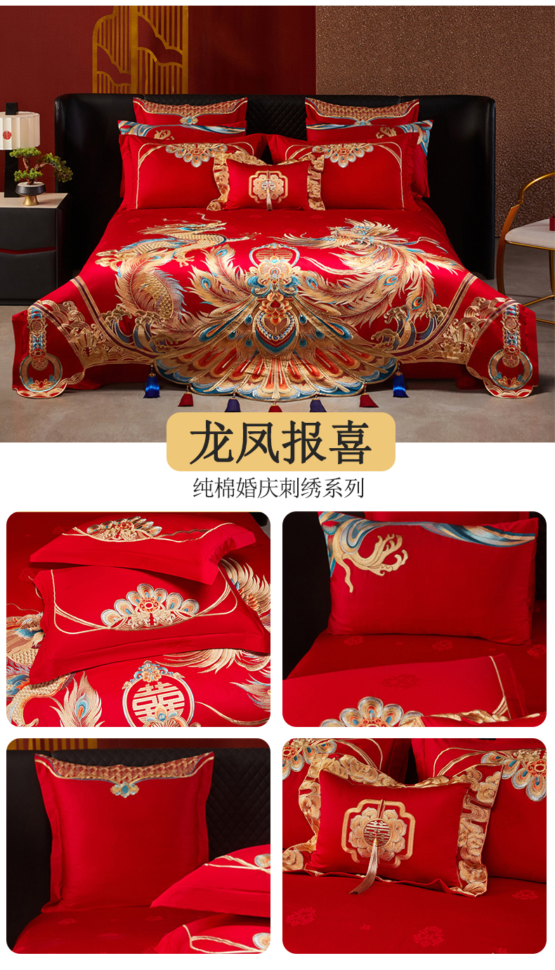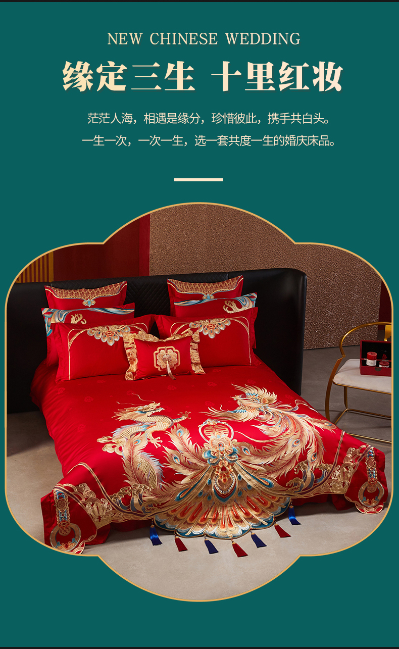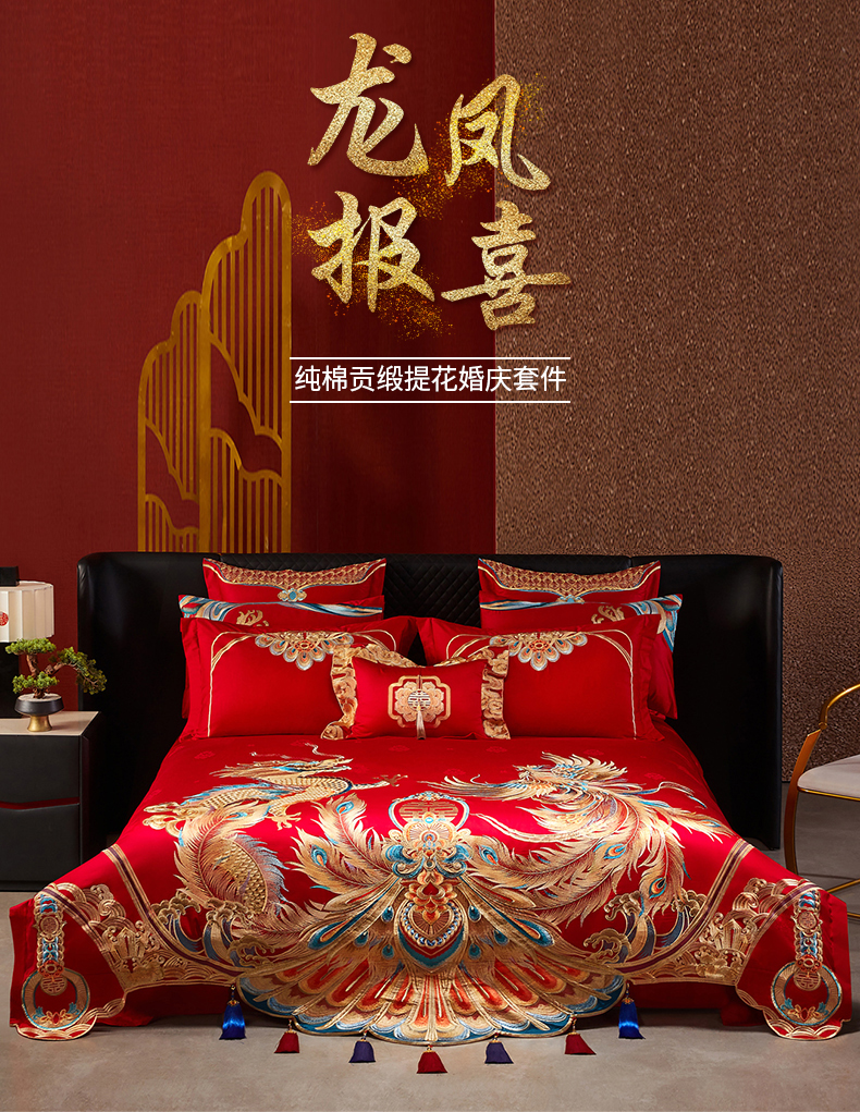 当前位置: 91家纺网 > 商品网购 > 床品套件 > 四件套 > 婚庆四件套 > 宏羽纺家纺 2025新款高支高密全棉提花新中式婚庆多件套 高支高密龙凤报喜