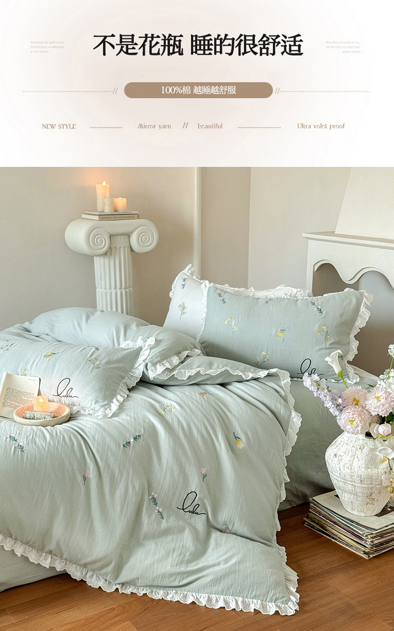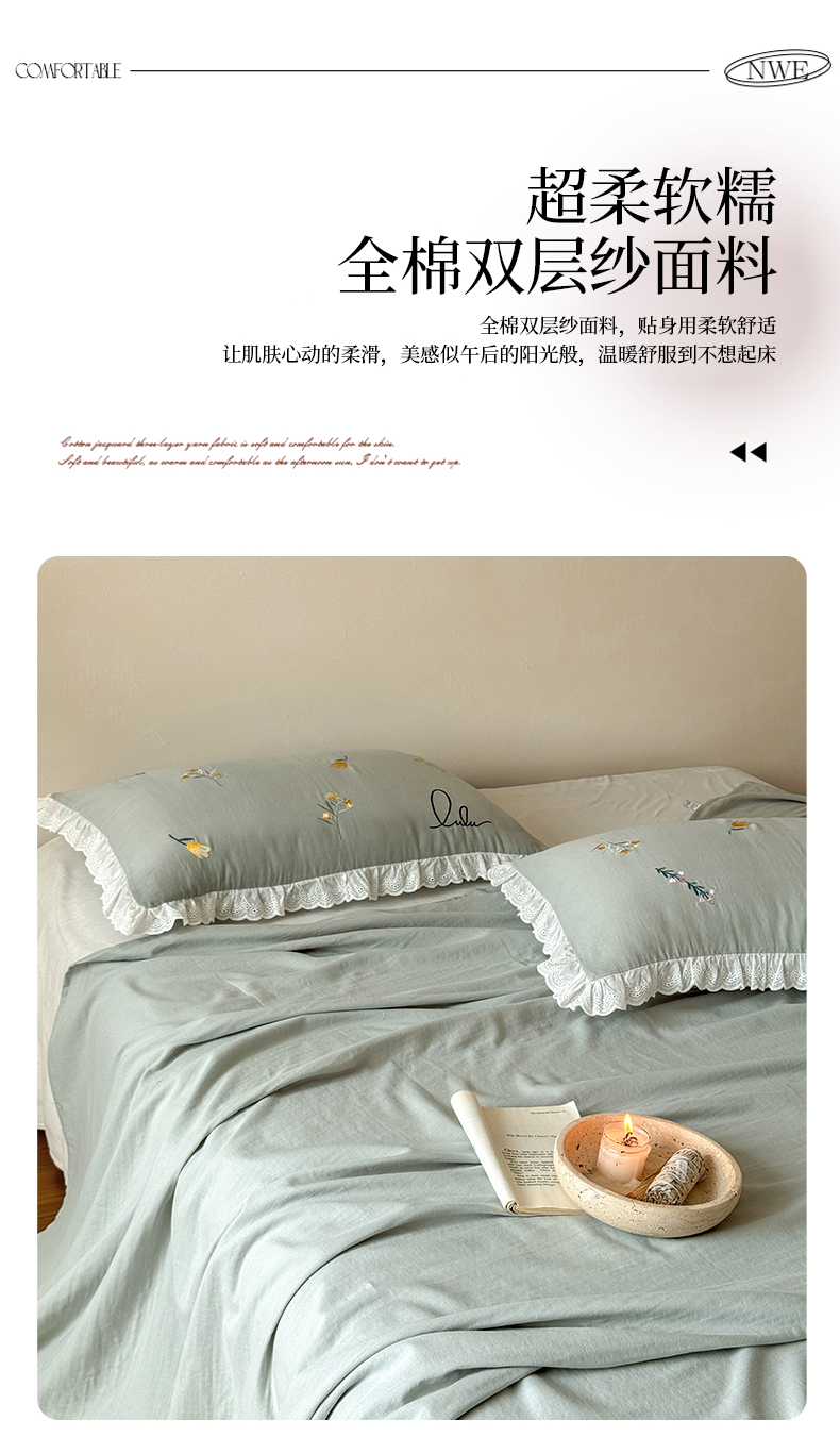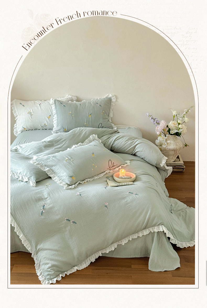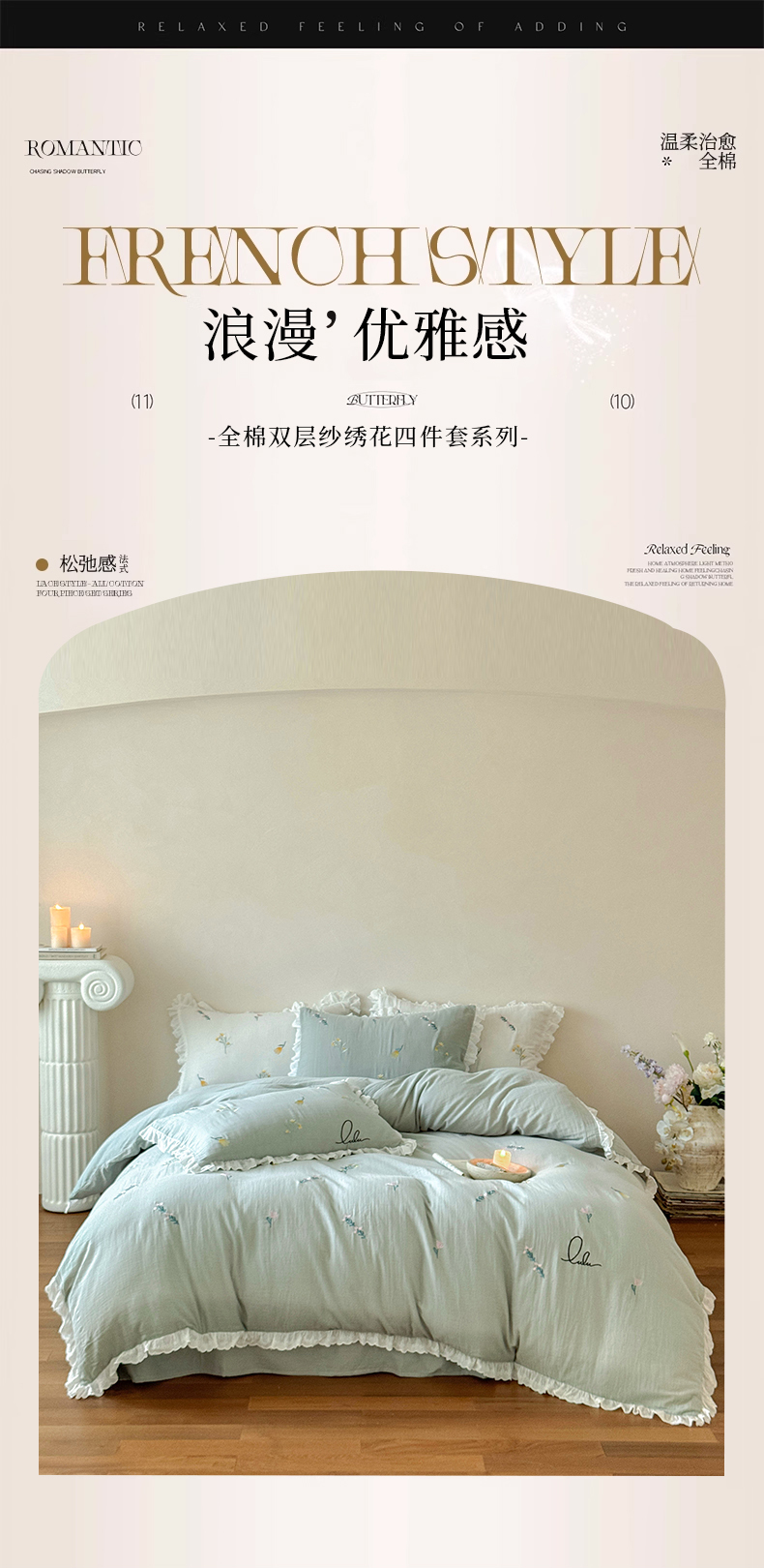 当前位置: 91家纺网 > 商品网购 > 床品套件 > 四件套 > 双层纱四件套 > FORTWO家纺原创设计(FOR TWO家纺) 2025新款40支全棉纯棉双层纱刺绣花边款四件套-小花园 小花园-绿