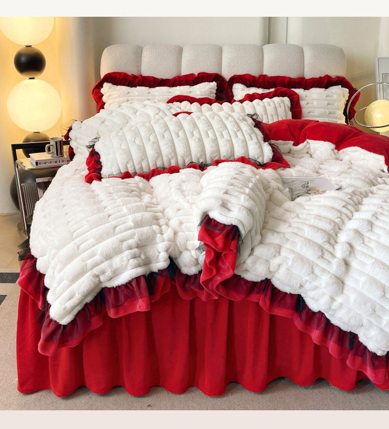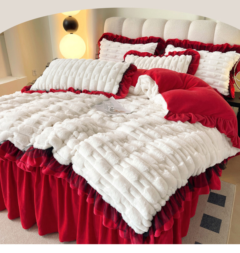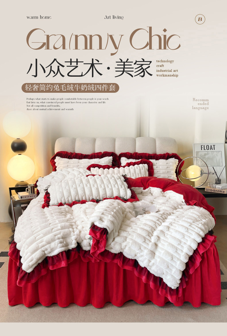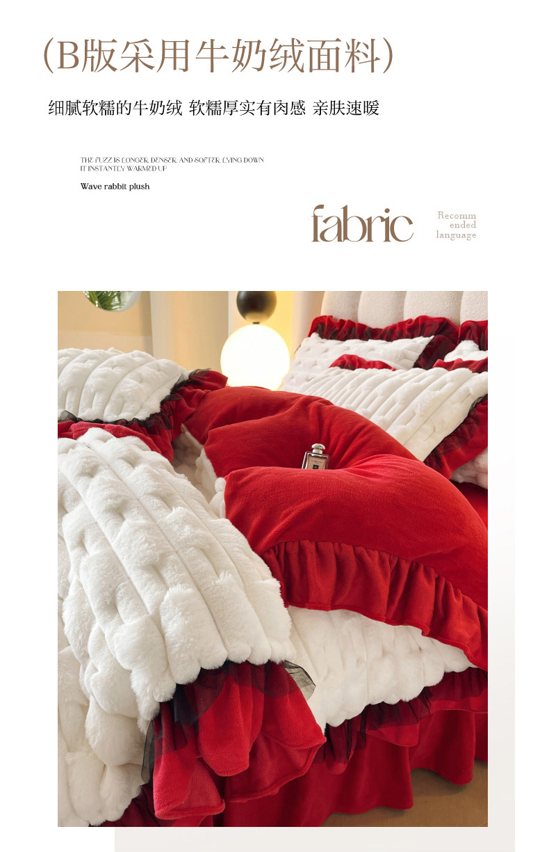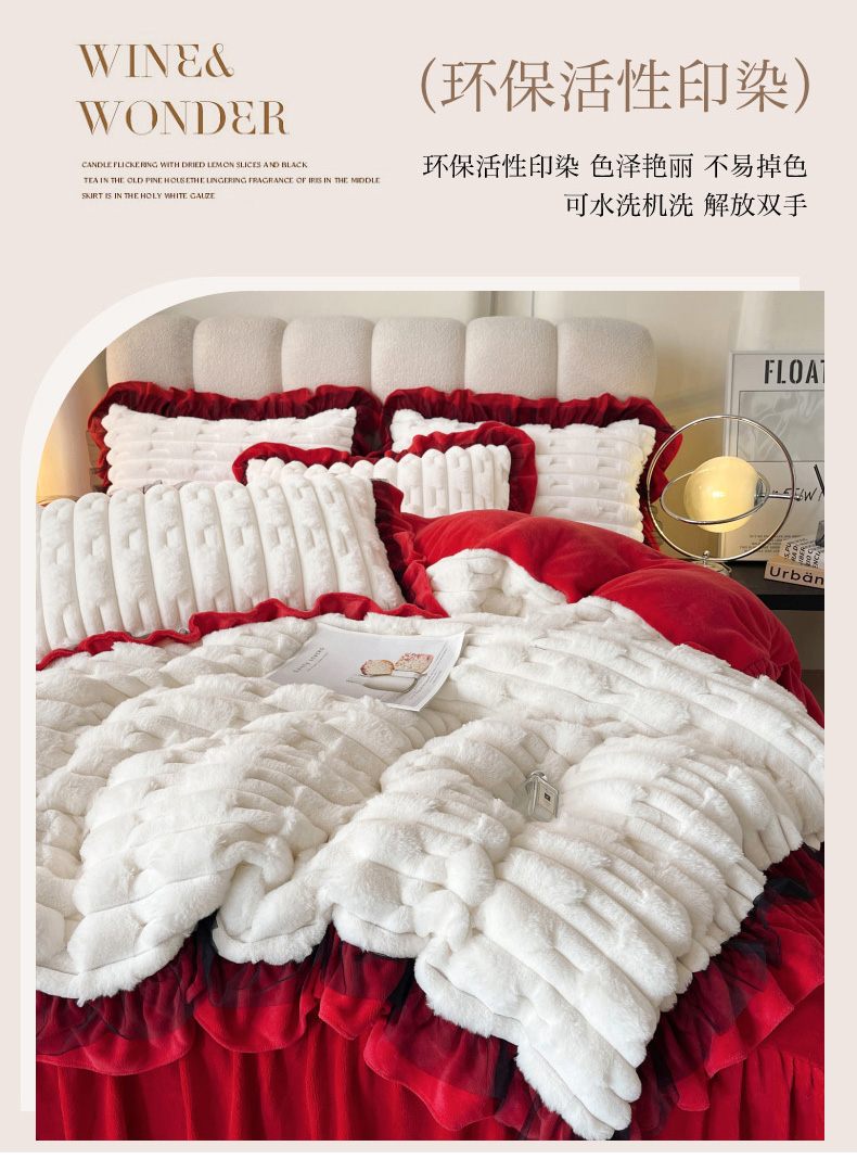 当前位置: 91家纺网 > 商品网购 > 床品套件 > 四件套 > 牛奶绒四件套 > 睡美人 2025韩版兔绒提花牛奶绒床裙床单床笠款四件套 兔绒提花-大红色