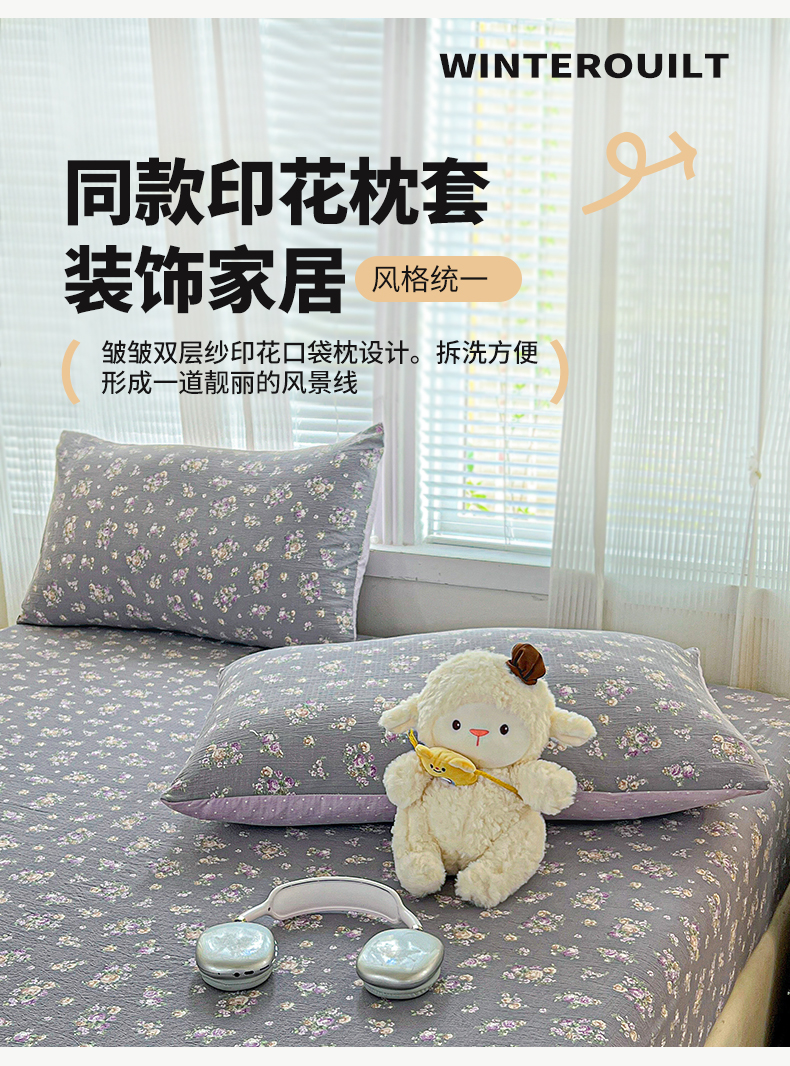 • 91家纺网 家纺一手货源 找家纺 格真 2025秋冬新款110克高克重提花加厚皱皱纱双层纱印花单床笠 长相思兰