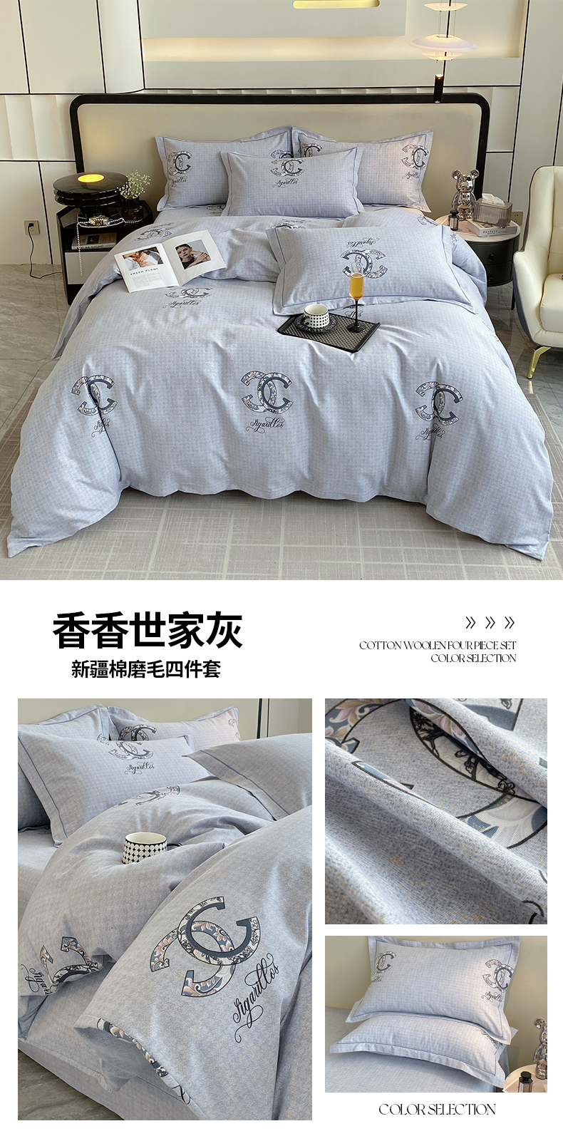 商品名称:梧桐树 2025新款轻奢新疆棉加厚磨毛四件套 蓝色恋曲