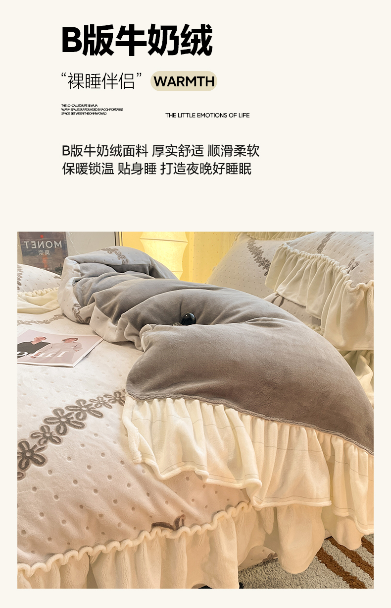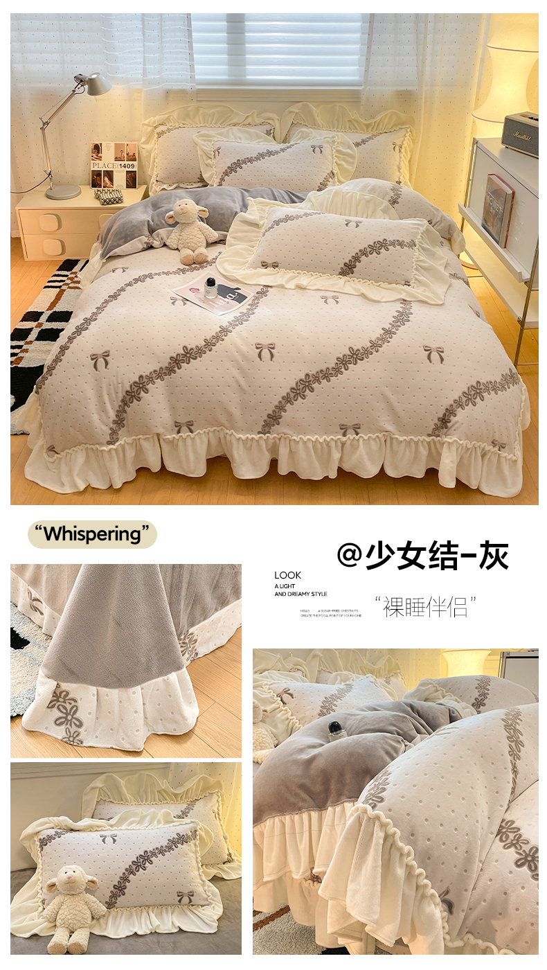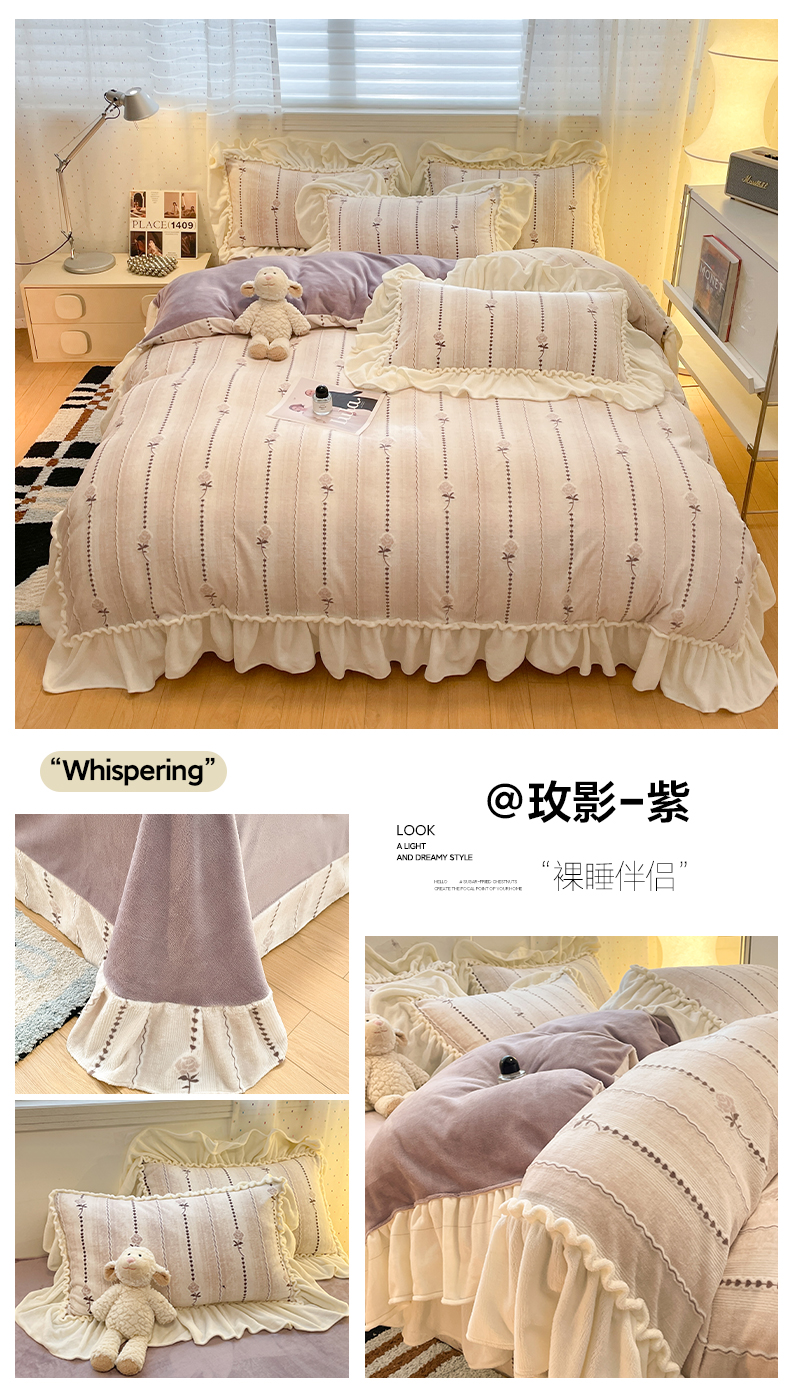 (总)利欧 2025新款褶皱边雕花牛奶绒四件套,玫影-紫,蝶舞-蓝,蝶舞-绿,玫影-橙,少女结-粉,少女结-灰,少女结-蓝,舞蝶-粉