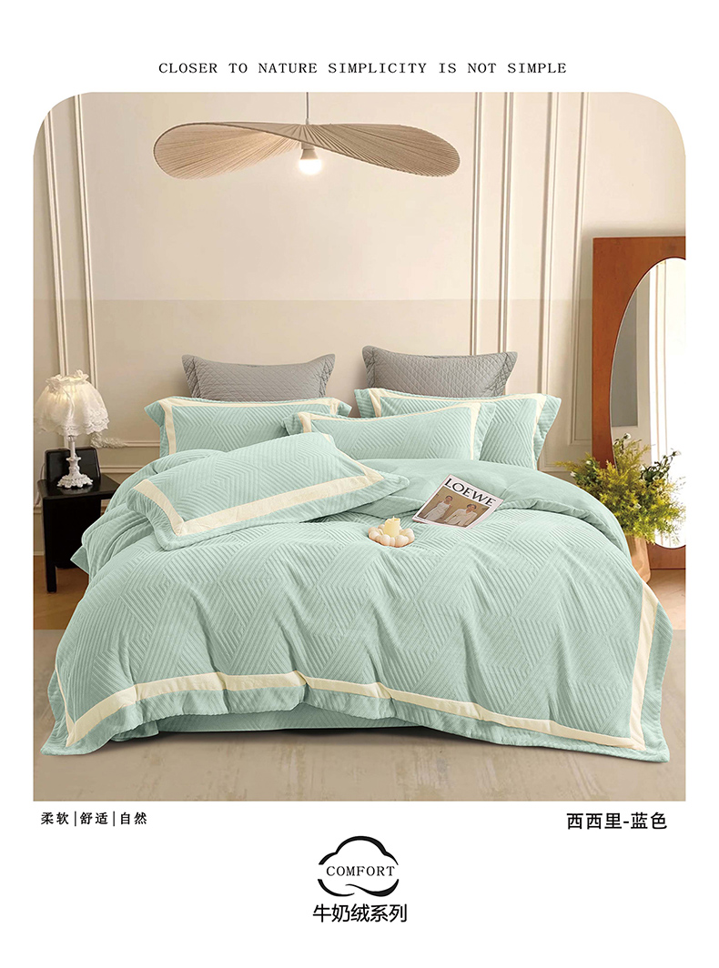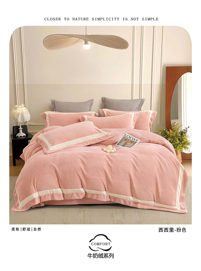 (总)尚品凤凰 2025新款牛奶绒双拼角雕花宽边款四件套--西西里系列,西西里-粉色,西西里-卡其色,西西里-蓝色,西西里-绿色