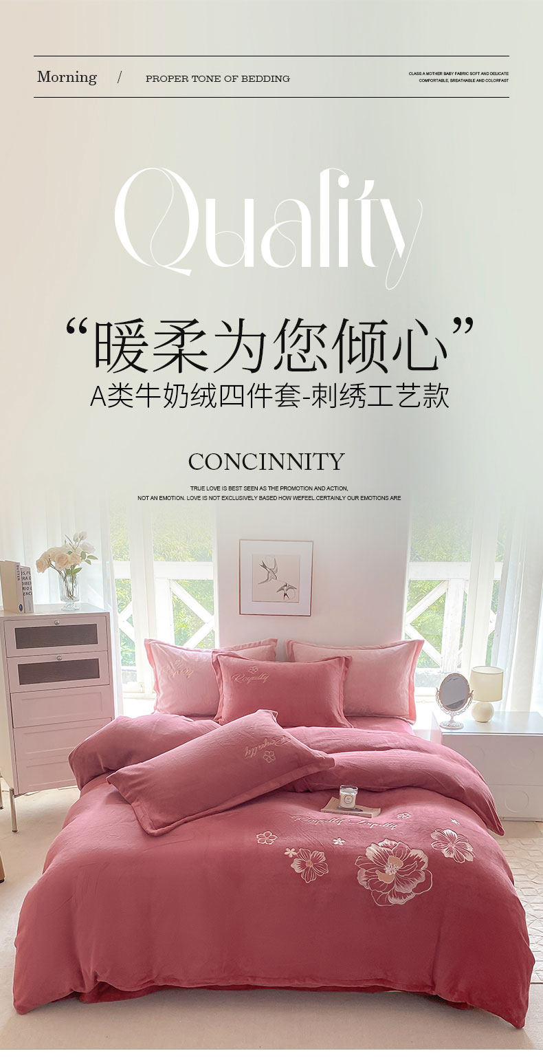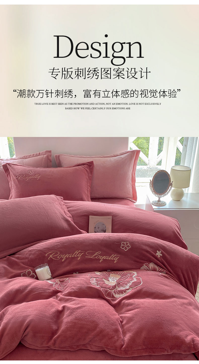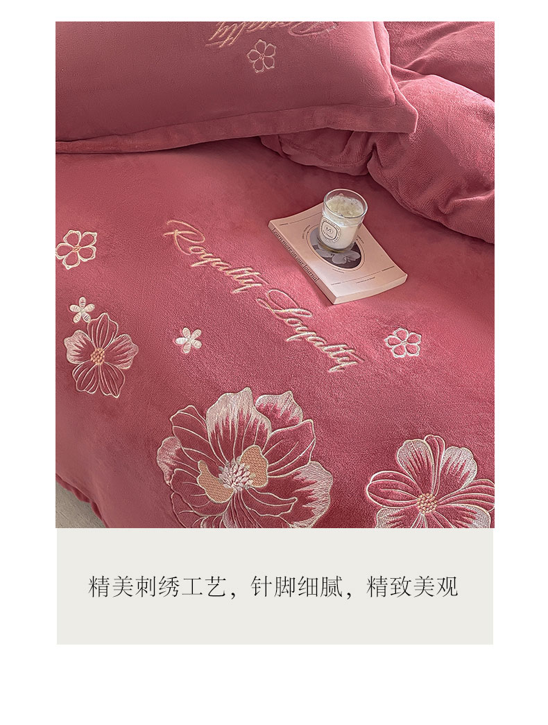 商品名称:悦织湾家纺 2025新款绣花200克重牛奶绒四件套刺绣3.5万针7斤重高密加厚保暖跨境专供外贸出口电商热销款 花语-豆沙