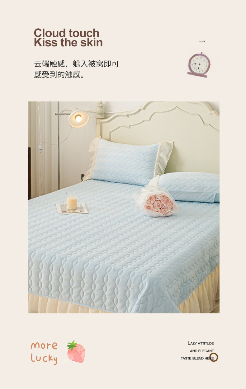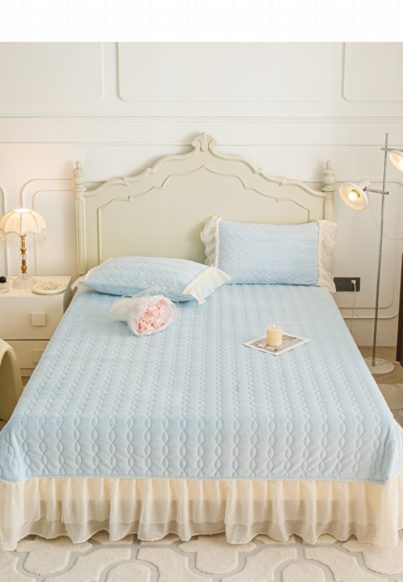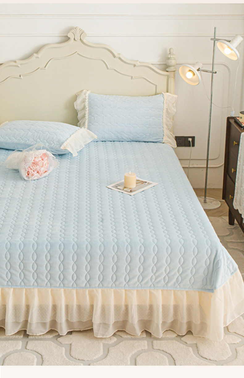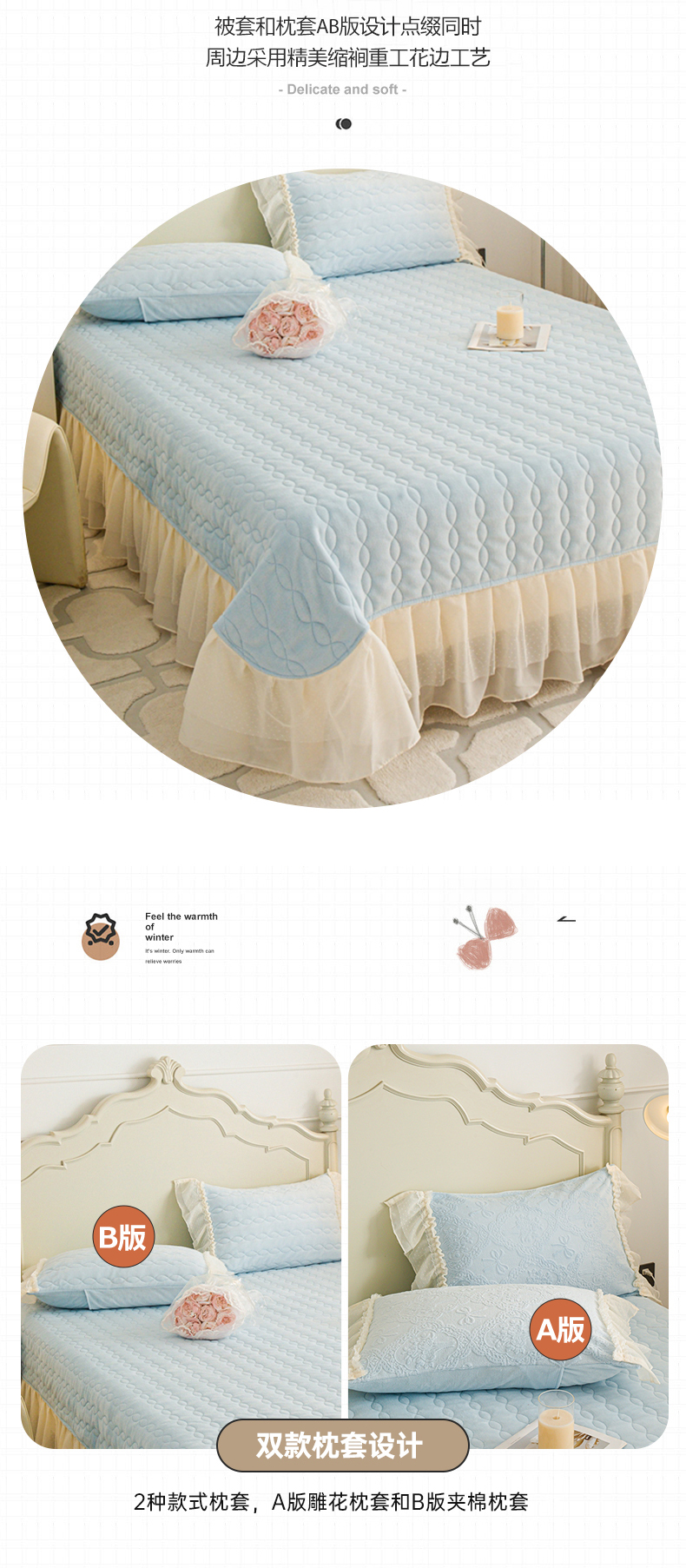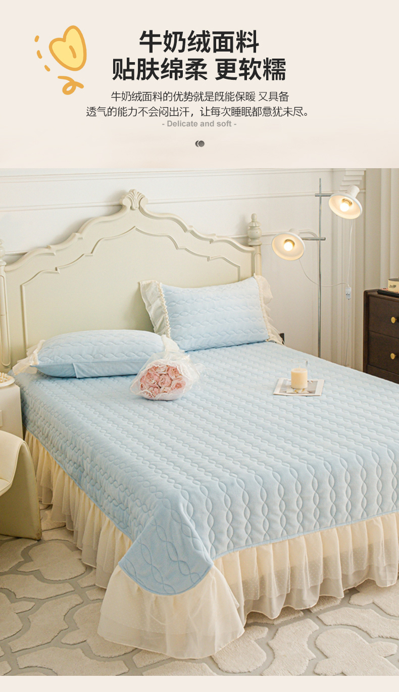 胜权家纺 2025秋冬新款A类全消光高克重5D雕花牛奶绒仙女风夹棉床盖单品系列 梦安娜-湖蓝