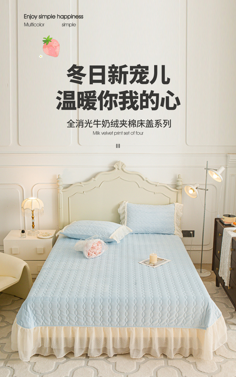 • 91家纺网 家纺一手货源 找家纺 (总)胜权家纺 2025秋冬新款A类全消光高克重5D雕花牛奶绒仙女风夹棉床盖四件套系列,梦安娜-湖蓝,梦安娜-靓紫,梦安娜-嫩粉,梦安娜-浅米