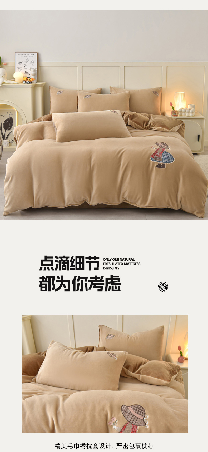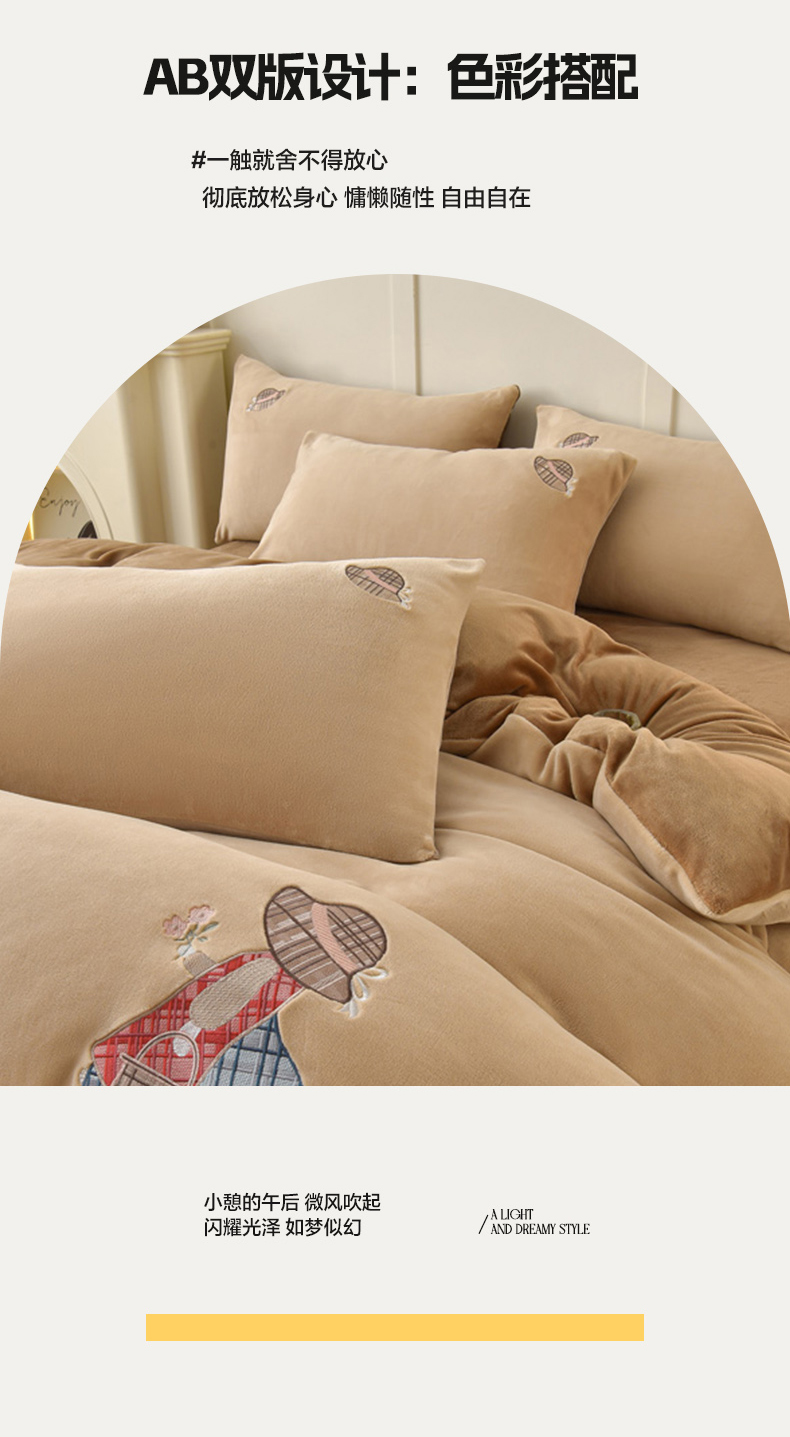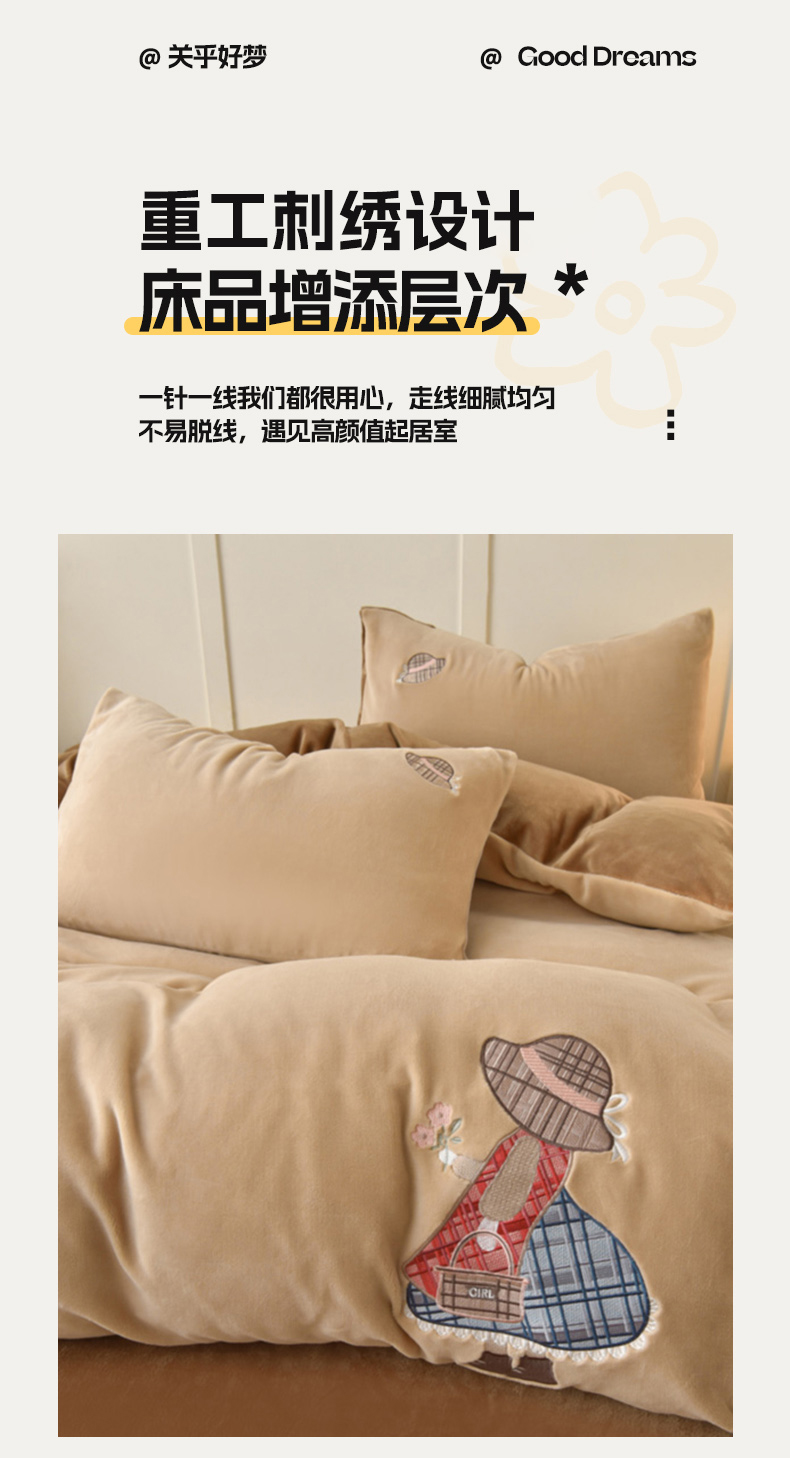 商品名称:牵依 2025新款高克重绣花牛奶绒四件套 苏姑娘-奶咖