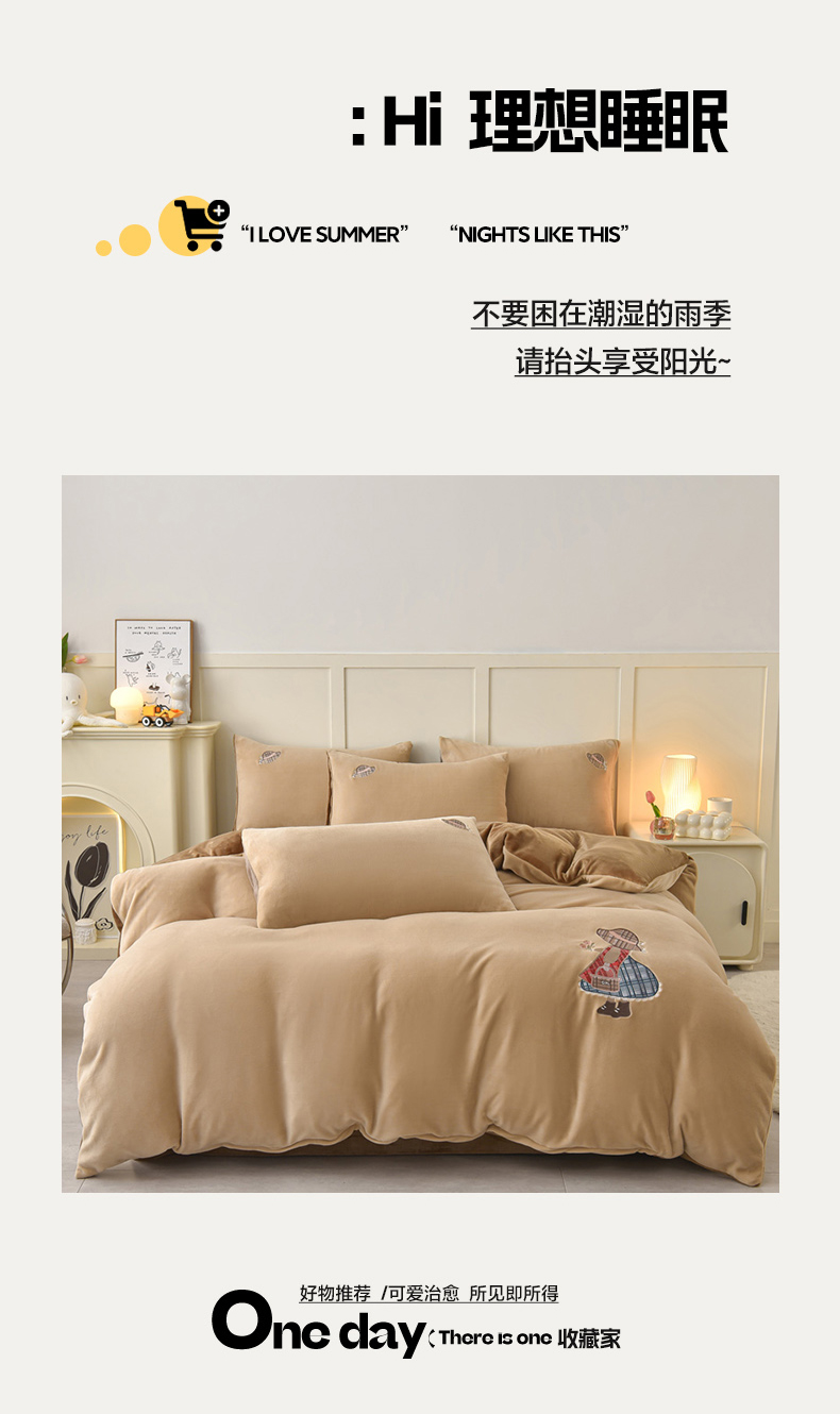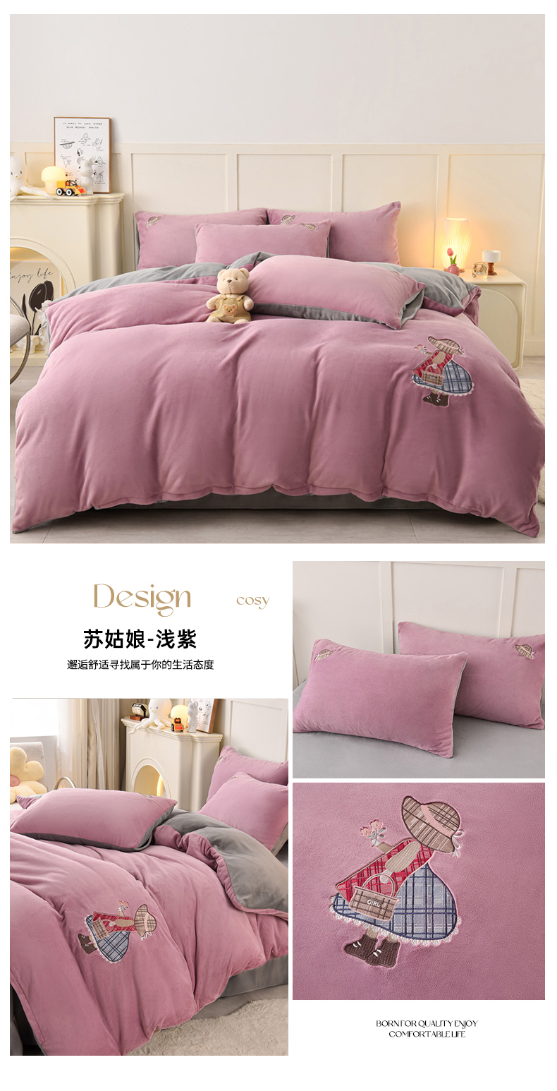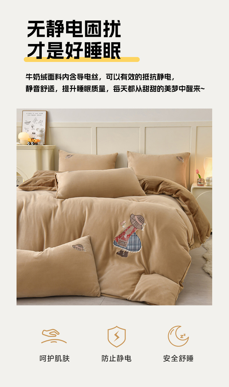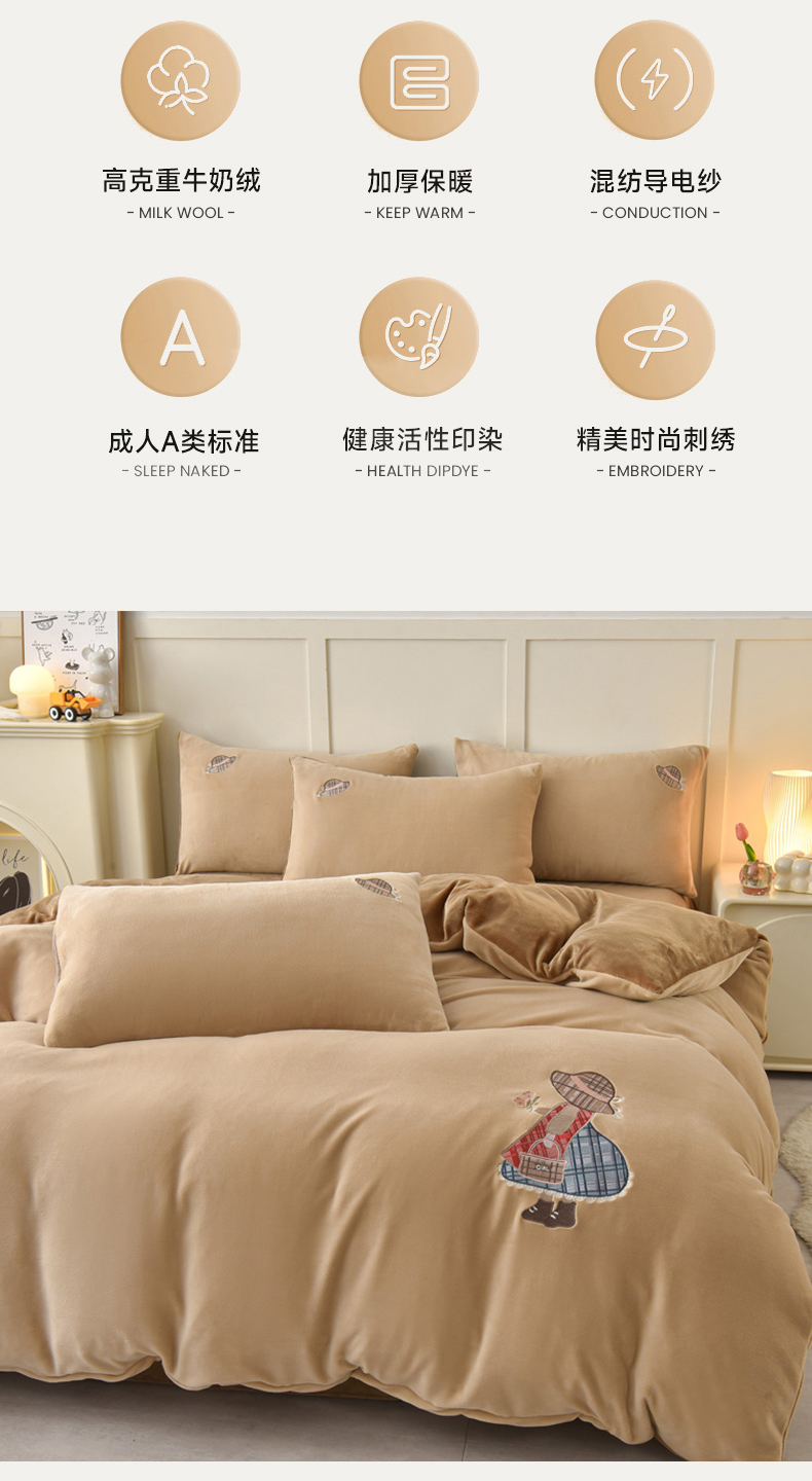 (总)牵依 2025新款高克重绣花牛奶绒四件套,可可熊-宾利蓝,足球小熊-奶油黄,苏姑娘-奶咖,足球小熊-果绿,苏姑娘-浅紫,可可熊-浅灰,可可熊-奶咖
