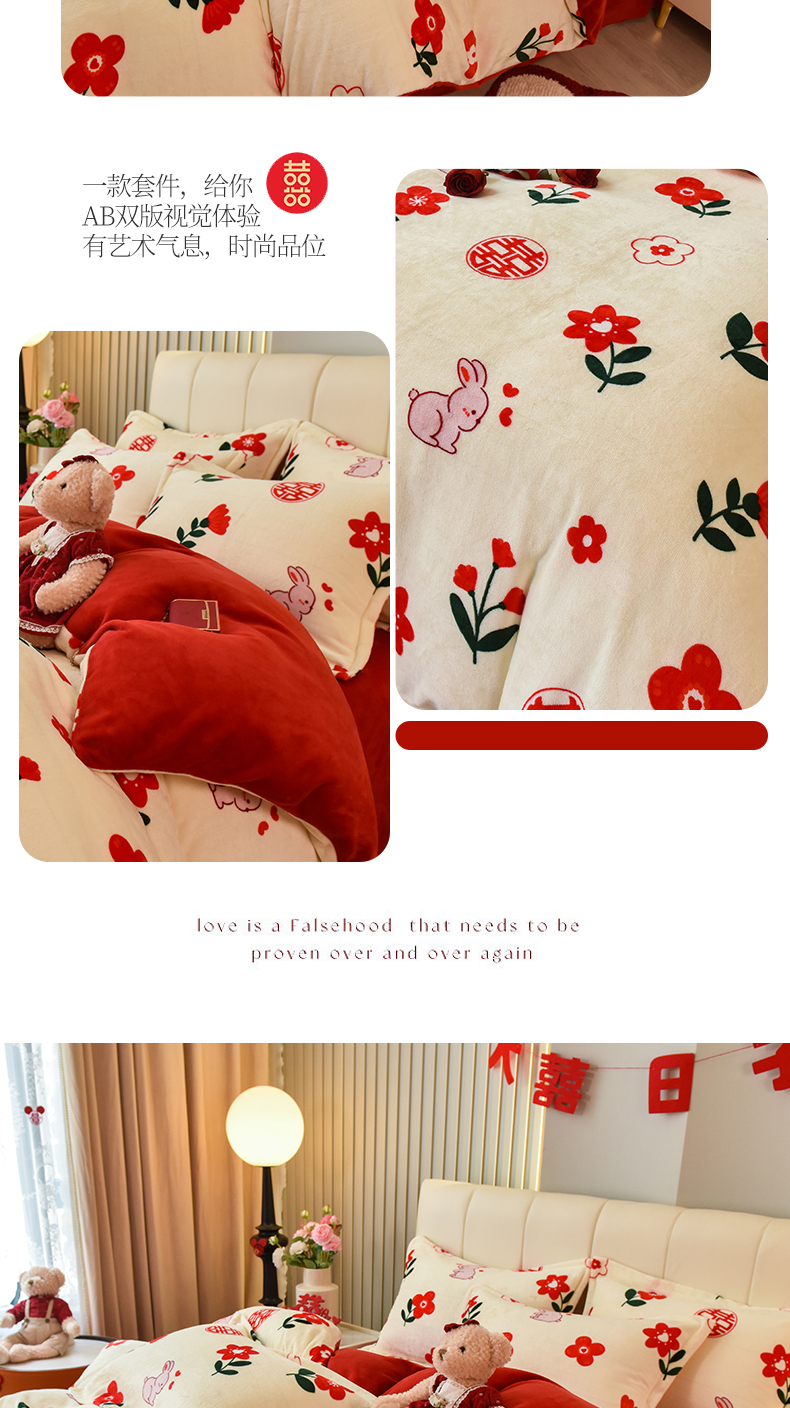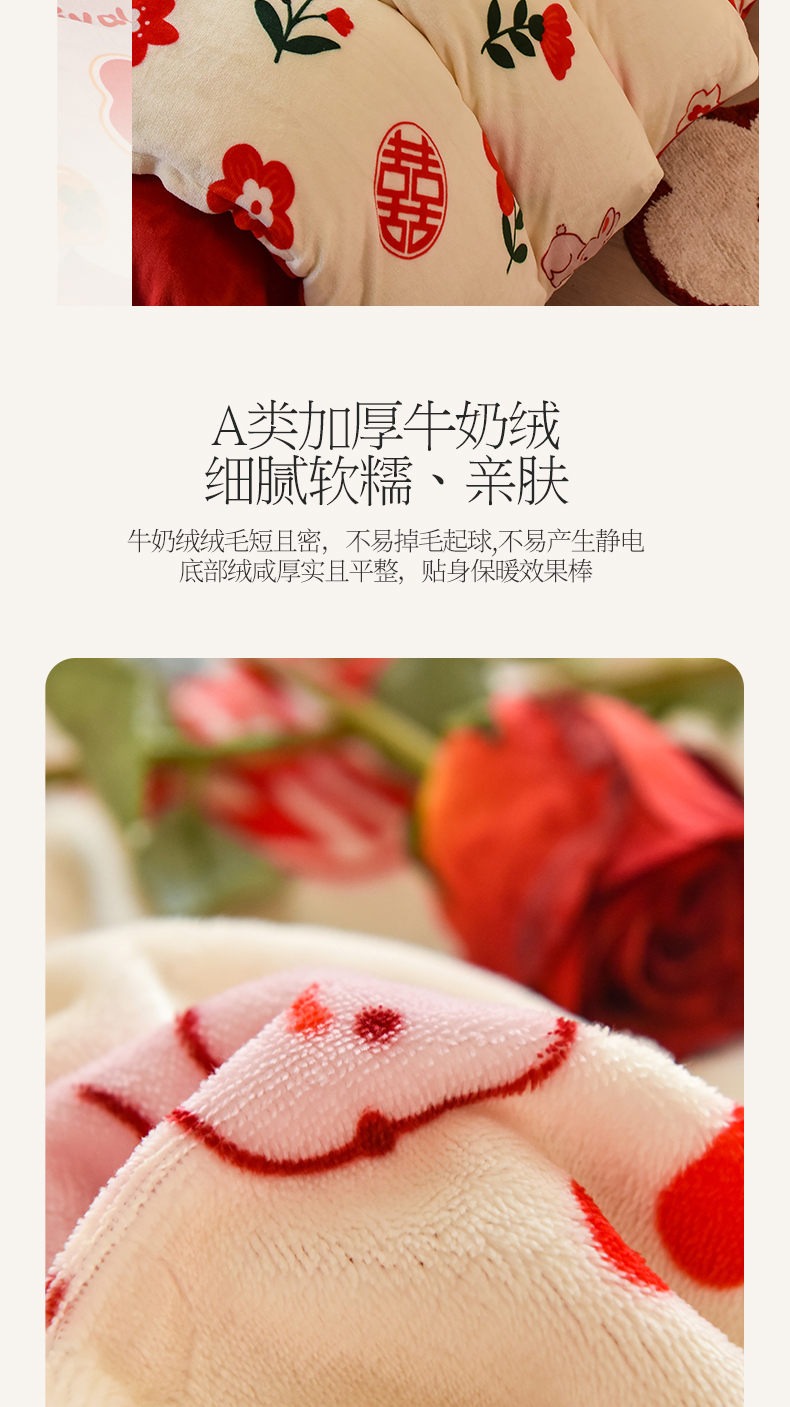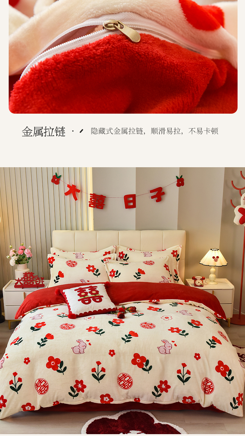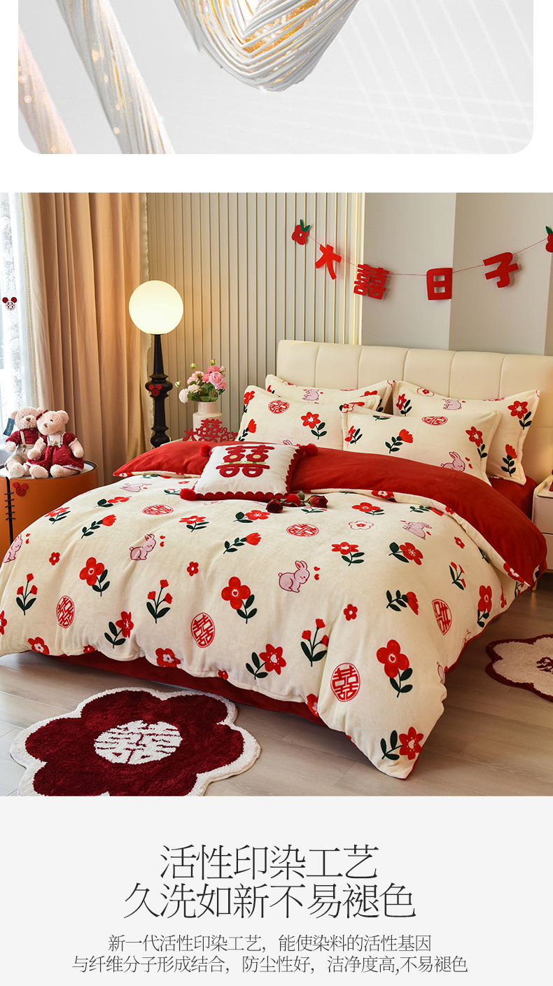 商品名称:曲之慕 2025新款高克重牛奶绒简约婚庆四件套 花房喜事