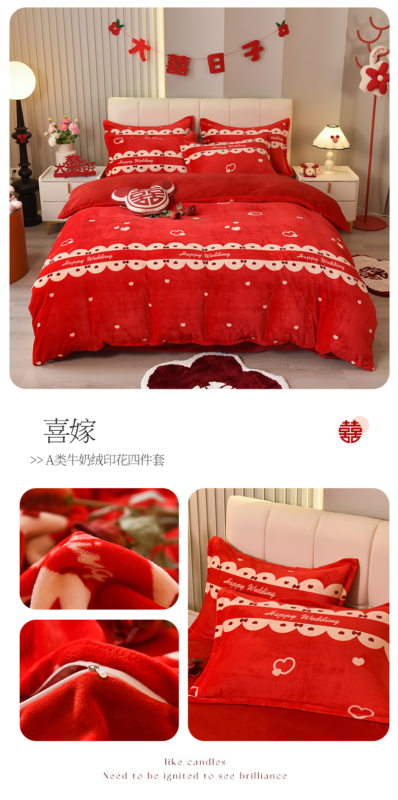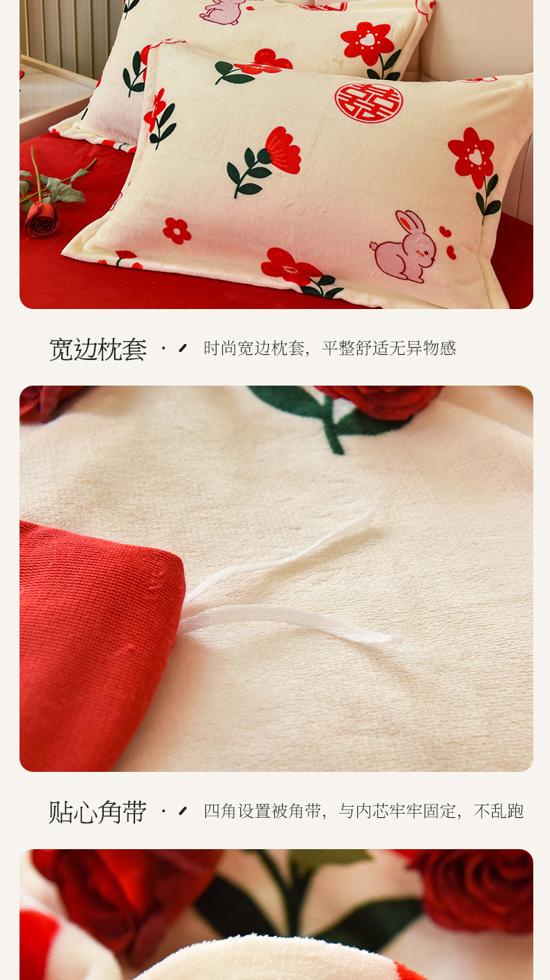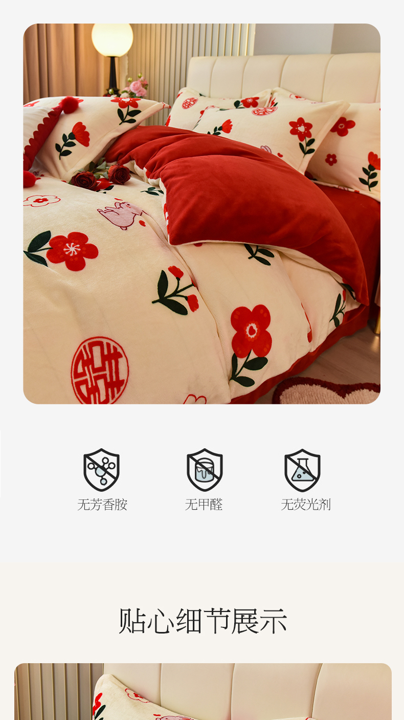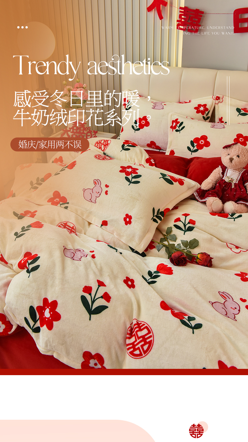 商品名称:曲之慕 2025新款高克重牛奶绒简约婚庆四件套 花房喜事
