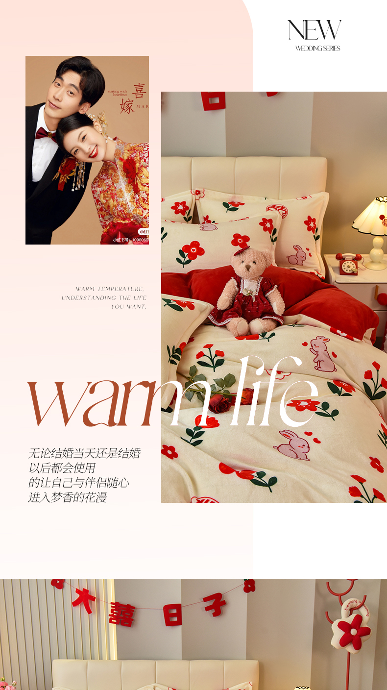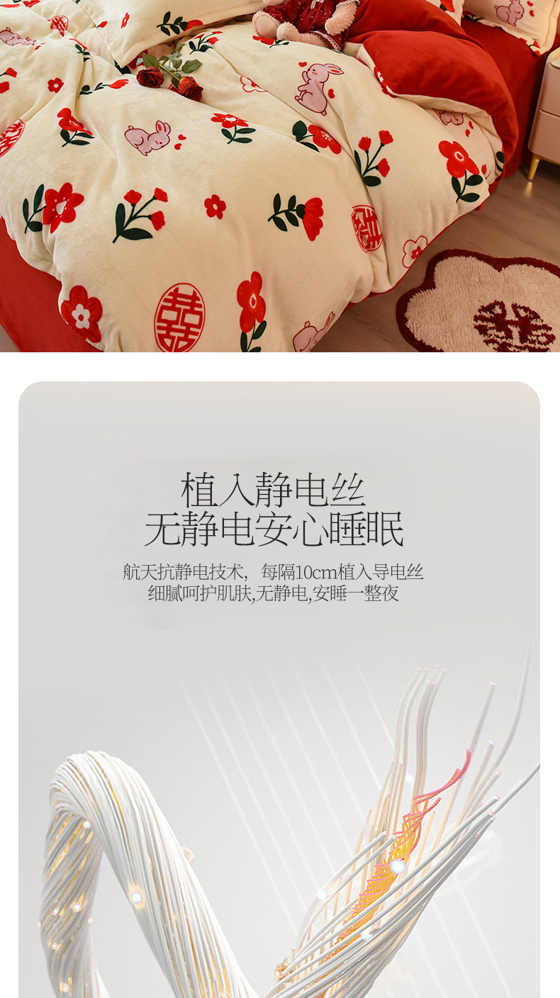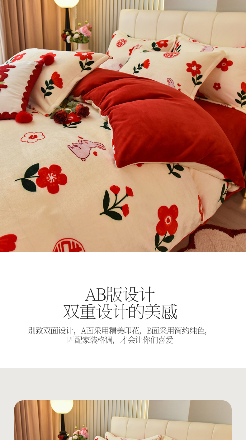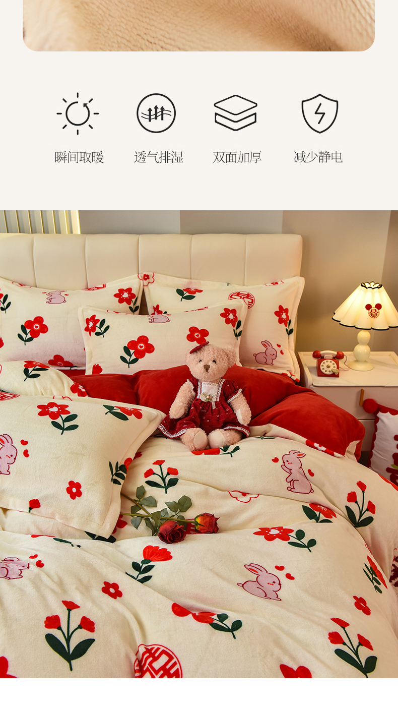 商品名称:曲之慕 2025新款高克重牛奶绒简约婚庆四件套 花房喜事