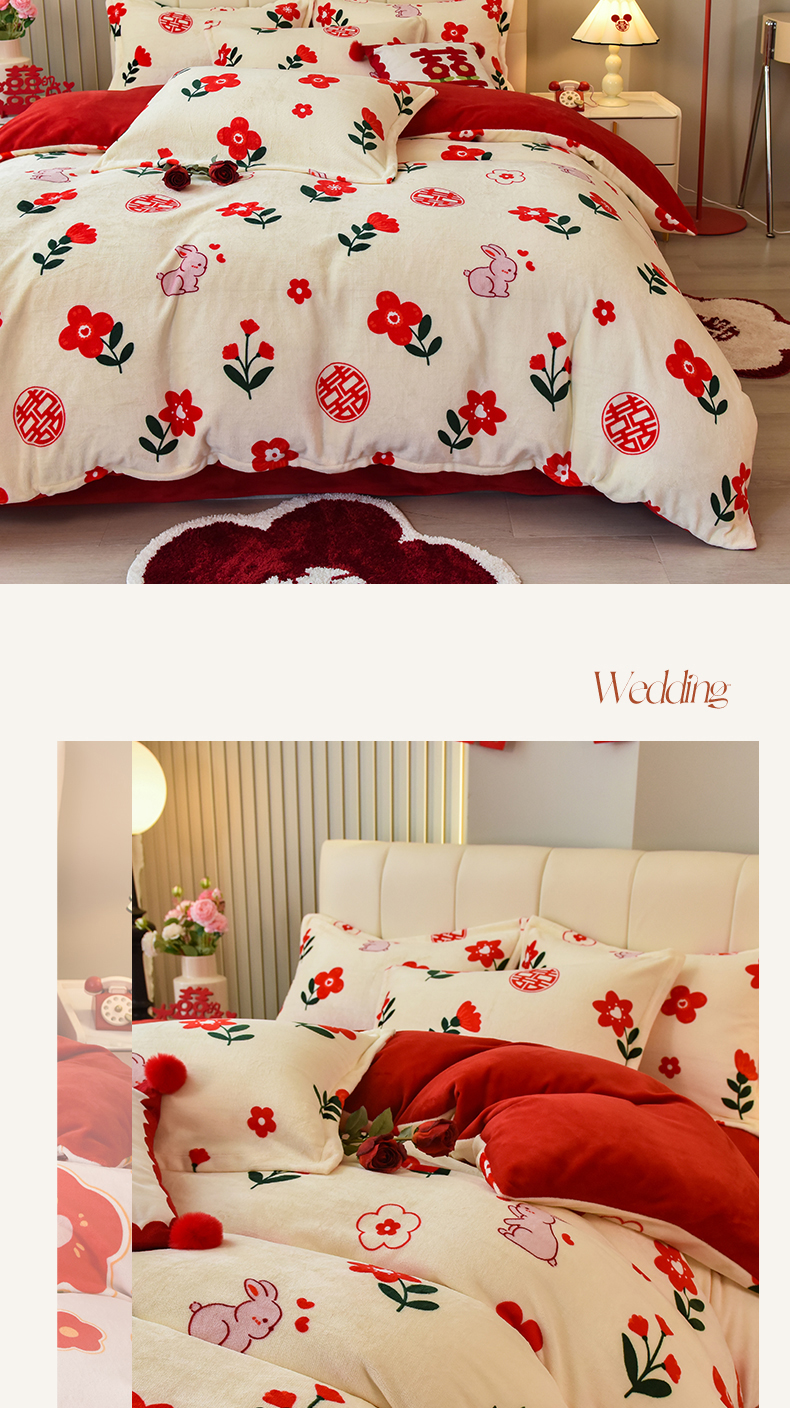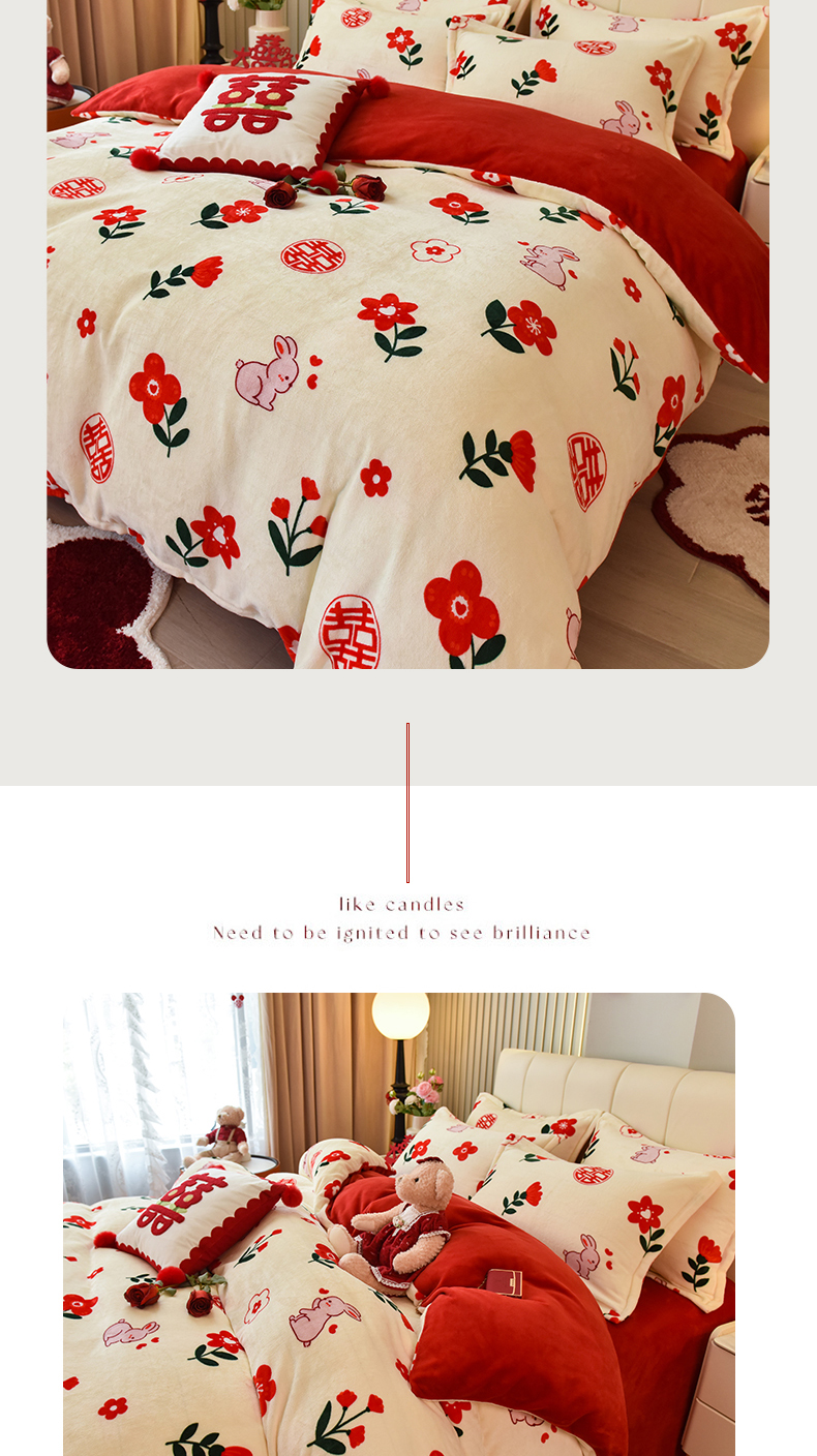 曲之慕 2025新款高克重牛奶绒简约婚庆四件套 花房喜事