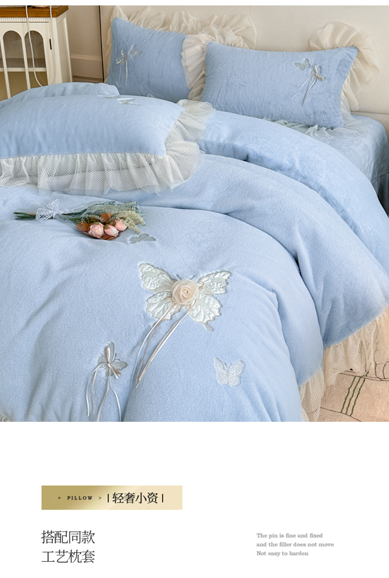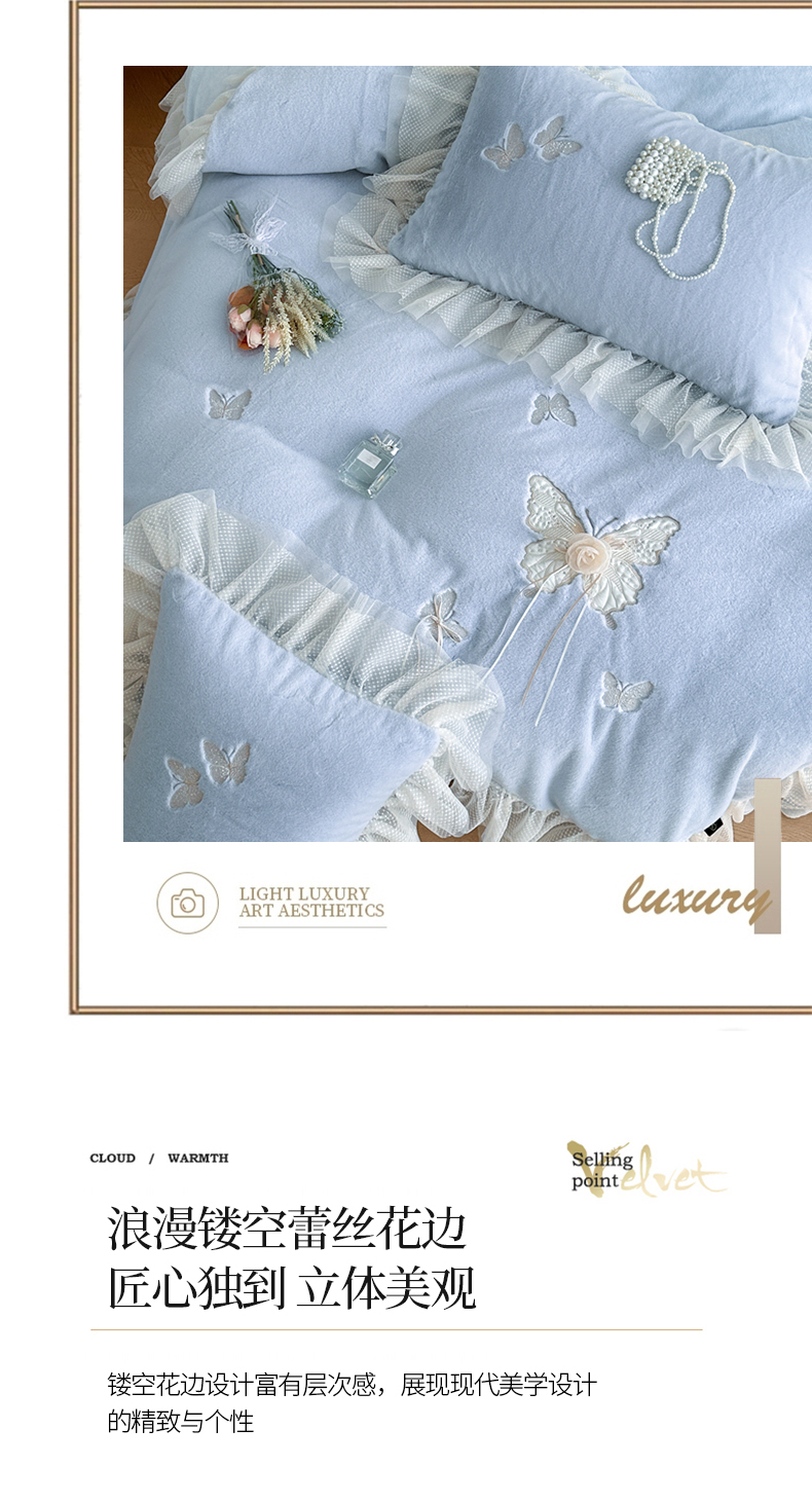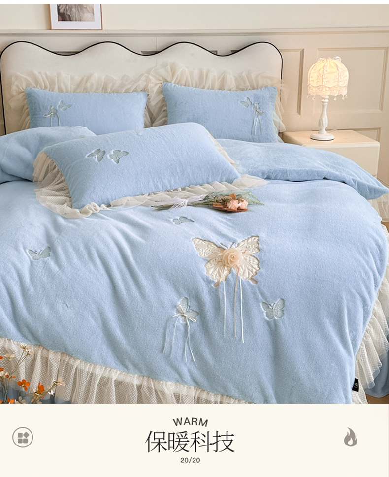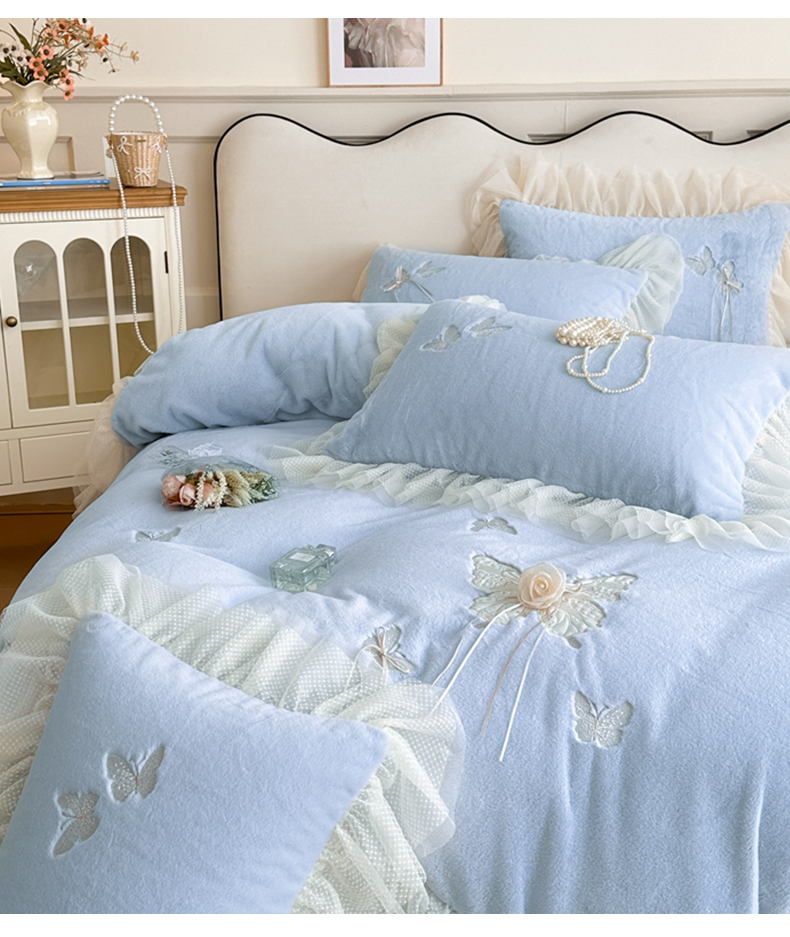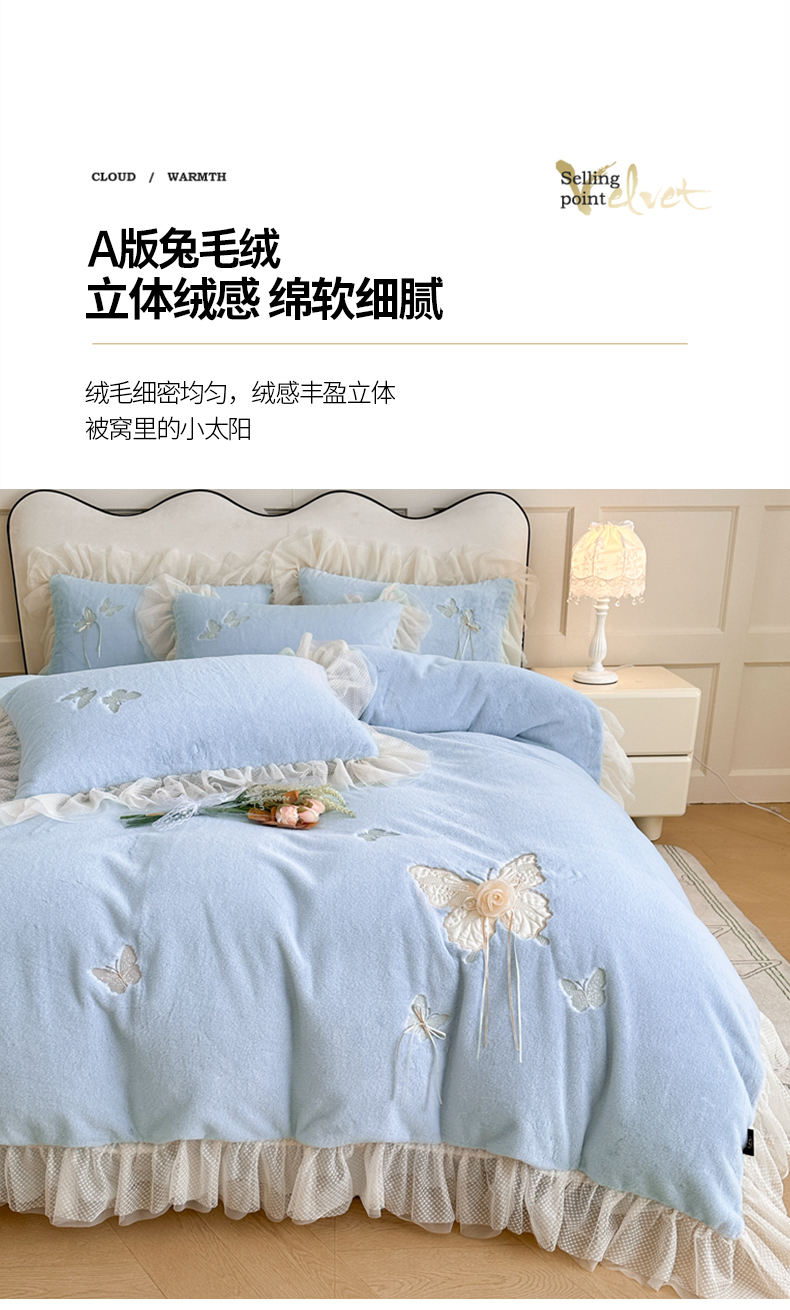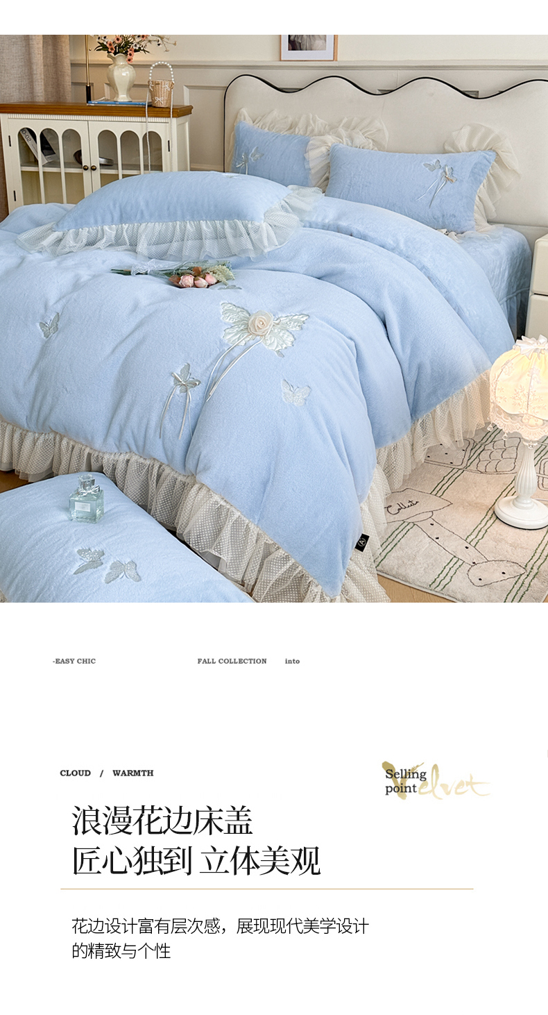 商品名称:金绣美居 2025新款加厚兔毛绒+牛奶绒韩版床盖款绣花手工花保暖四件套-蝴蝶飞飞 淡天蓝