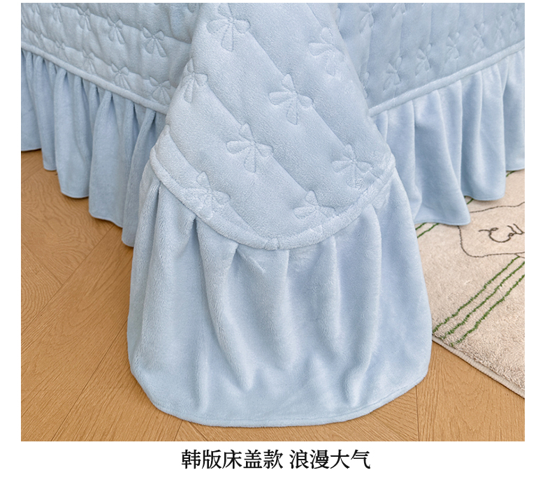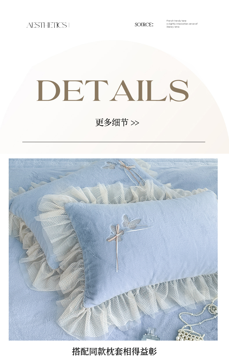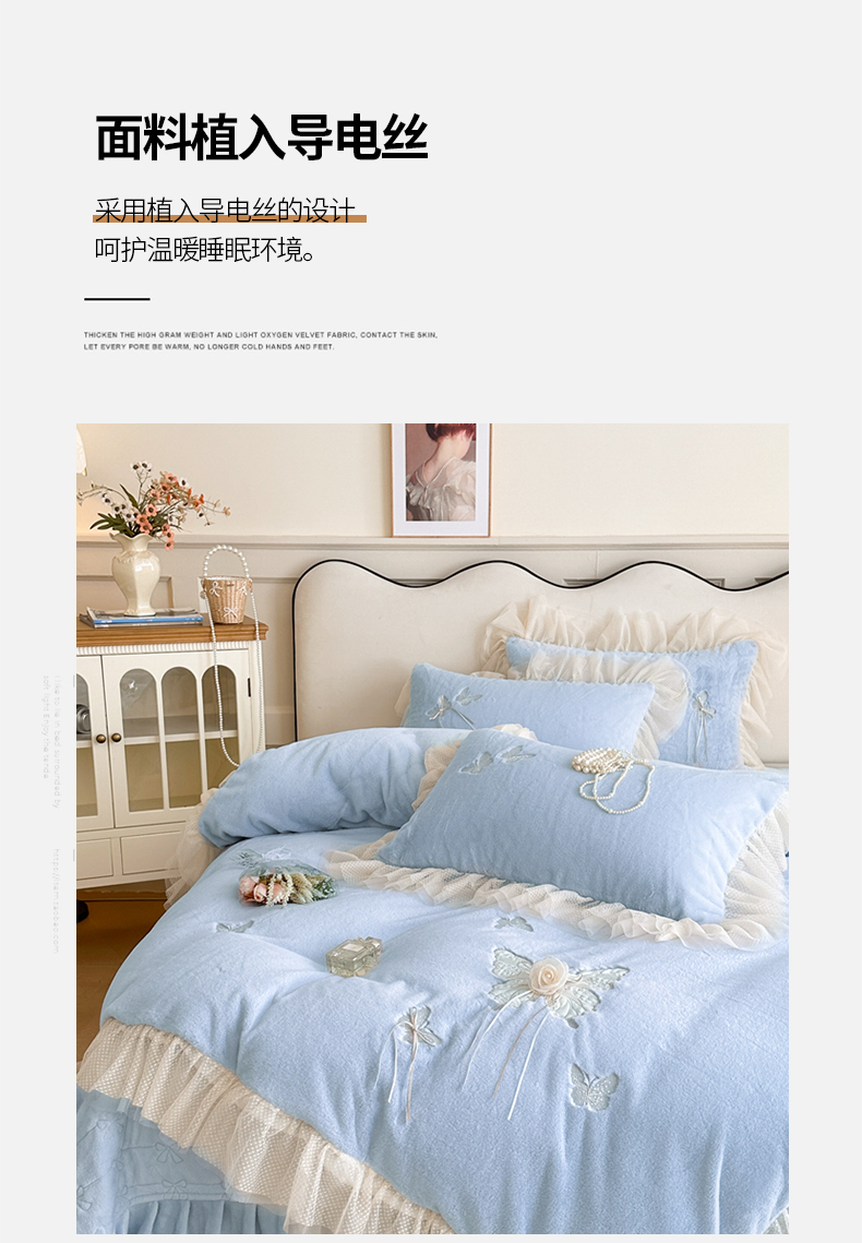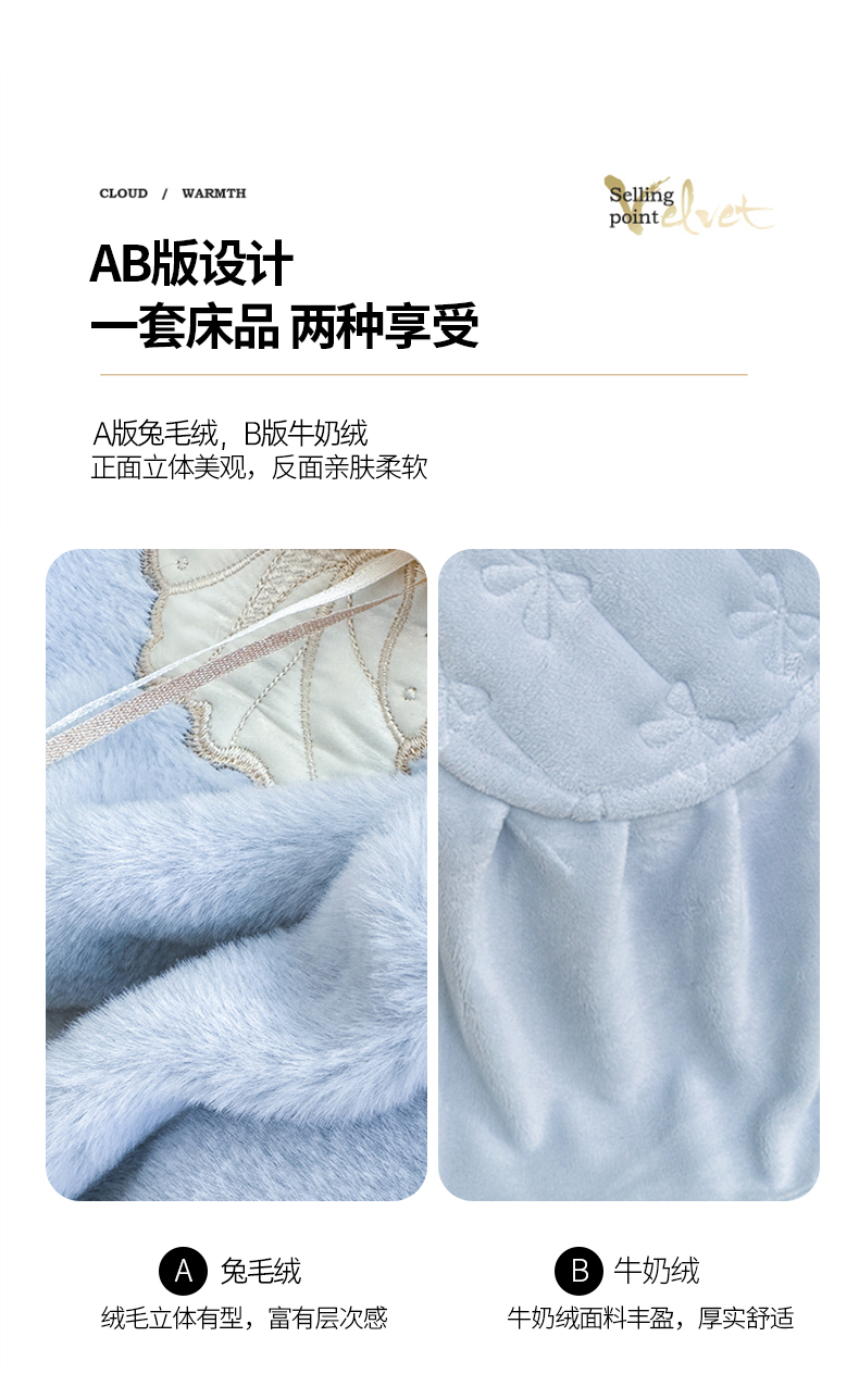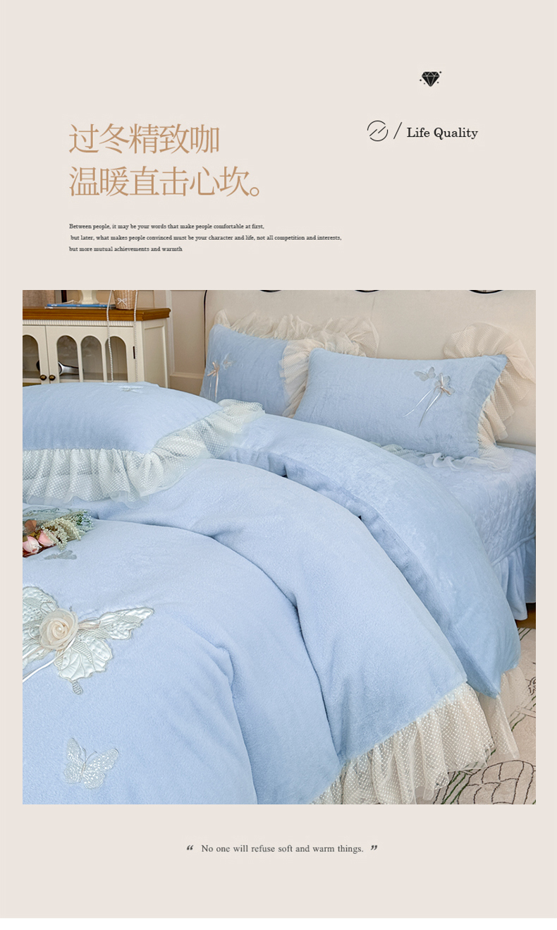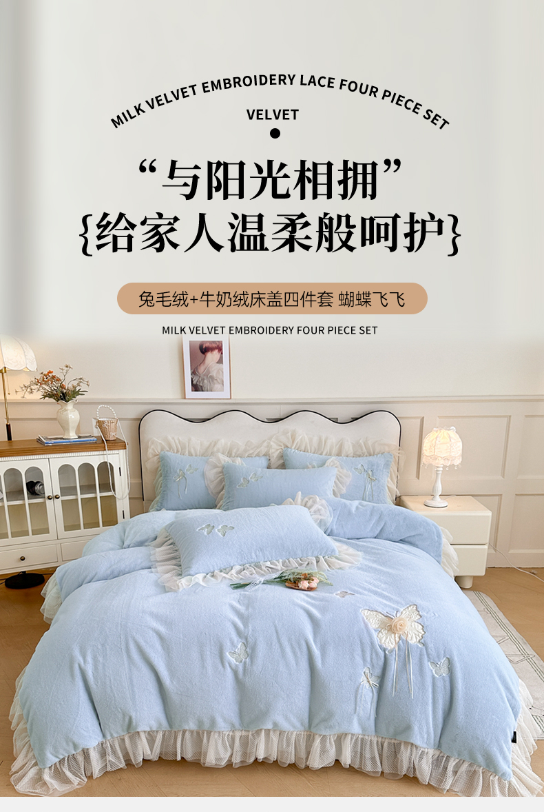 商品名称:金绣美居 2025新款加厚兔毛绒+牛奶绒韩版床盖款绣花手工花保暖四件套-蝴蝶飞飞 淡天蓝