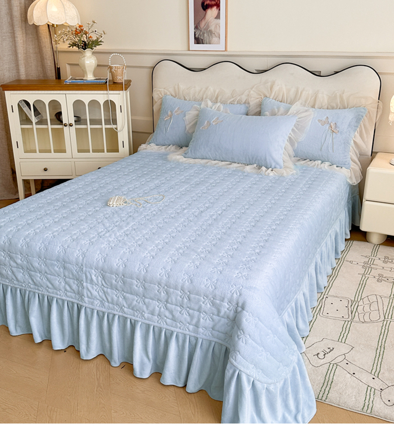金绣美居 2025新款加厚兔毛绒+牛奶绒韩版床盖款绣花手工花保暖四件套-蝴蝶飞飞 淡天蓝