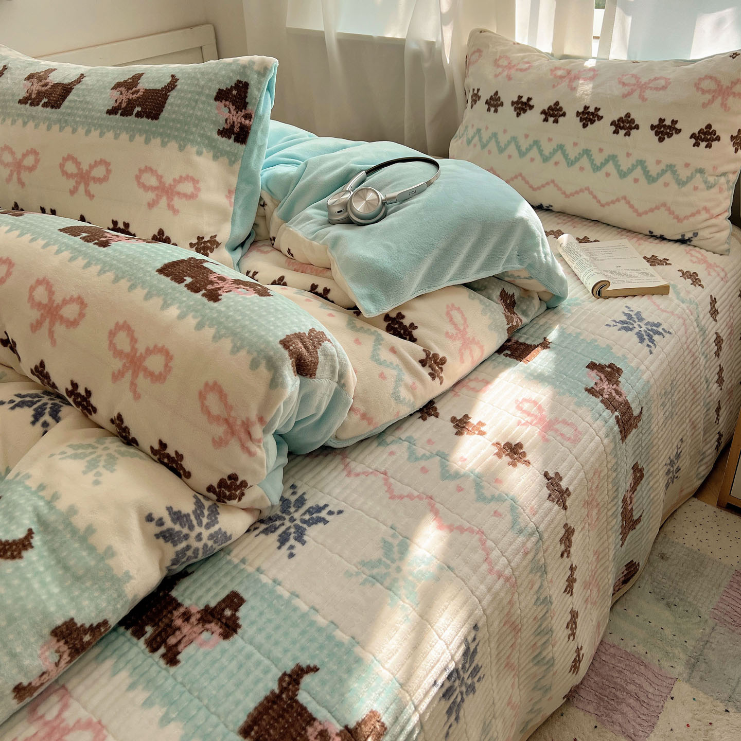 商品名称:桃喜 2025新款A类200g牛奶绒(含导电丝)印花床盖款四件套 费尔岛狗狗蓝