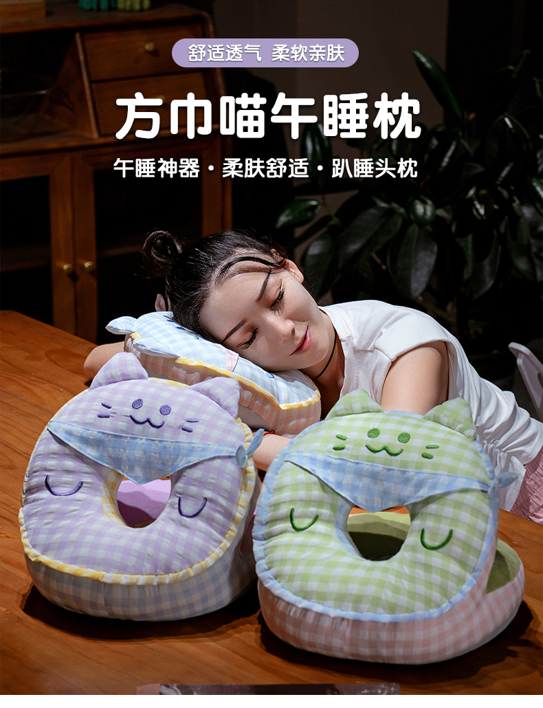 商品名称:仟亿莱 2025新款泡泡纱方巾格子喵双面午睡枕 枕头枕芯 双面方巾紫猫