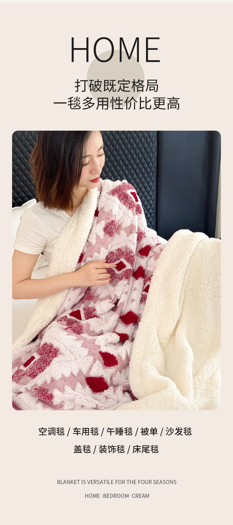商品名称:梵克保罗 2025新款轻奢阳离子提花镂空塔芙绒羊羔绒保暖午睡双层毛毯办公室盖毯 玫红