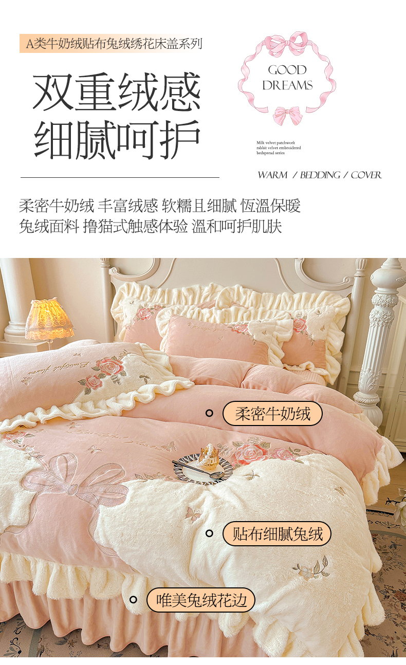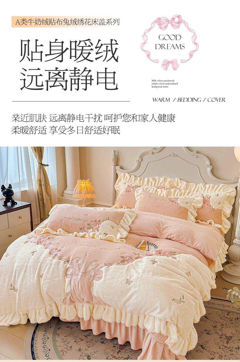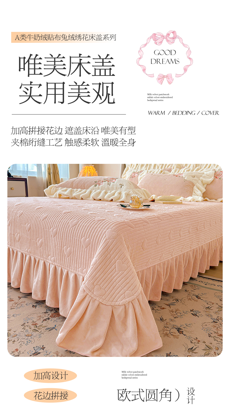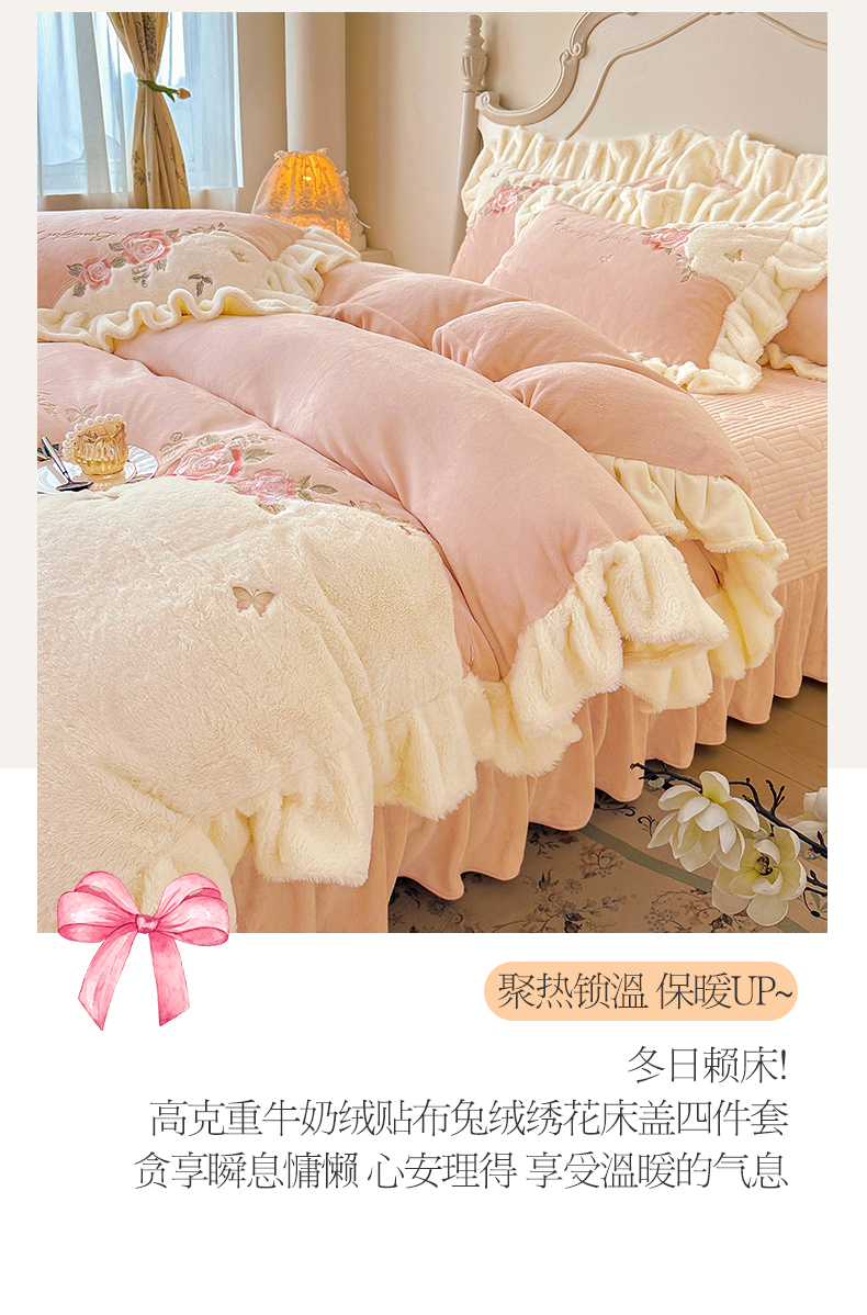 (总)宜凡家纺 2025新款兔绒提花牛奶绒夹棉床裙四件套,爱心 少女粉,爱心 粉紫,爱心 驼色,蝶舞 大红,蝶舞 米色,蝶舞 浅紫,蝶舞 玉色,简爱 苍青,简爱 豆沙紫,简爱 玉色,樱桃 苍青,樱桃 豆沙紫,樱桃 奶油白