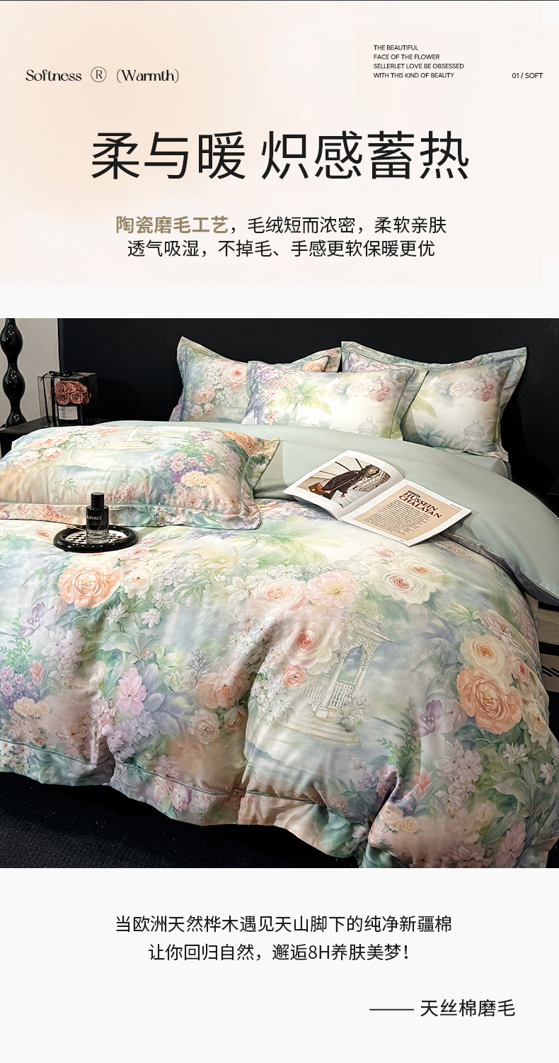 商品名称:舒慕家纺 2025新款天丝棉磨毛四件套艾阳绒四件套(配送高端包装) 相思花语