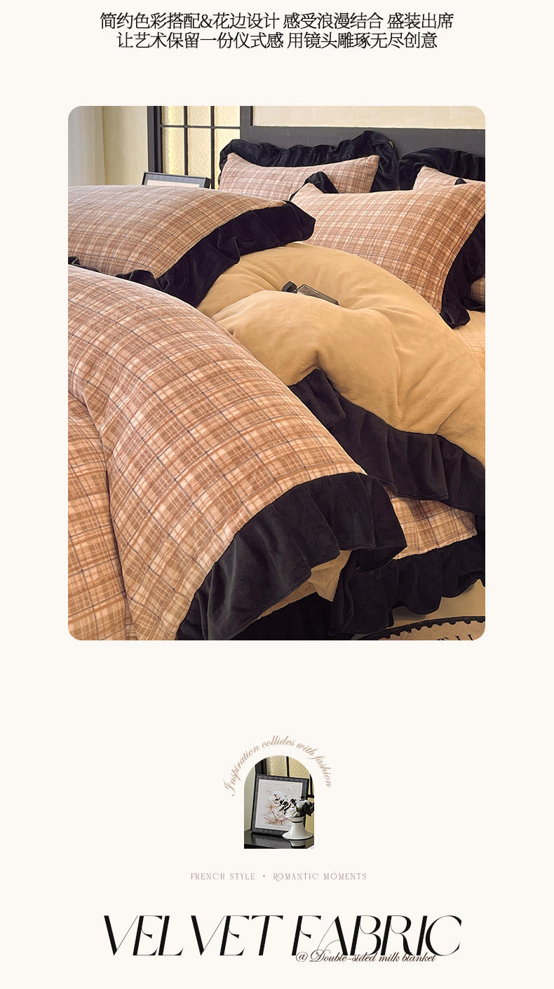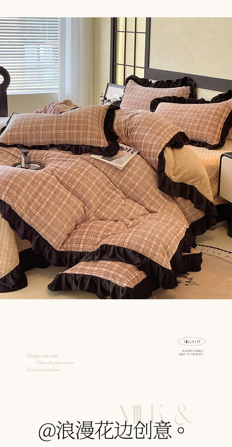 锦彩家居 2025新款高克重牛奶绒花边床盖款四件套-格律时尚 格律时尚-咖