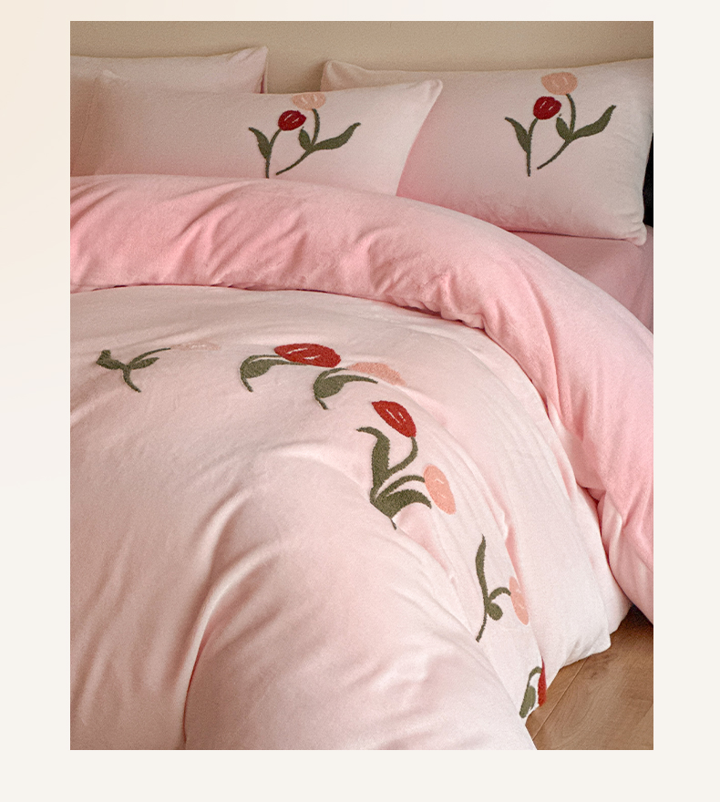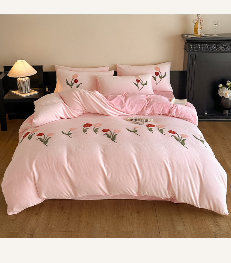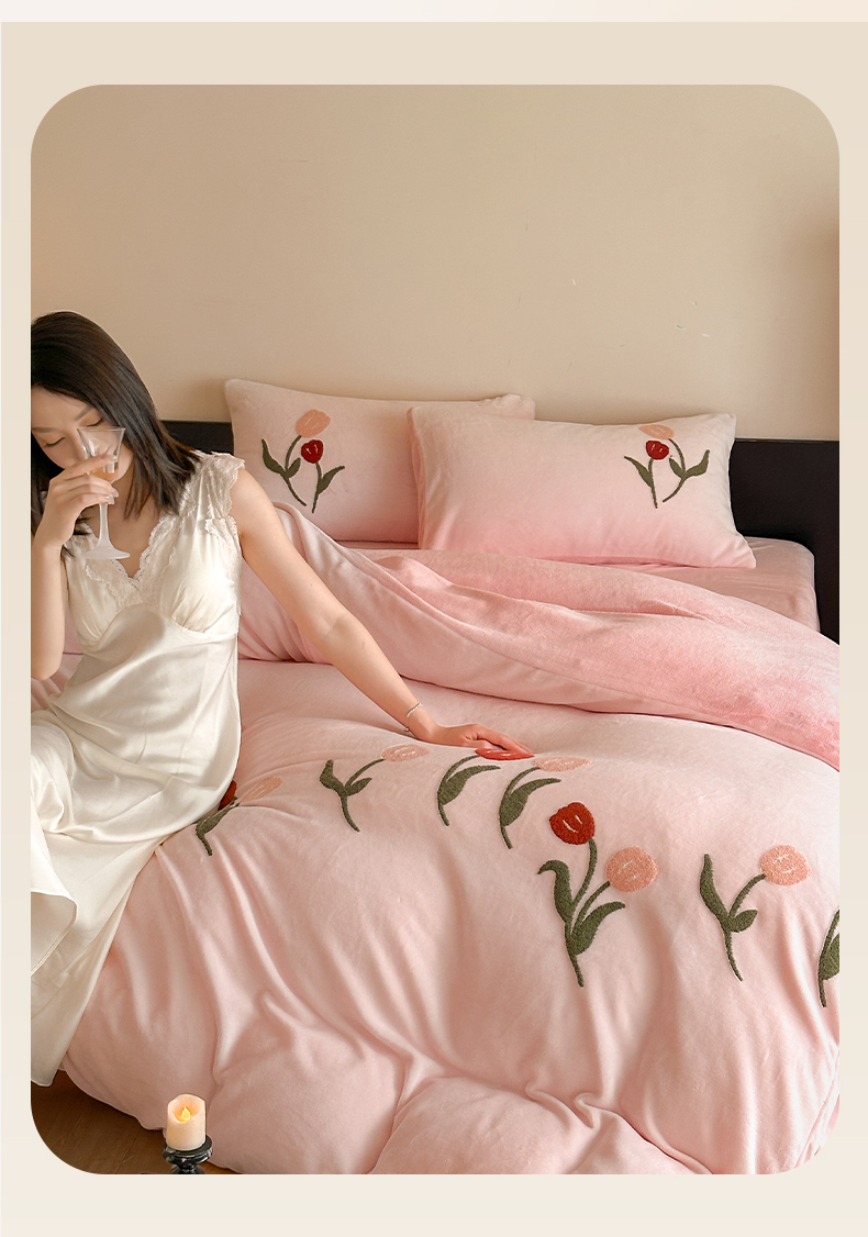 如一 2025新款田园风毛巾绣牛奶绒四件套 郁香-粉粉