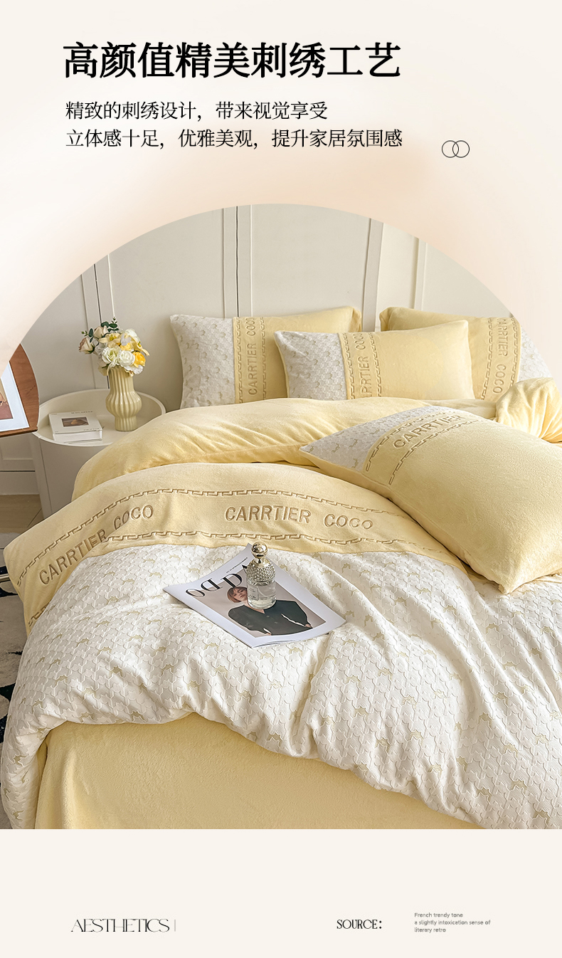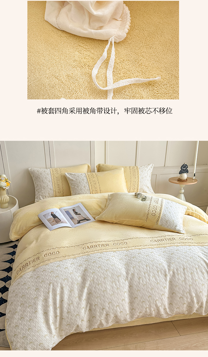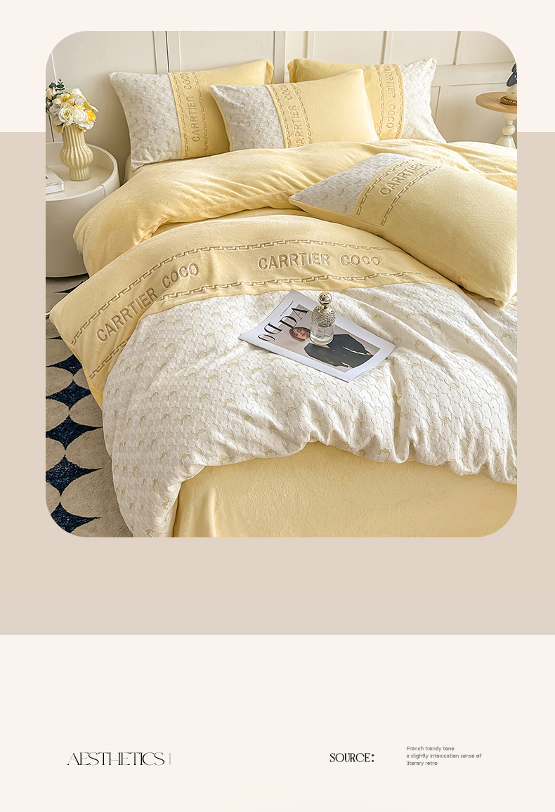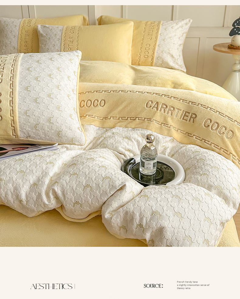 当前位置: 91家纺网 > 商品网购 > 床品套件 > 四件套 > 牛奶绒四件套 > 灰鲸 2025新款牛奶绒拼接刺绣雕花套件-贝娜 贝娜-奶黄
