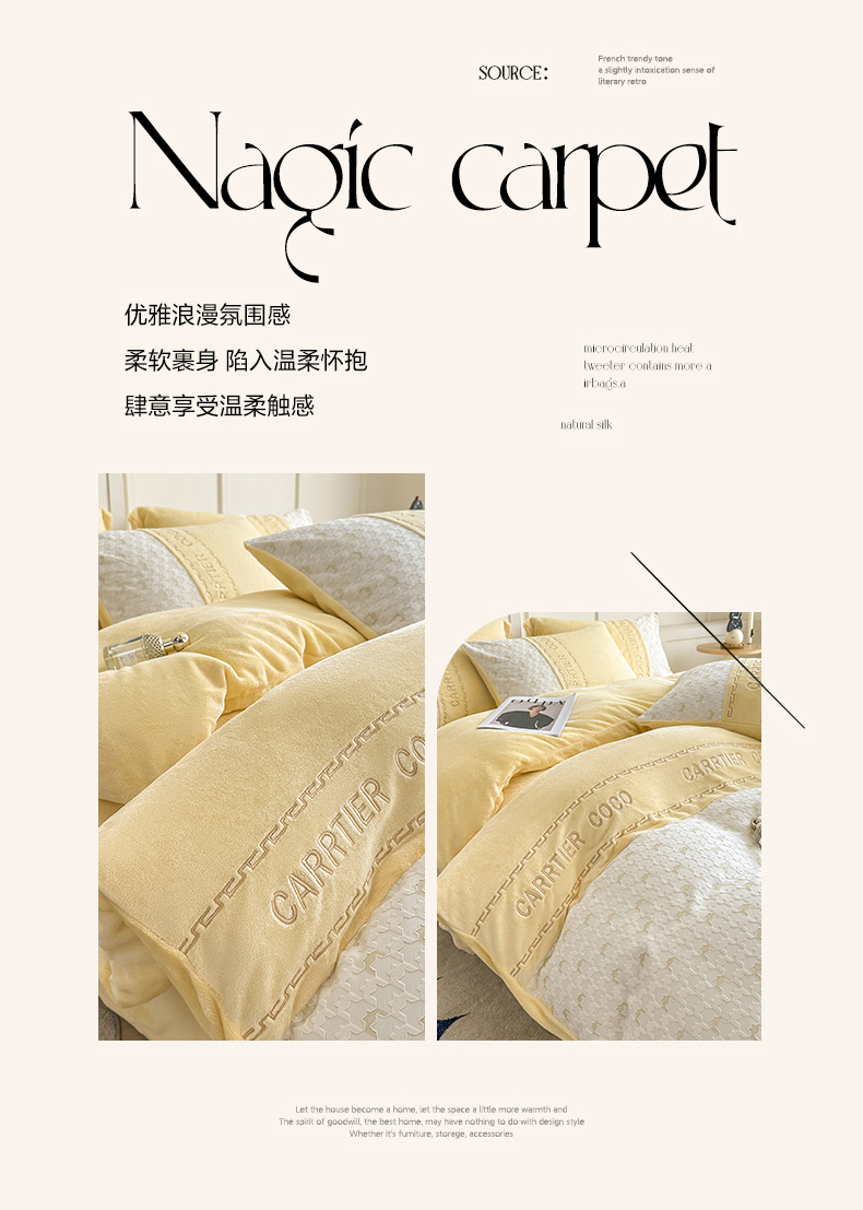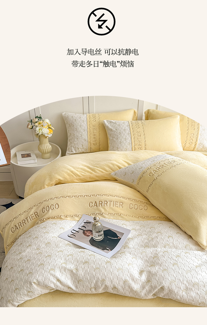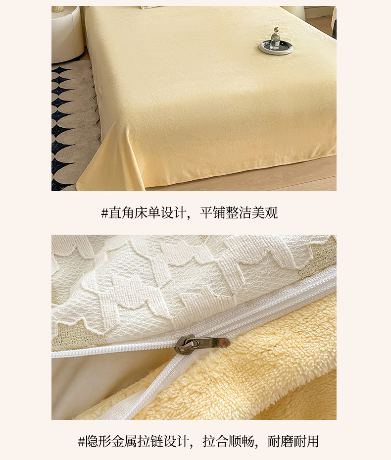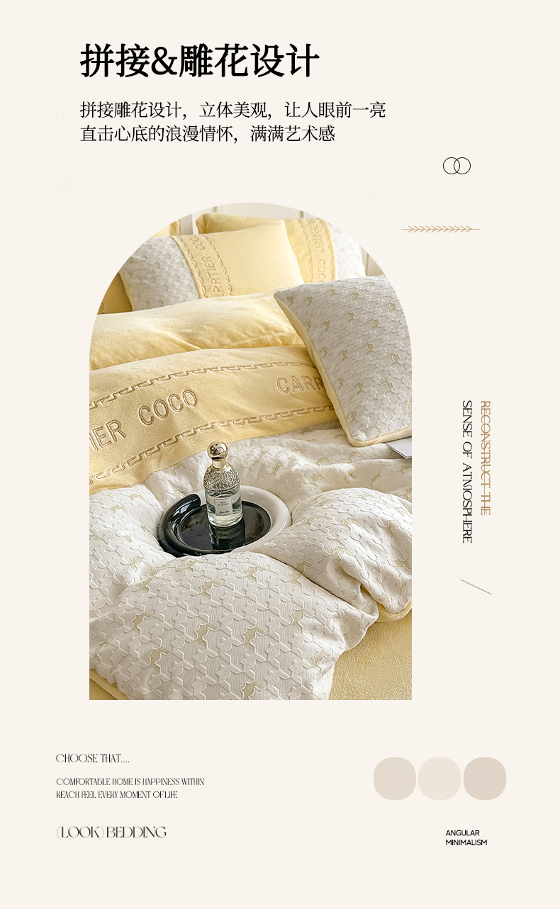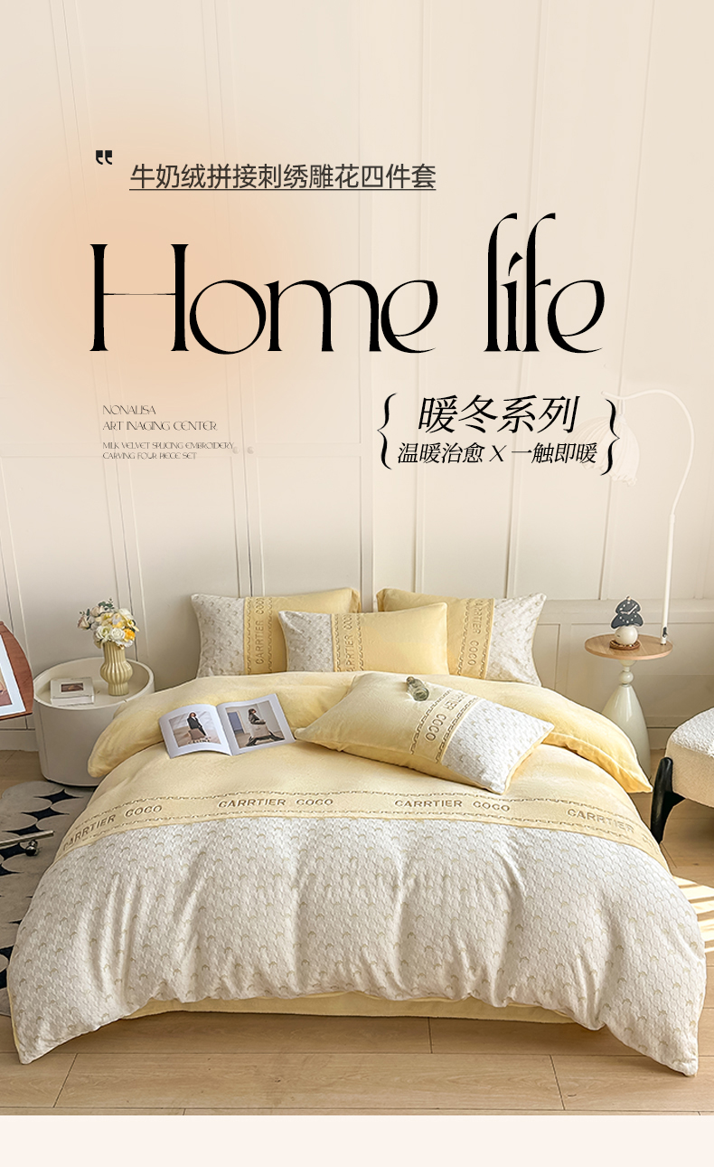 当前位置: 91家纺网 > 商品网购 > 床品套件 > 四件套 > 牛奶绒四件套 > 灰鲸 2025新款牛奶绒拼接刺绣雕花套件-贝娜 贝娜-奶黄