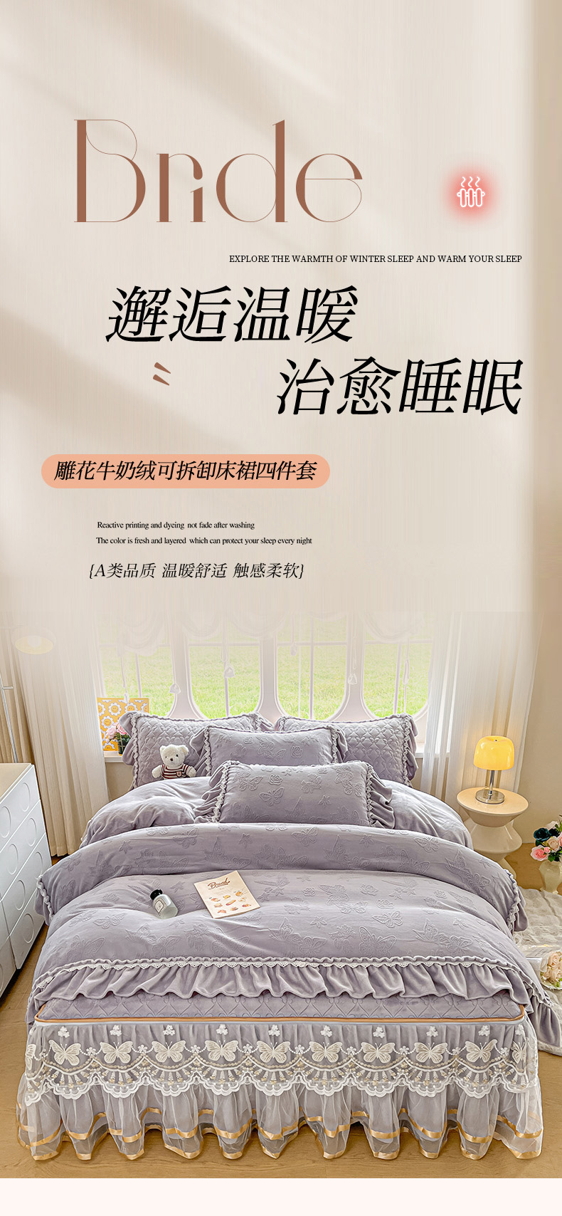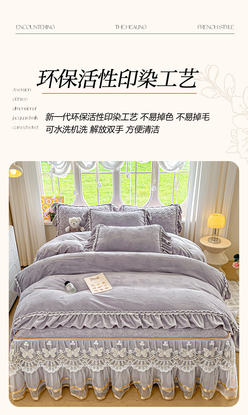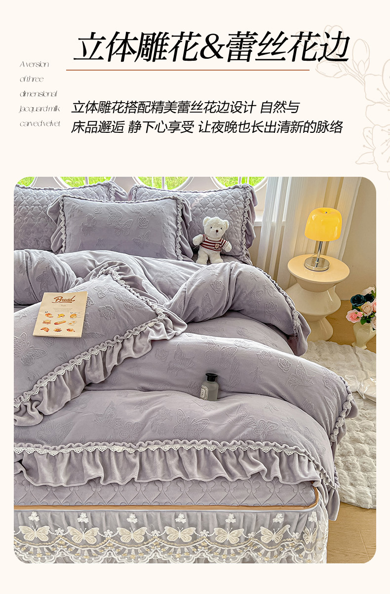 当前位置: 91家纺网 > 商品网购 > 床品套件 > 四件套 > 其它四件套 > 罗艺轩 2025新款简约雕花牛奶绒可拆卸床裙四件套蝶恋(已申专版,严格控价) 蝶恋-灰