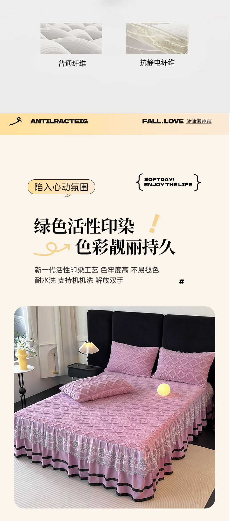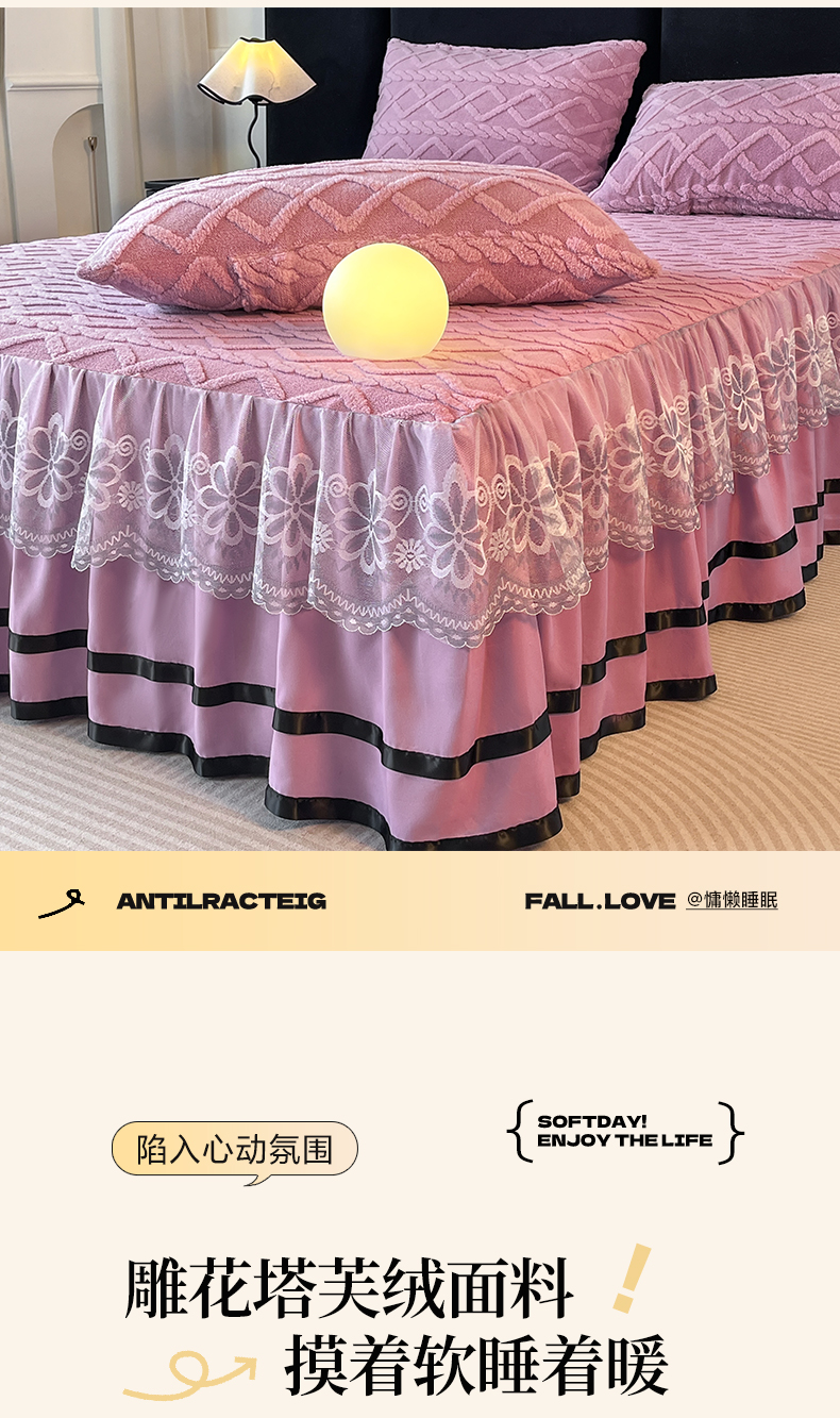 • 91家纺网 家纺一手货源 找家纺 米瑞娜 2025新款塔芙绒床裙三件套雕花绒蕾丝跨境单床裙外贸现货尺寸齐全 马尾型-浅紫