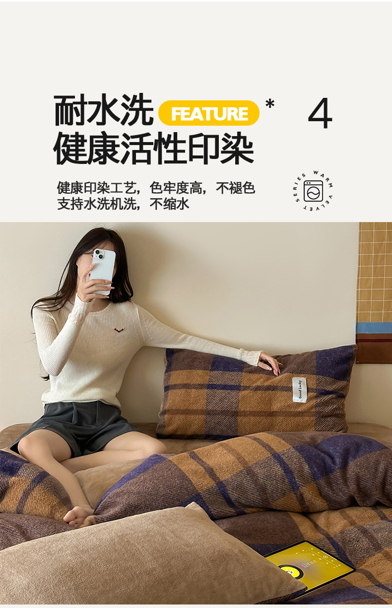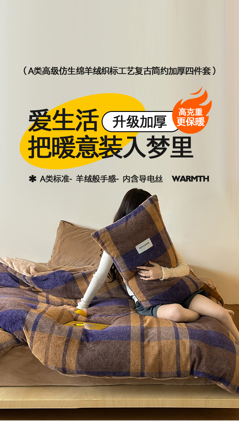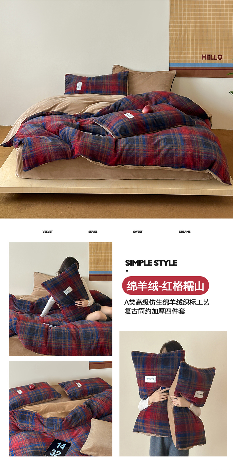 商品名称:桃子家居 2025新款A类高级仿生绵羊绒织标工艺复古简约秋冬限定款加厚牛奶绒系列四件套 绵羊绒-月紫橙
