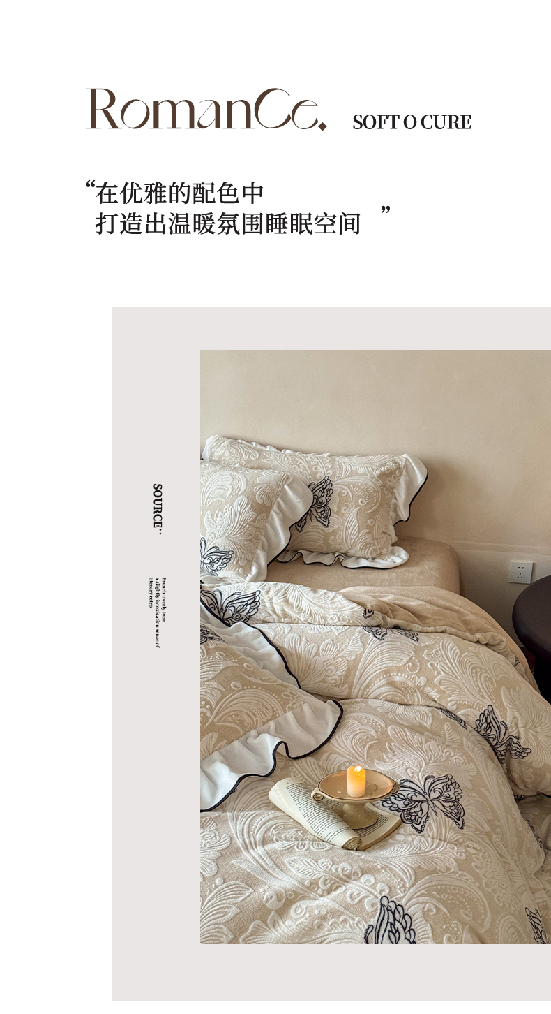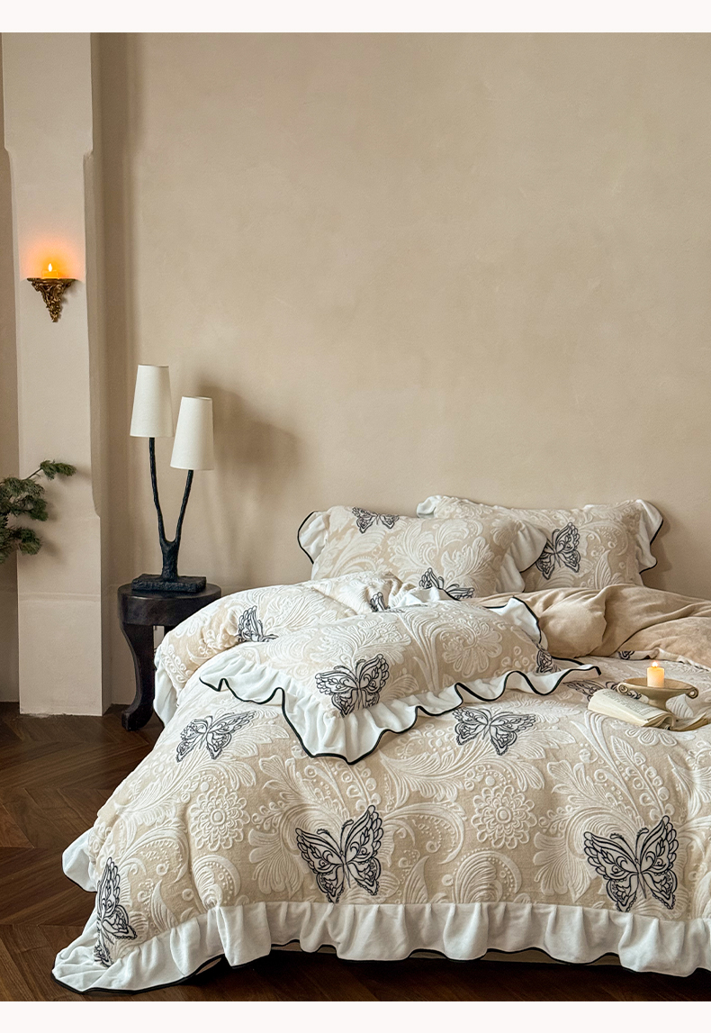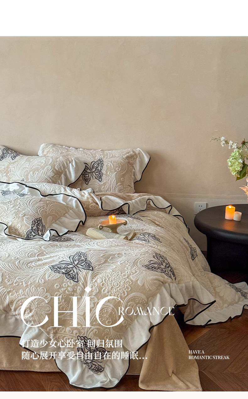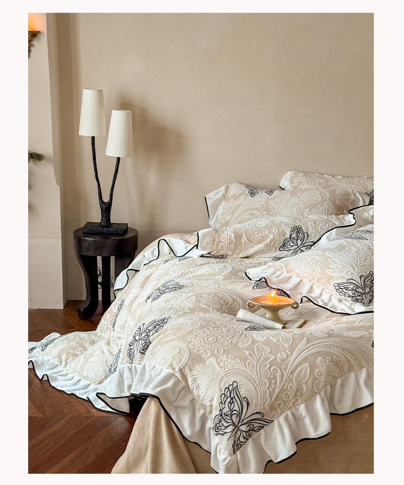 商品名称:(总)凯儿家纺 2025新款全消光牛奶绒法式公主风花边工艺款四件套-蝴蝶恋曲