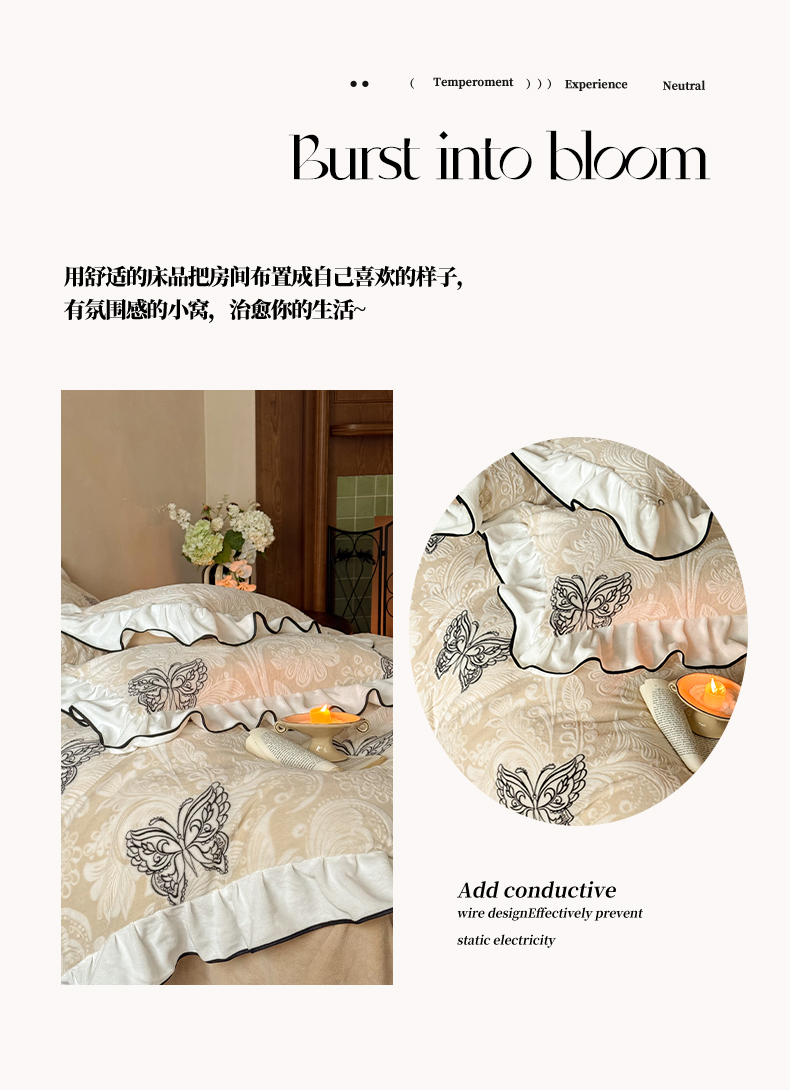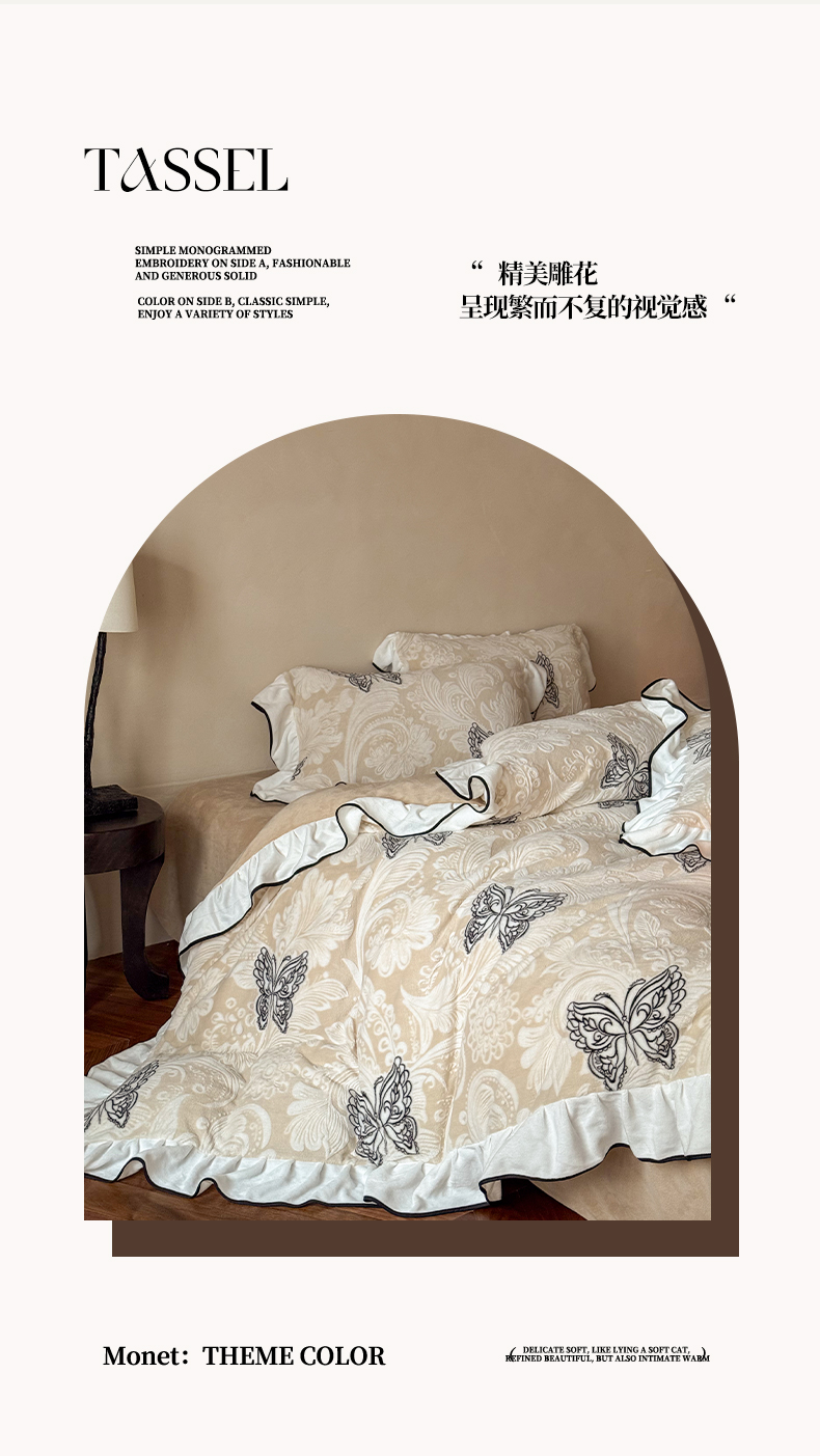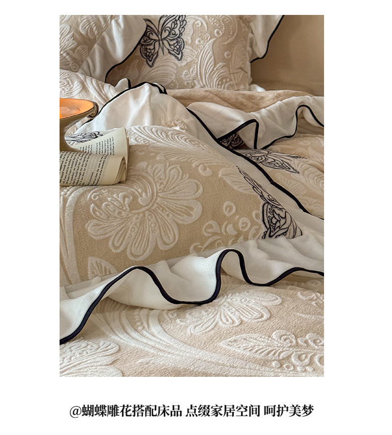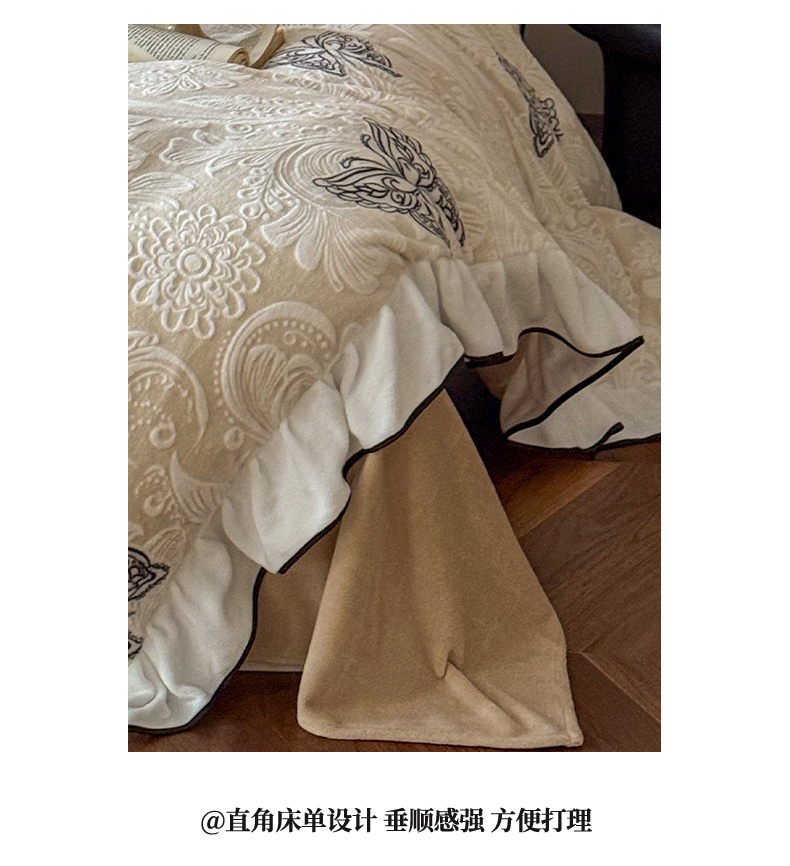 商品名称:(总)凯儿家纺 2025新款全消光牛奶绒法式公主风花边工艺款四件套-蝴蝶恋曲