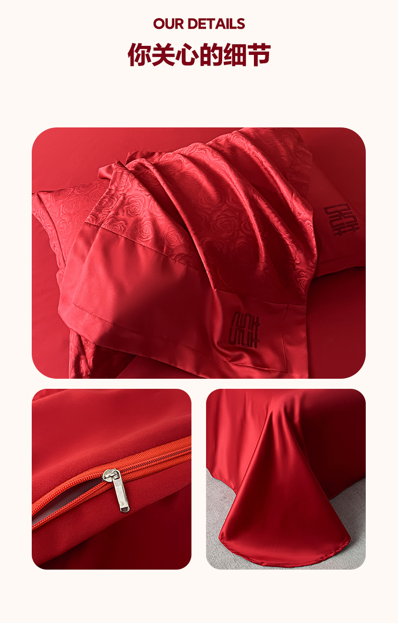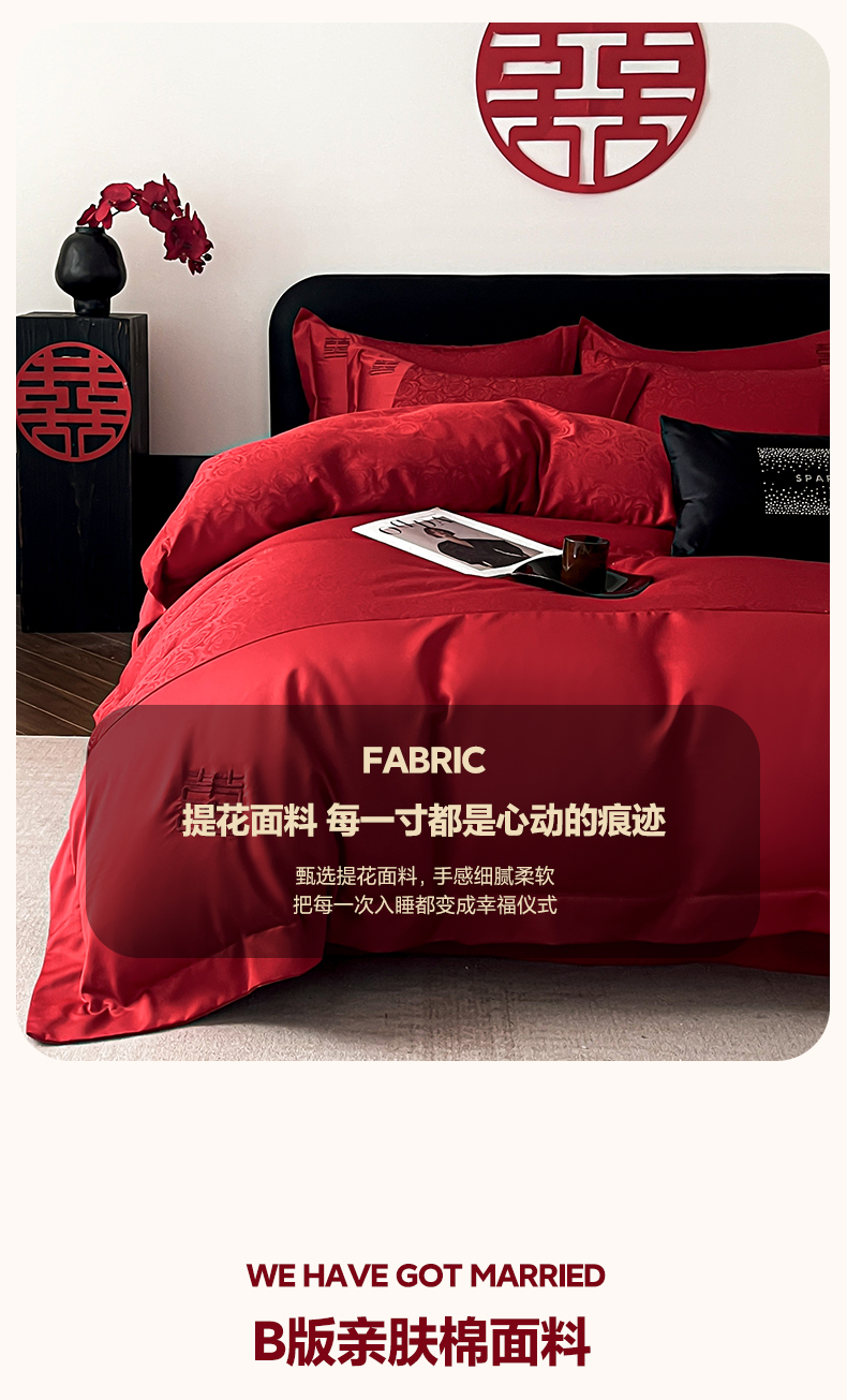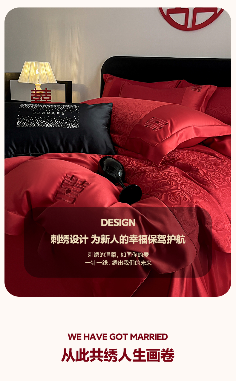 (总)欧乐蒂 2025新款高支高密提花婚庆四件套,龙凤美满,玫瑰情缘,双囍-红,双囍-金,叶叶情深
