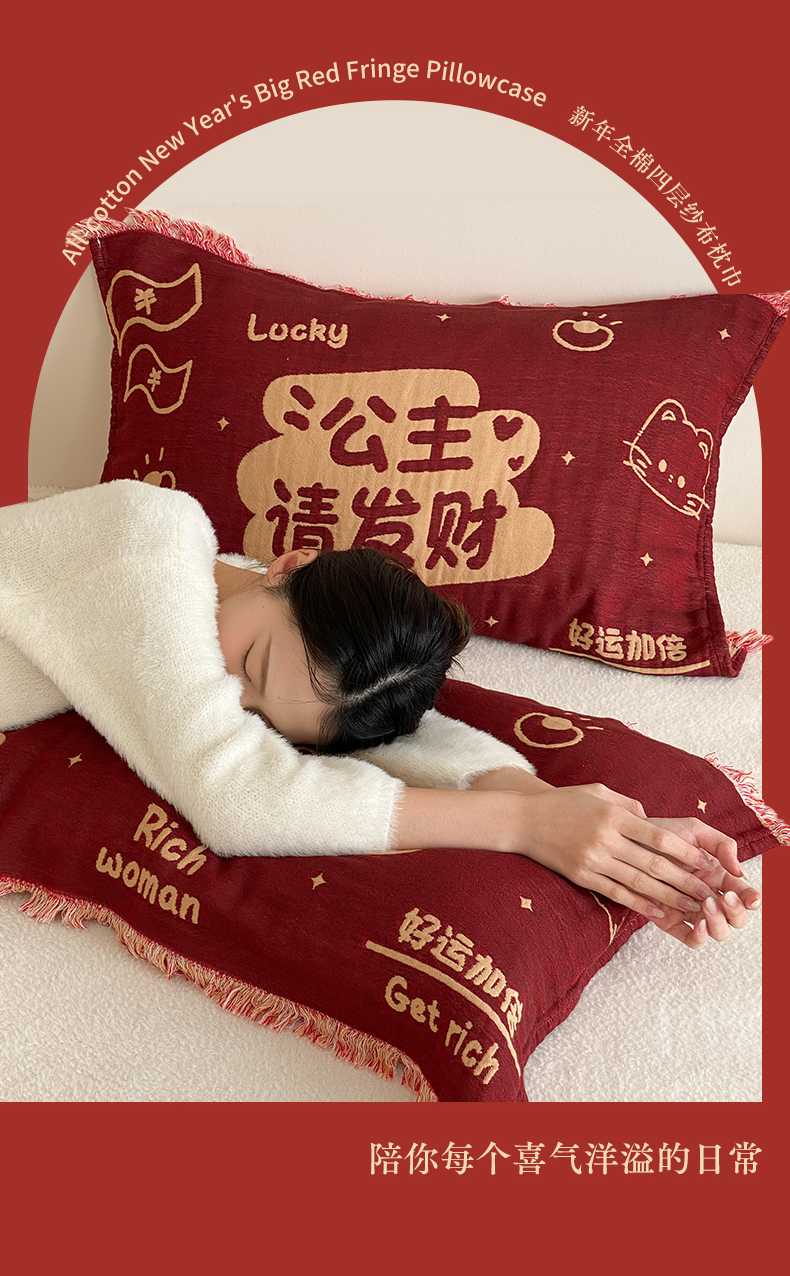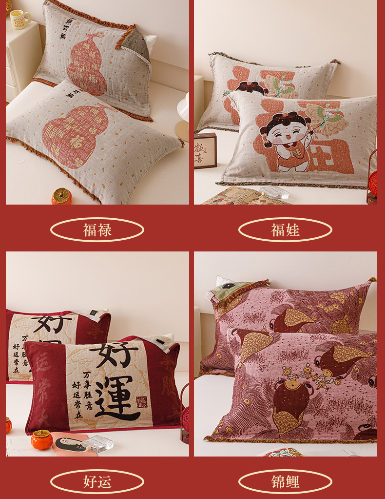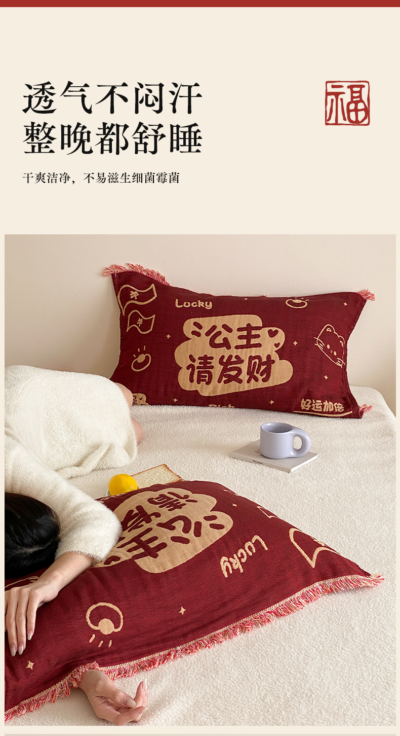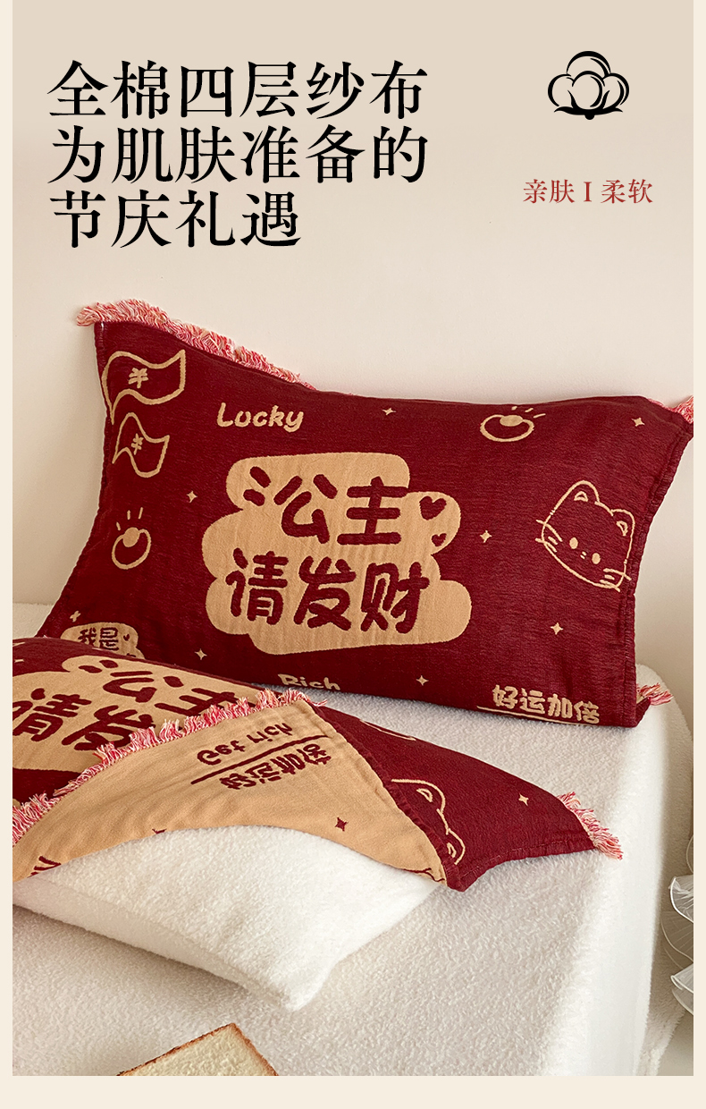(总)麻依 2025新款四层纱布全棉新年大红枕巾流苏婚庆枕盖,八方来财,发财暴富,福禄,福气满满,福娃,公主发财,好运,锦鲤,马上有钱,平安喜乐,圣诞小猫,新年快乐,组合
