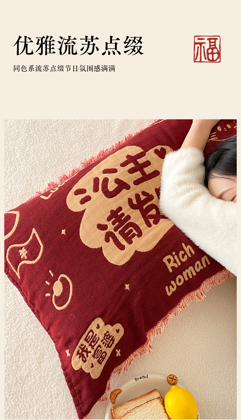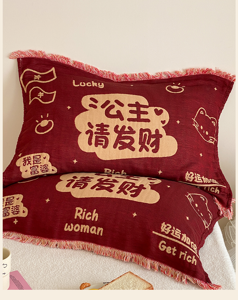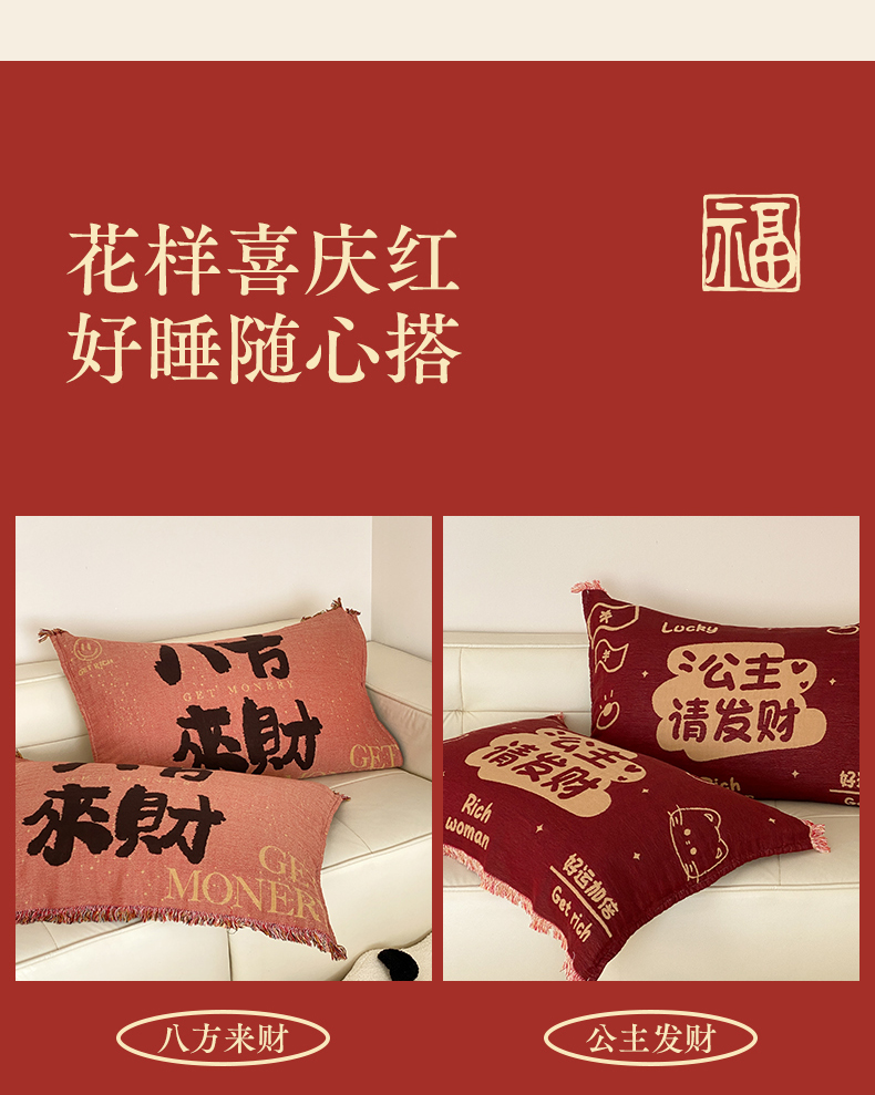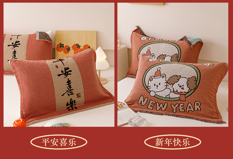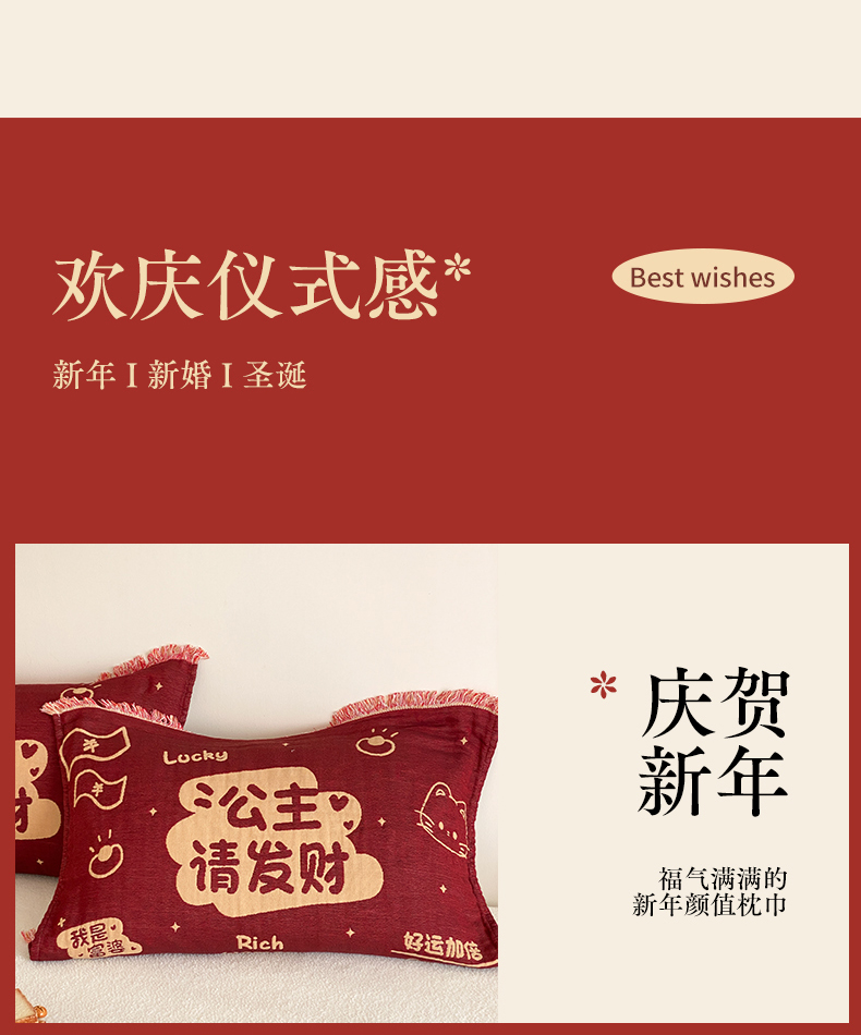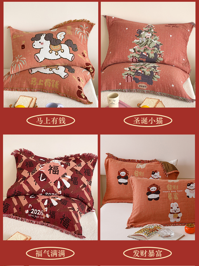 (总)麻依 2025新款四层纱布全棉新年大红枕巾流苏婚庆枕盖,八方来财,发财暴富,福禄,福气满满,福娃,公主发财,好运,锦鲤,马上有钱,平安喜乐,圣诞小猫,新年快乐,组合