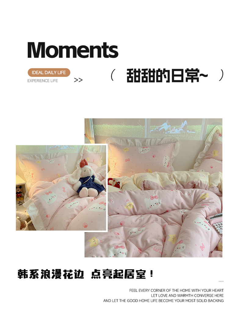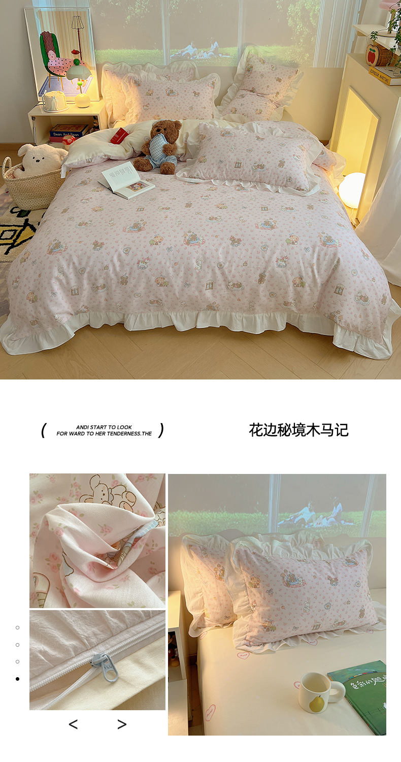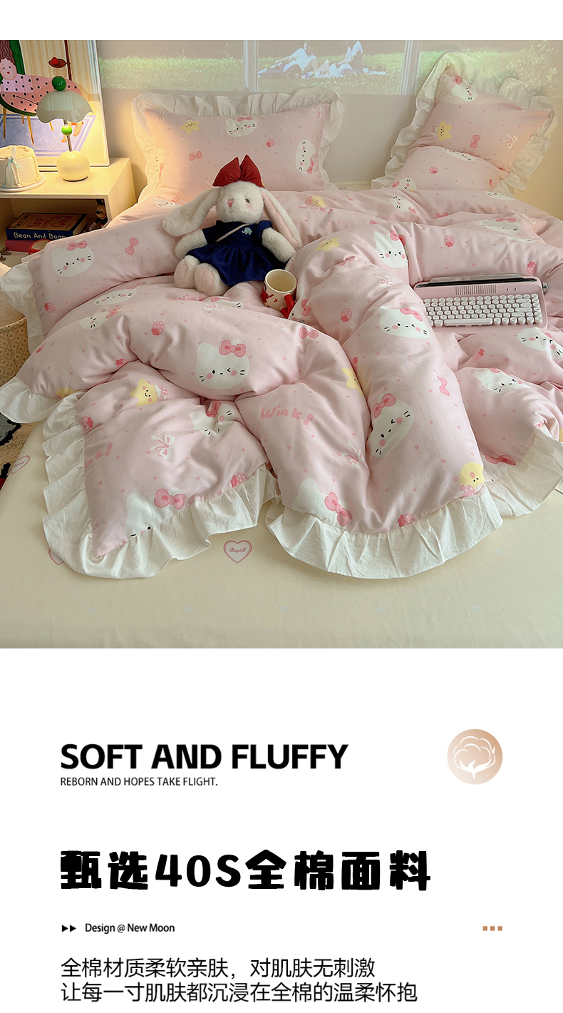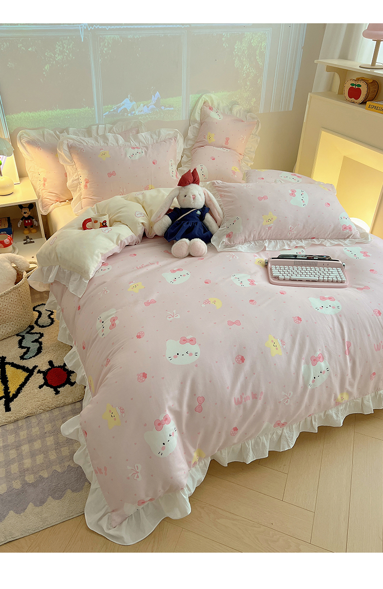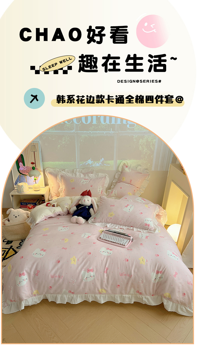 商品名称:六巷胡同 2026春夏新款韩系花边款卡通全棉四件套(第二系列)风格一 花边粉爱心喵喵