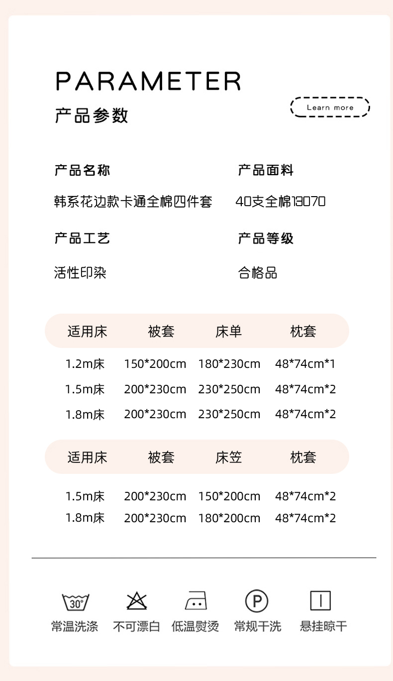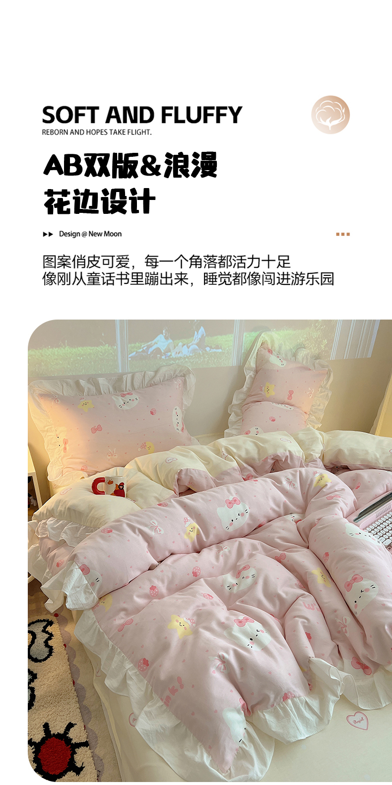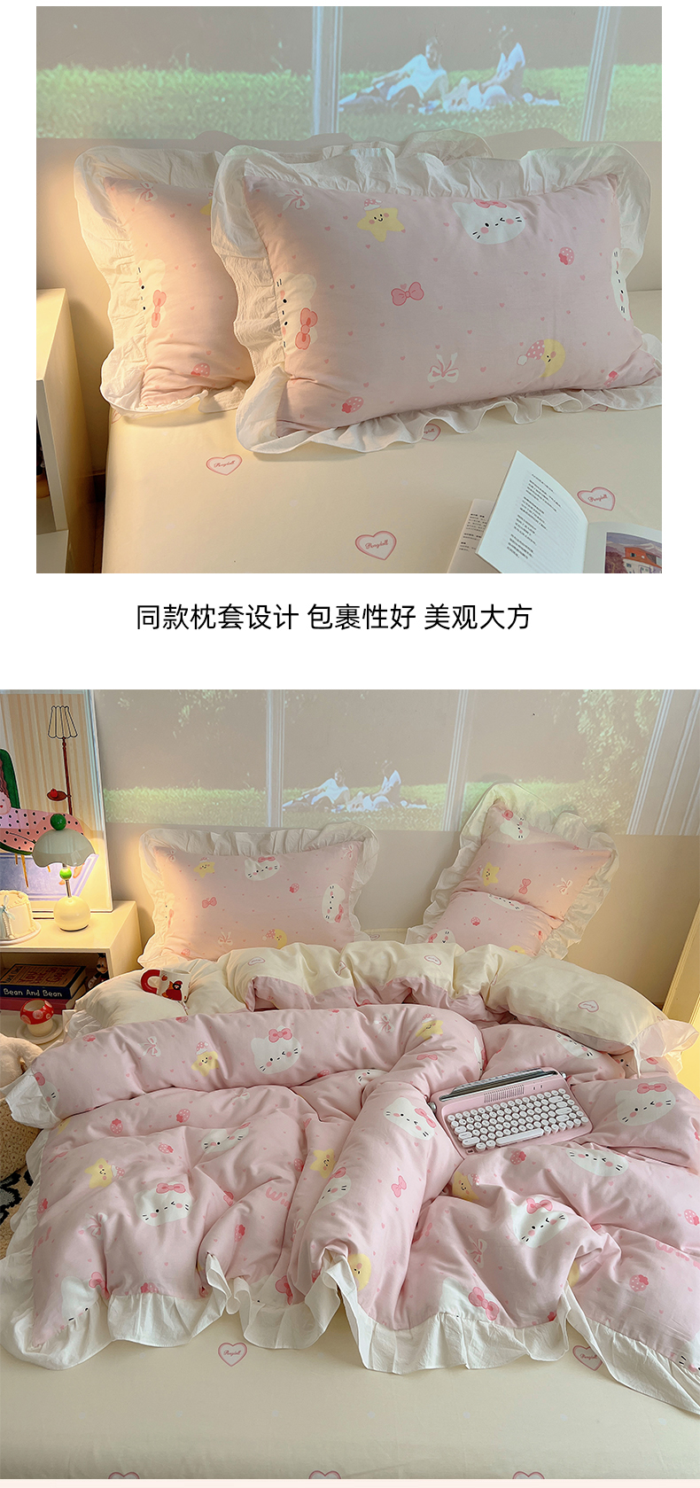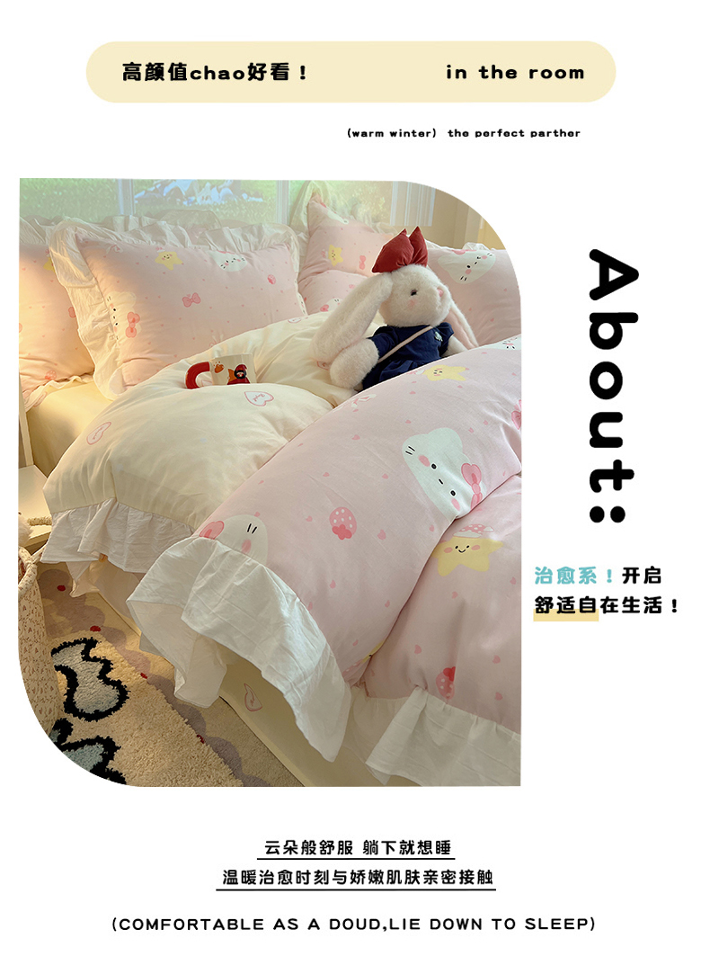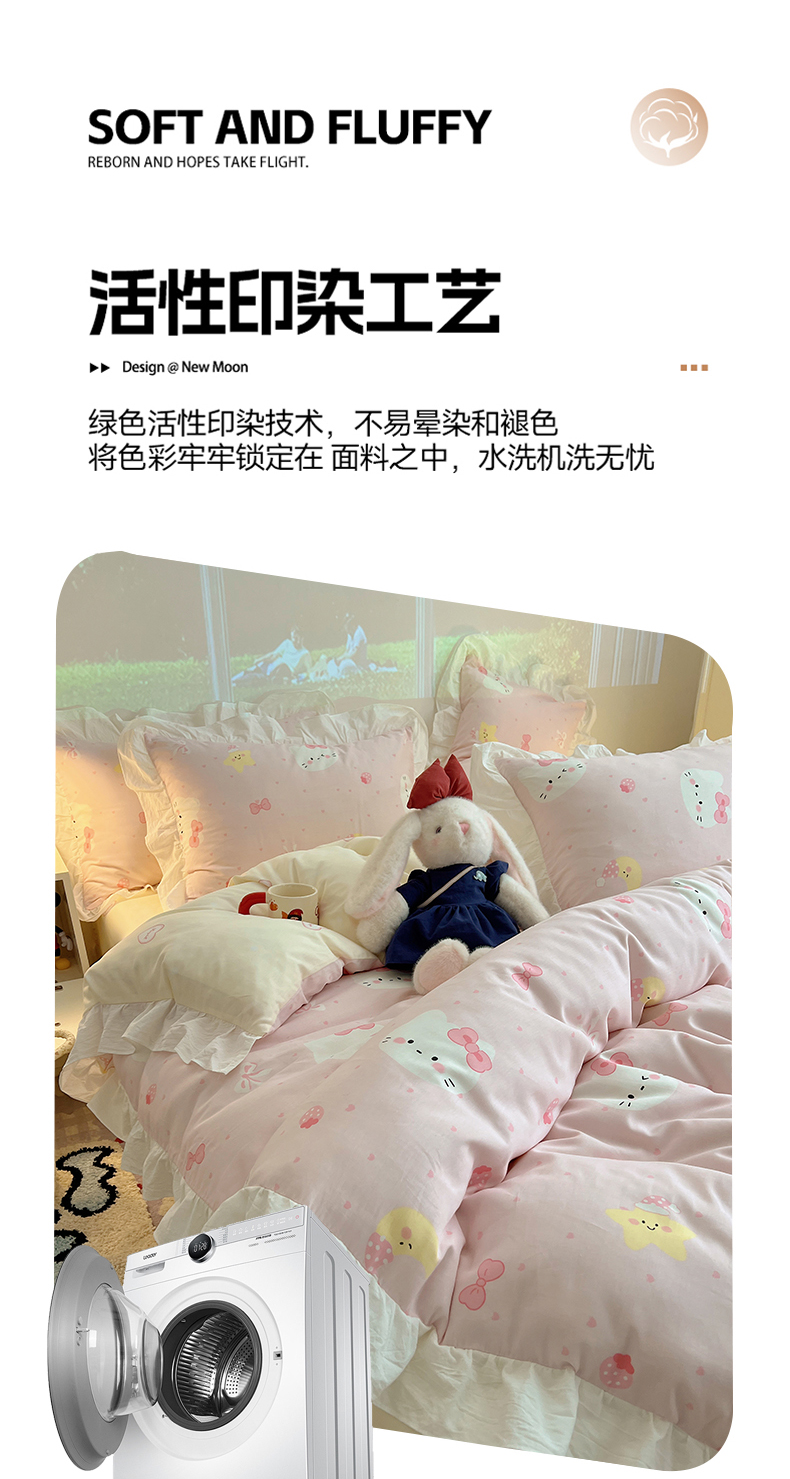 商品名称:六巷胡同 2026春夏新款韩系花边款卡通全棉四件套(第二系列)风格一 花边粉爱心喵喵