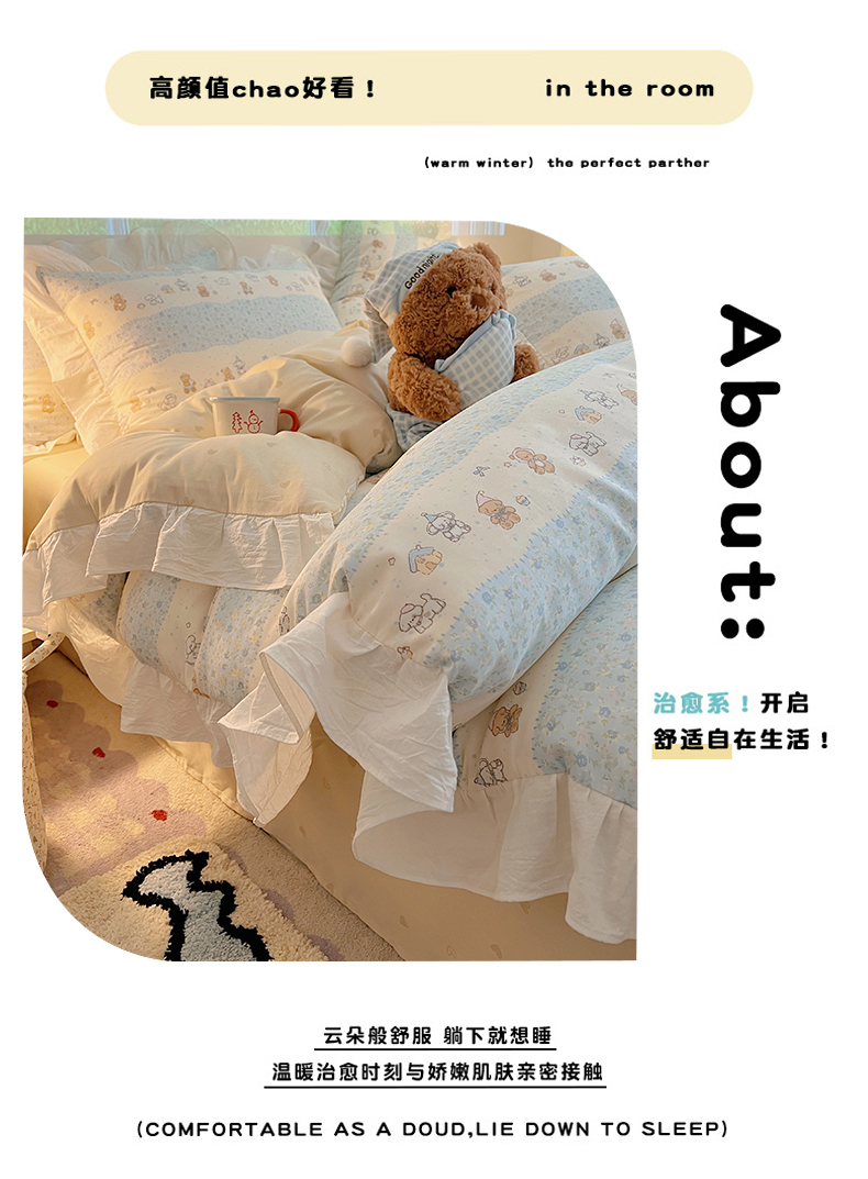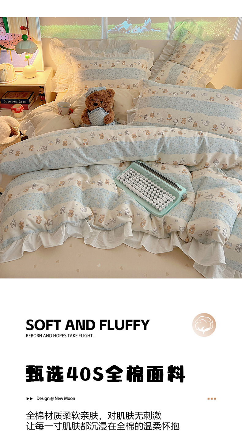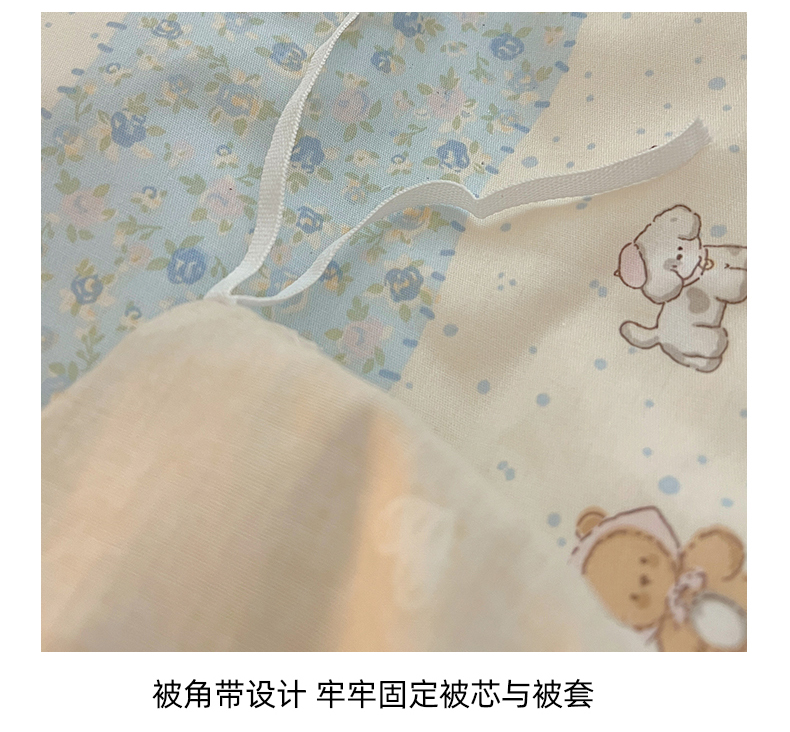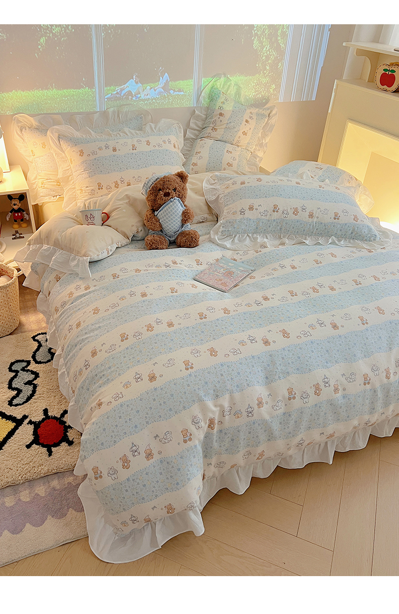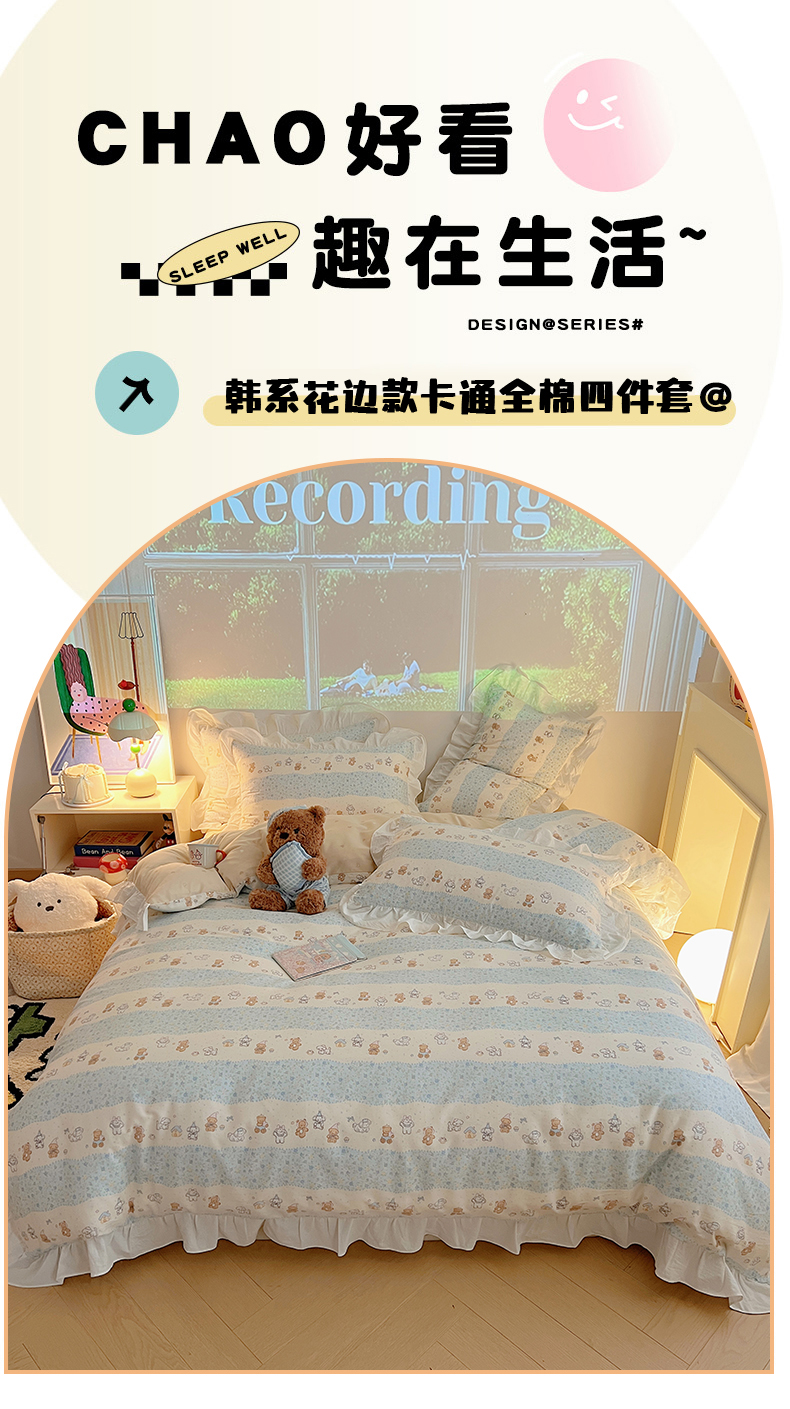 商品名称:六巷胡同 2026春夏新款韩系花边款卡通全棉四件套(第二系列)风格一 花边熊友赏花集
