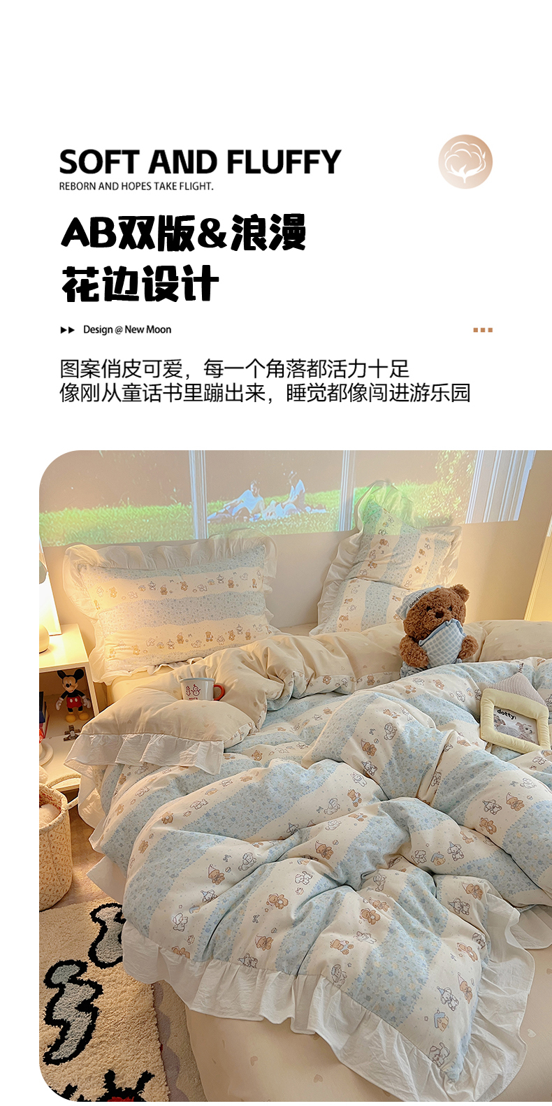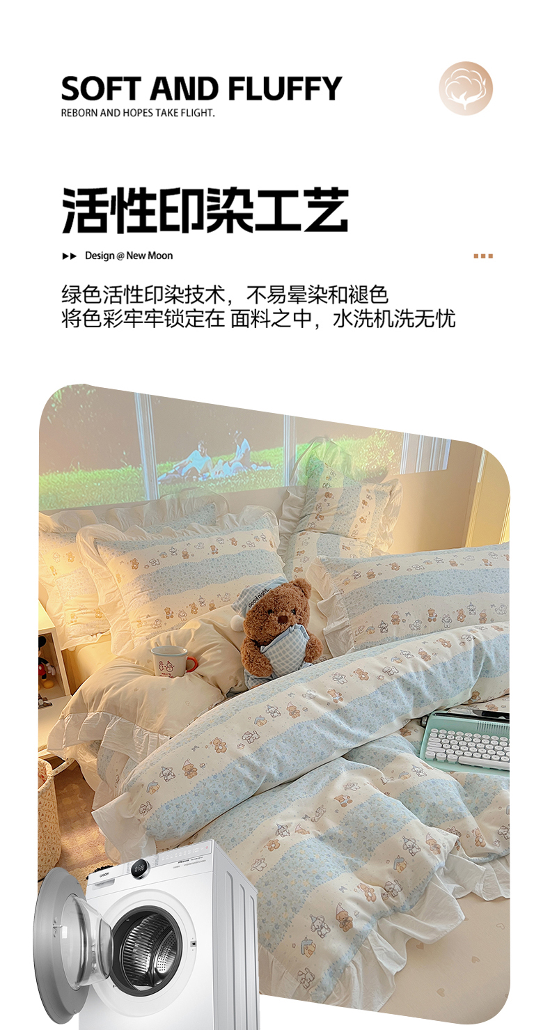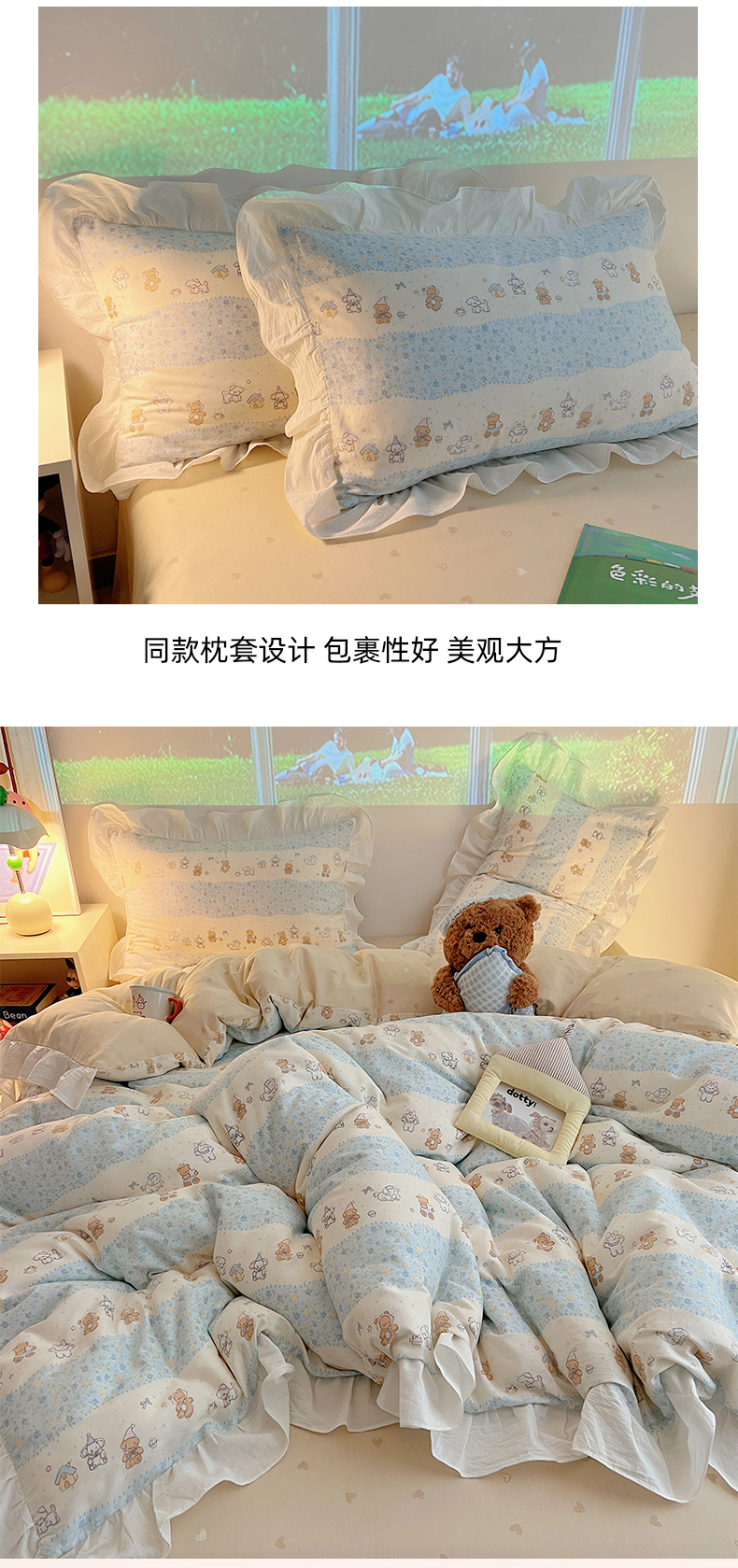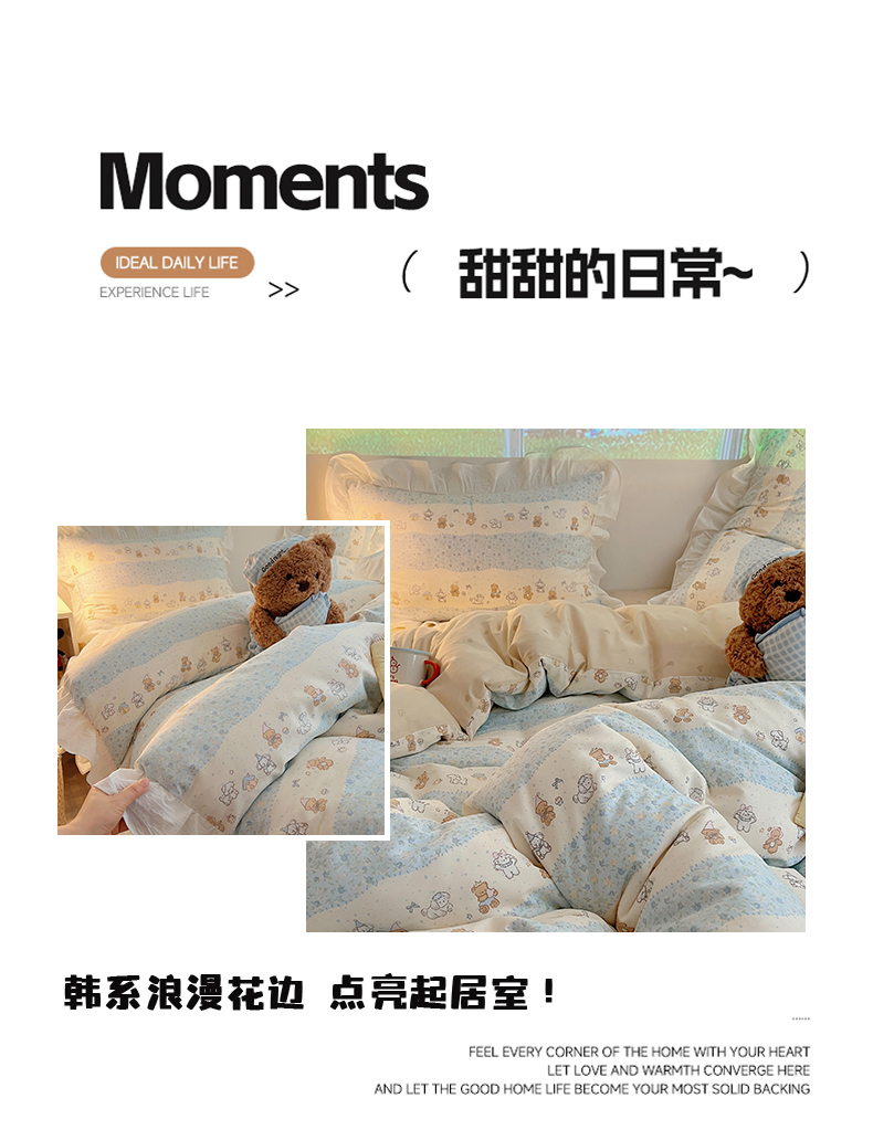 商品名称:六巷胡同 2026春夏新款韩系花边款卡通全棉四件套(第二系列)风格一 花边熊友赏花集
