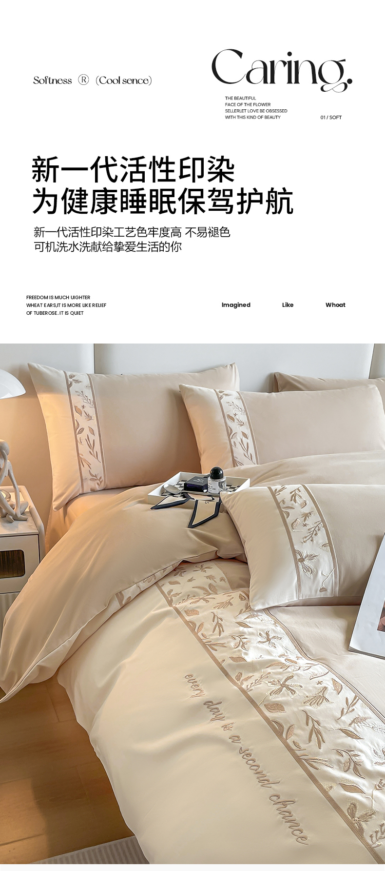 商品名称:欣宜家纺 2025新款纯棉全棉长绒棉磨毛绣花四件套花漾系列刺绣套件带礼盒 香槟金