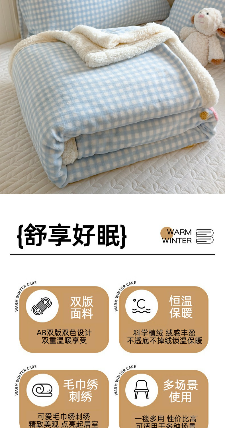 商品名称:欣宜家纺 2025新款加厚毛巾刺绣牛奶绒羊羔绒盖毯双层毛毯午休毯卡通多功能沙发办公室毯子 甜心米盖毯