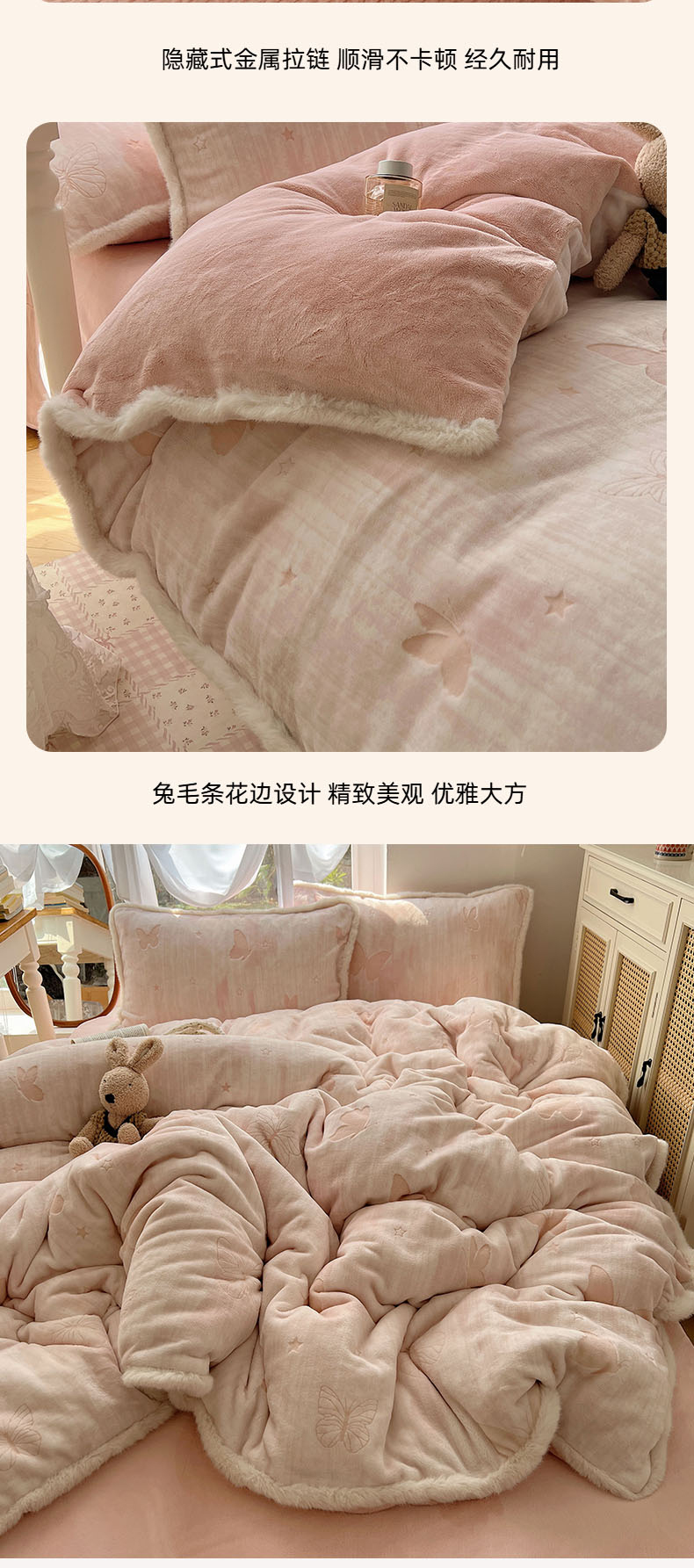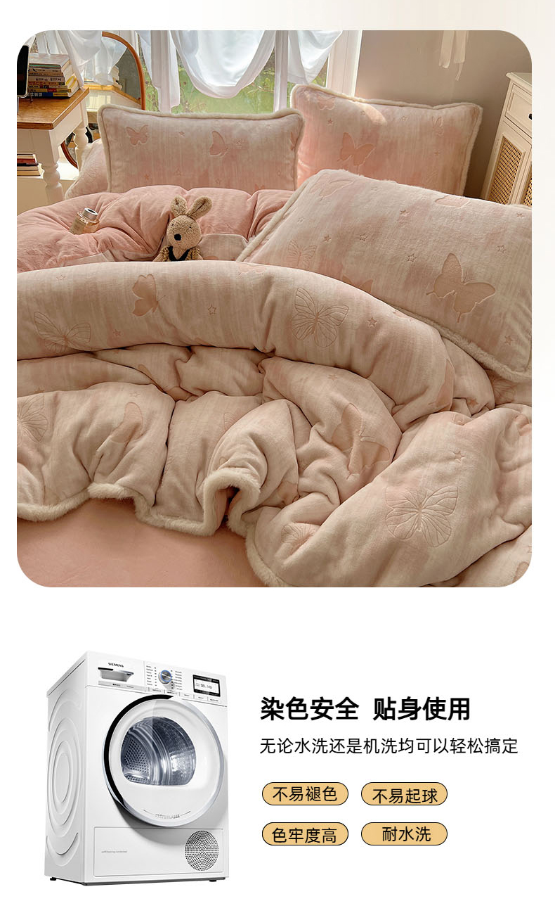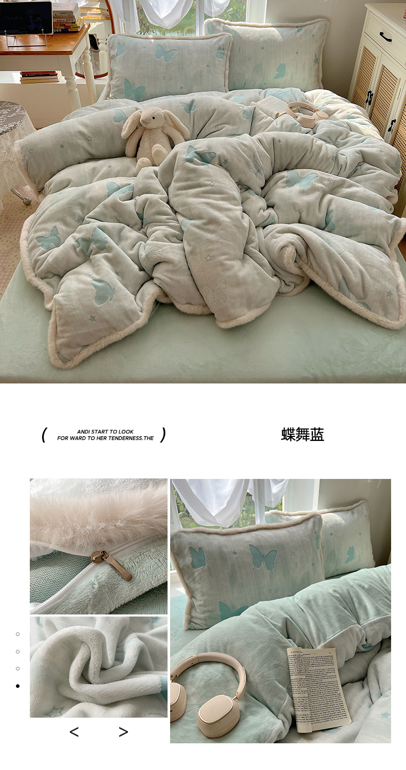 商品名称:欣宜家纺 2025秋冬新款加绒加厚兔毛花边款烂花雕花牛奶绒四件套 蝶舞蓝
