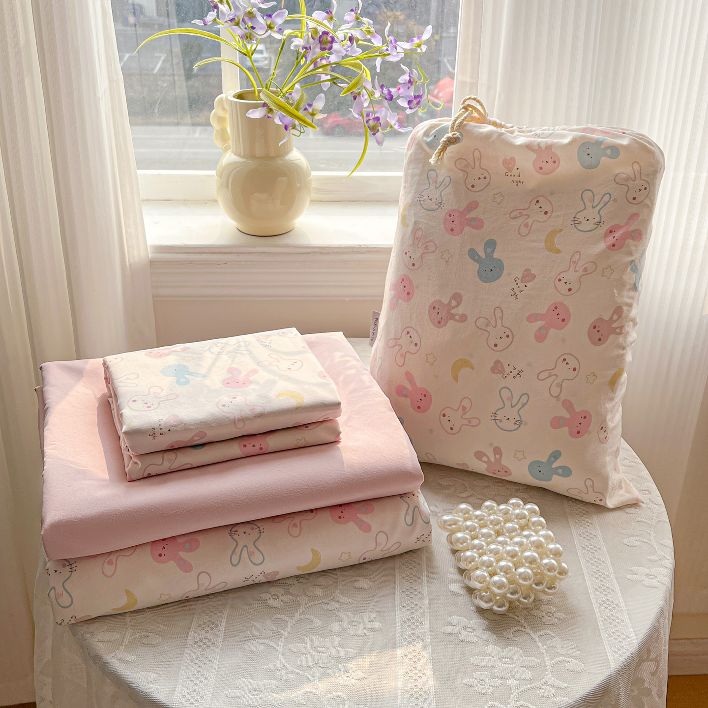 梦莱斯 2026新款A类古法水洗仿棉云感纱四件套 兔耳朵