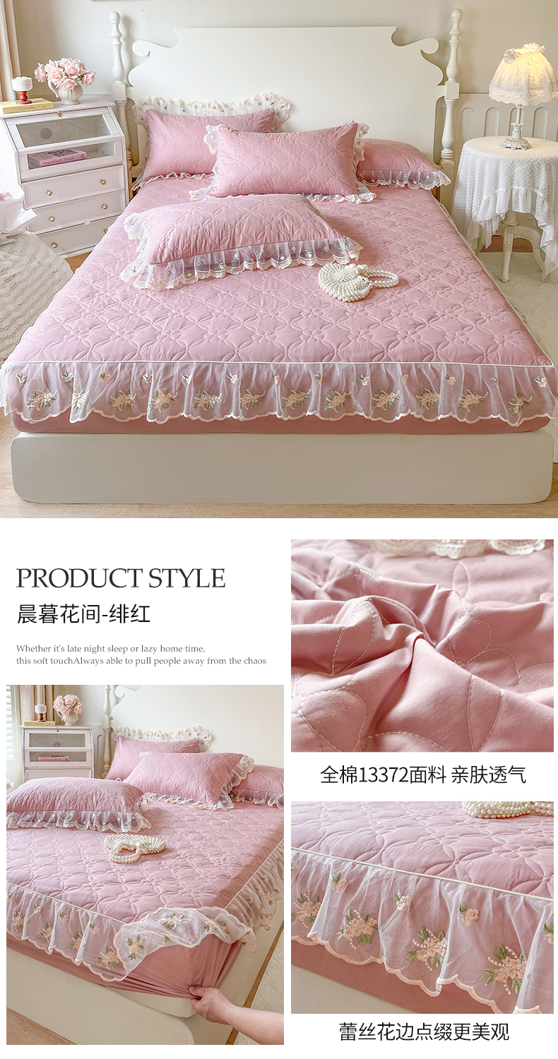 • 91家纺网 家纺一手货源 找家纺 (总)网红馆(ck家纺) 2026新款全棉蕾丝花边床裙款床笠晨暮花间系列,绯红,粉色,麦绿,米色,浅紫,雾蓝