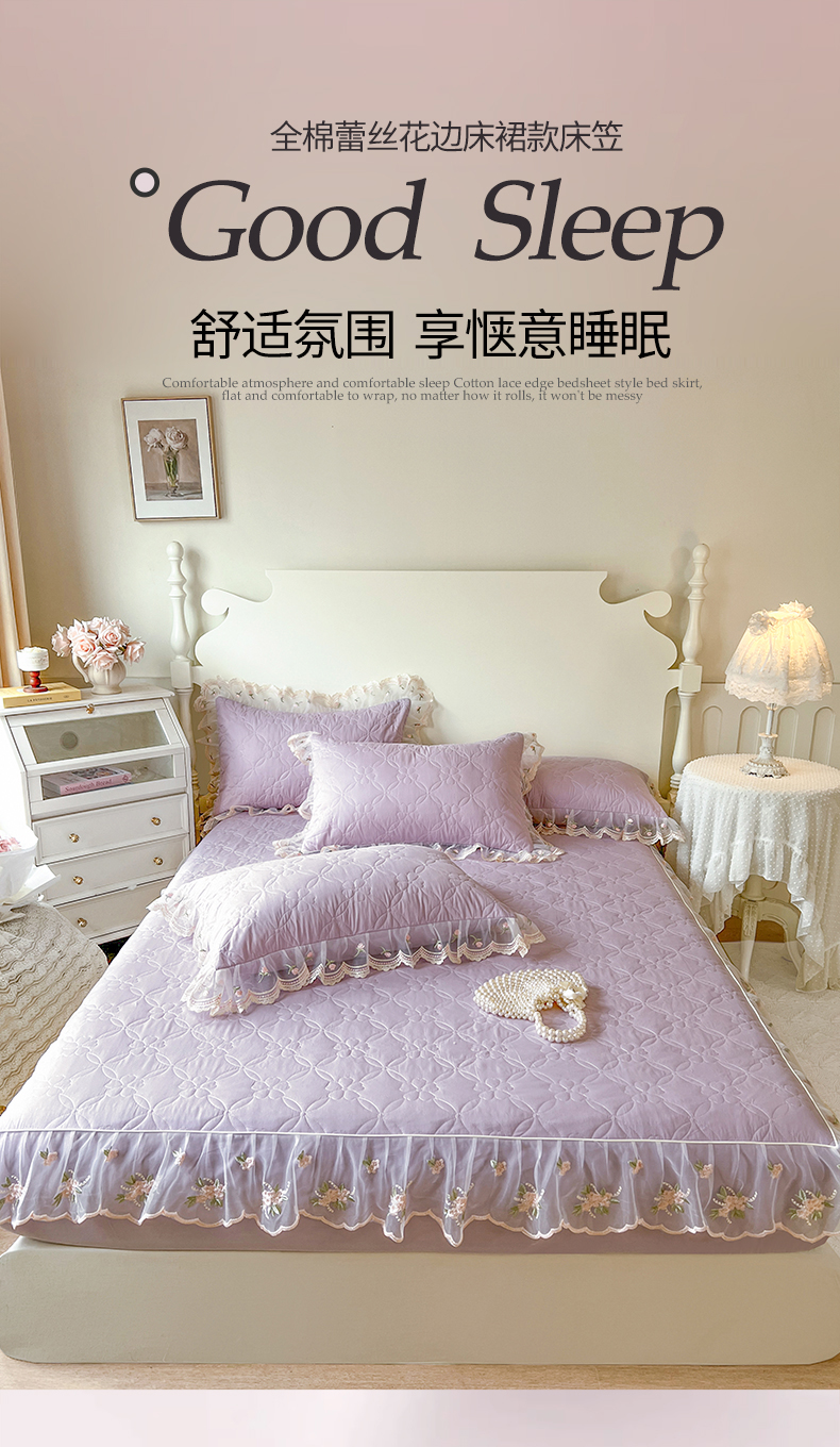 网红馆(ck家纺) 2026新款全棉蕾丝花边床裙款床笠晨暮花间系列 浅紫