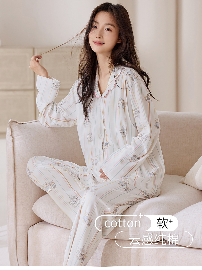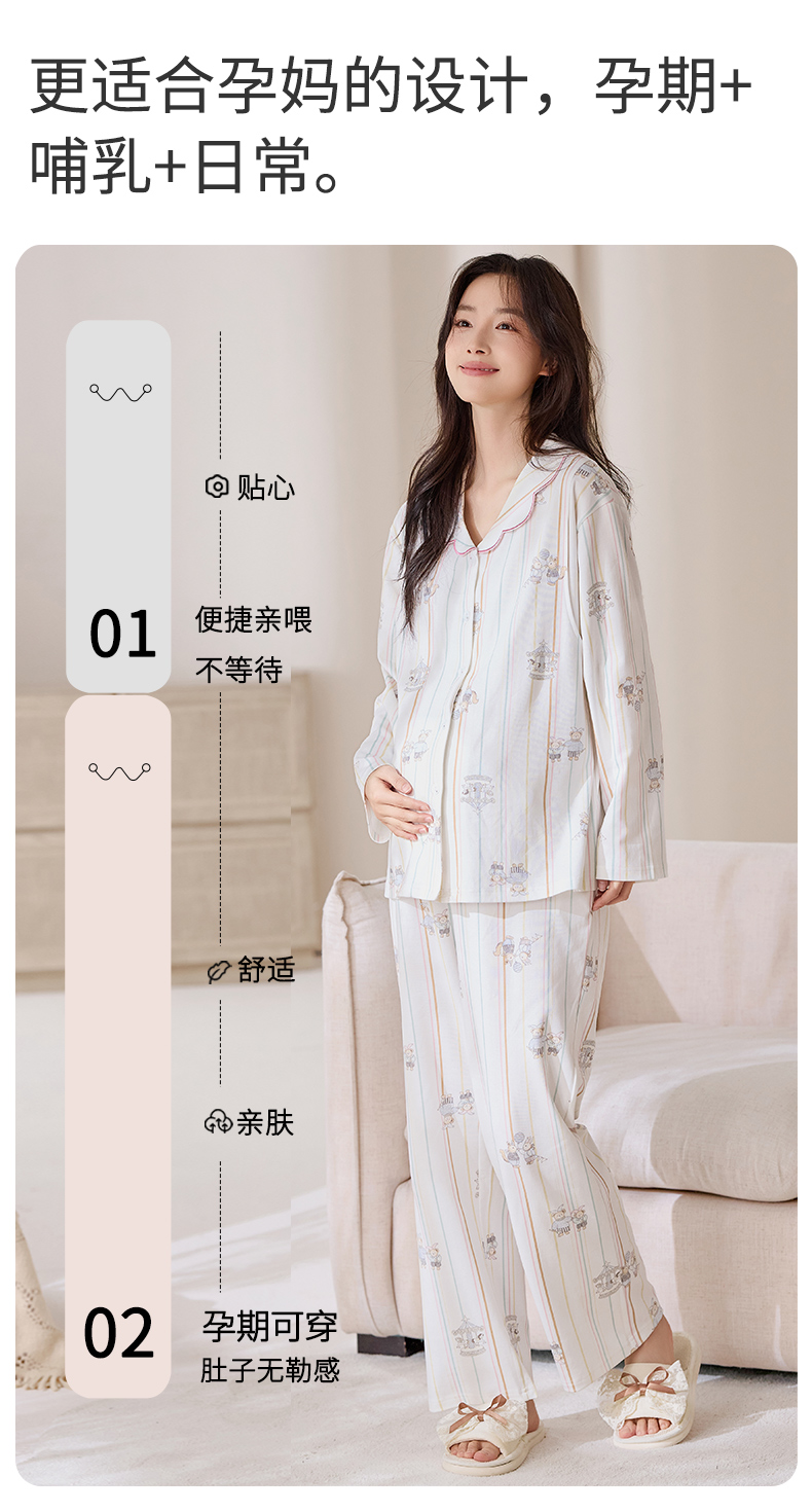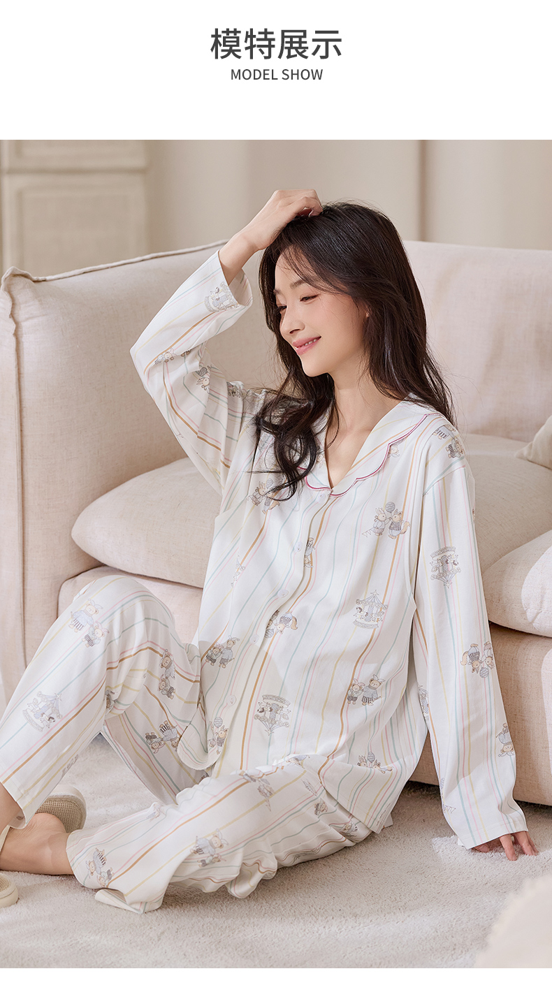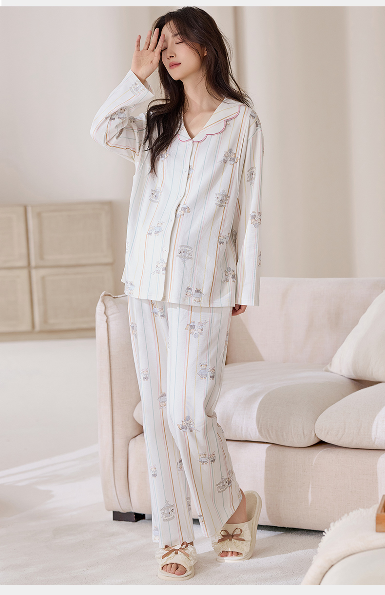 商品名称:洛兰沙家居馆 2026春秋季新款小清新针织全棉纯棉100%翻领开衫双长孕妇月子服睡衣女 翻领套装1