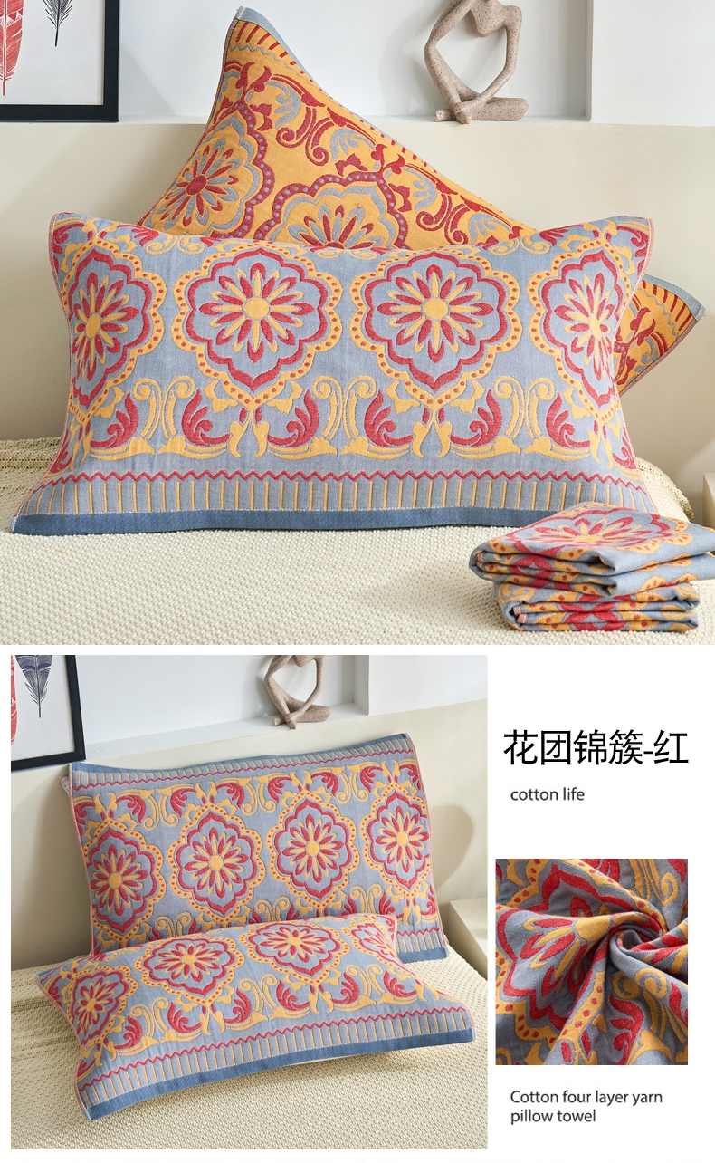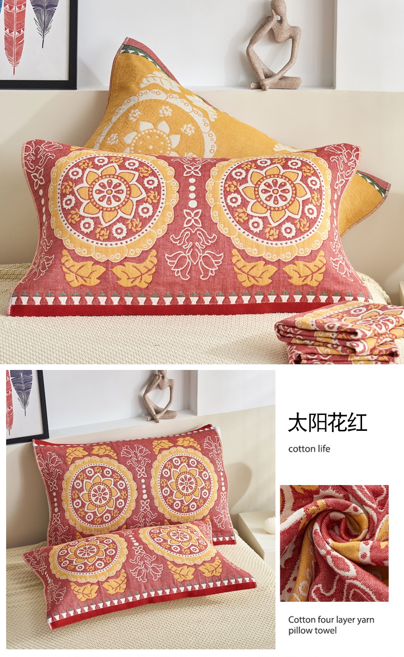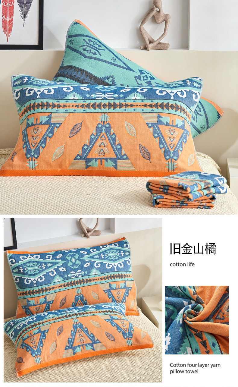 商品名称:朴尔家纺-毛巾被 2026新款民族风彩棉系列四层纱布枕巾 大丽花橘
